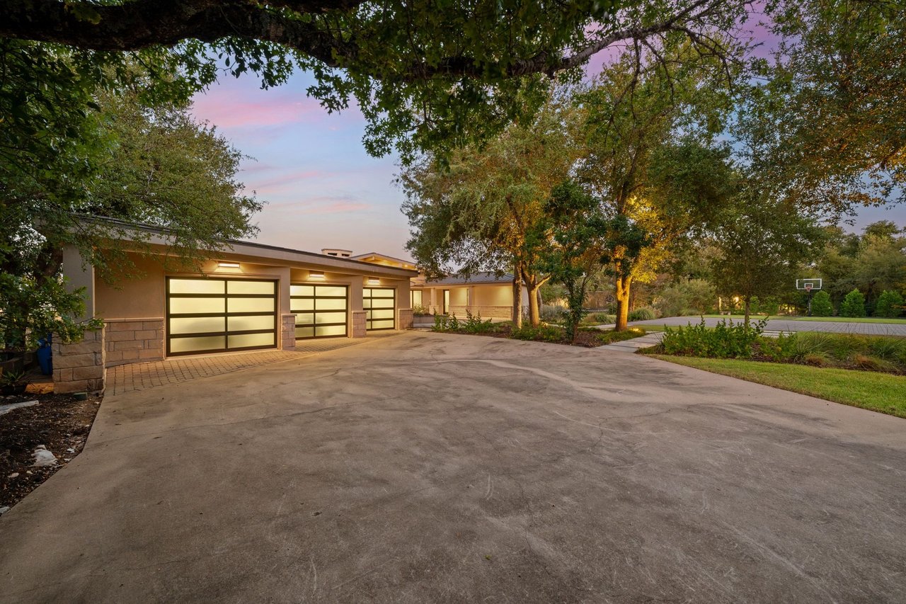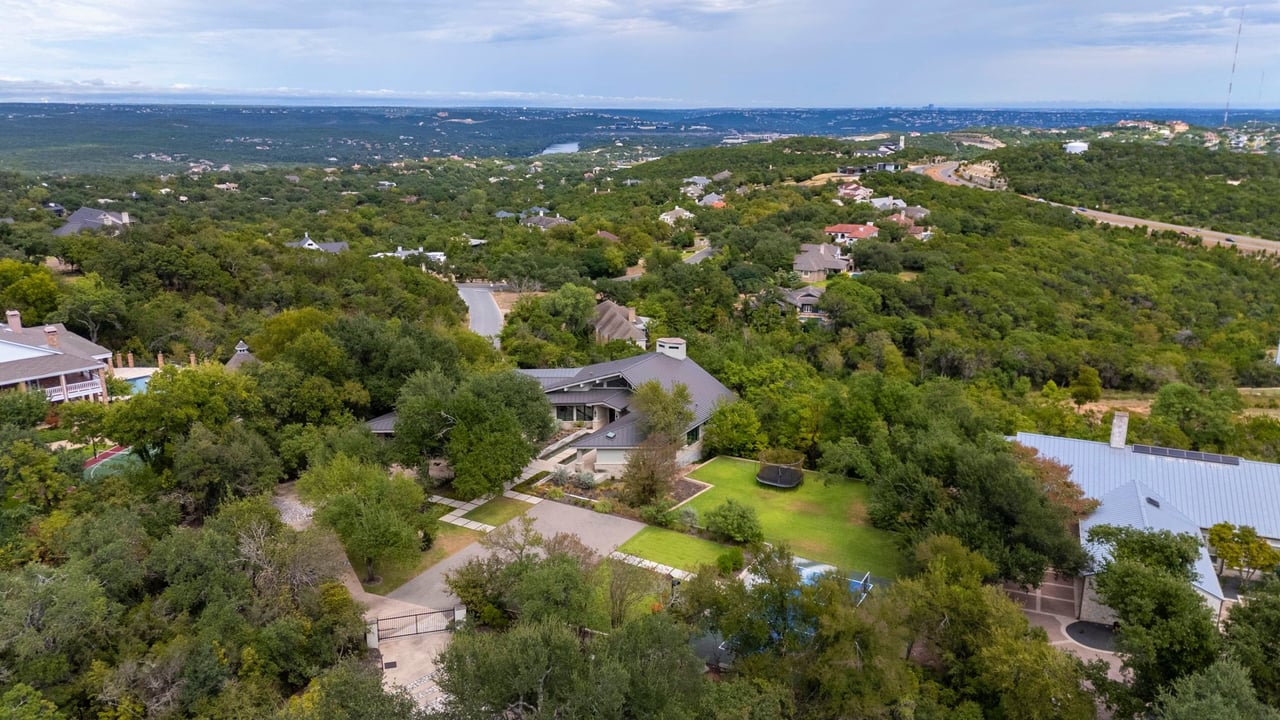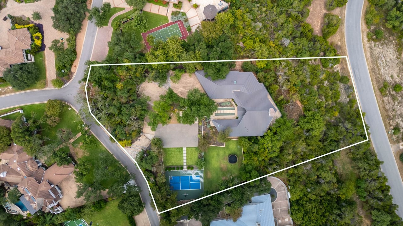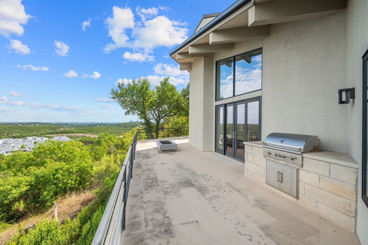 Situated in Rob Roy, one of Westlake’s most coveted gated communities, 10 Hedge Lane boasts exceptional views, expansive terraces, and a 3-car garage. The single-level residence features 4 bedrooms and 4.5 bathrooms on a premier lot with a lush green yard and a sports court. Glide over stones that appear to be floating on water as you approach the striking glass double doors that welcome you inside the residence. The interiors instantly impress with a vaulted ceiling, fireplace, recessed lighting, and incredible panoramic views of the Hill Country and the Austin skyline in the distance.