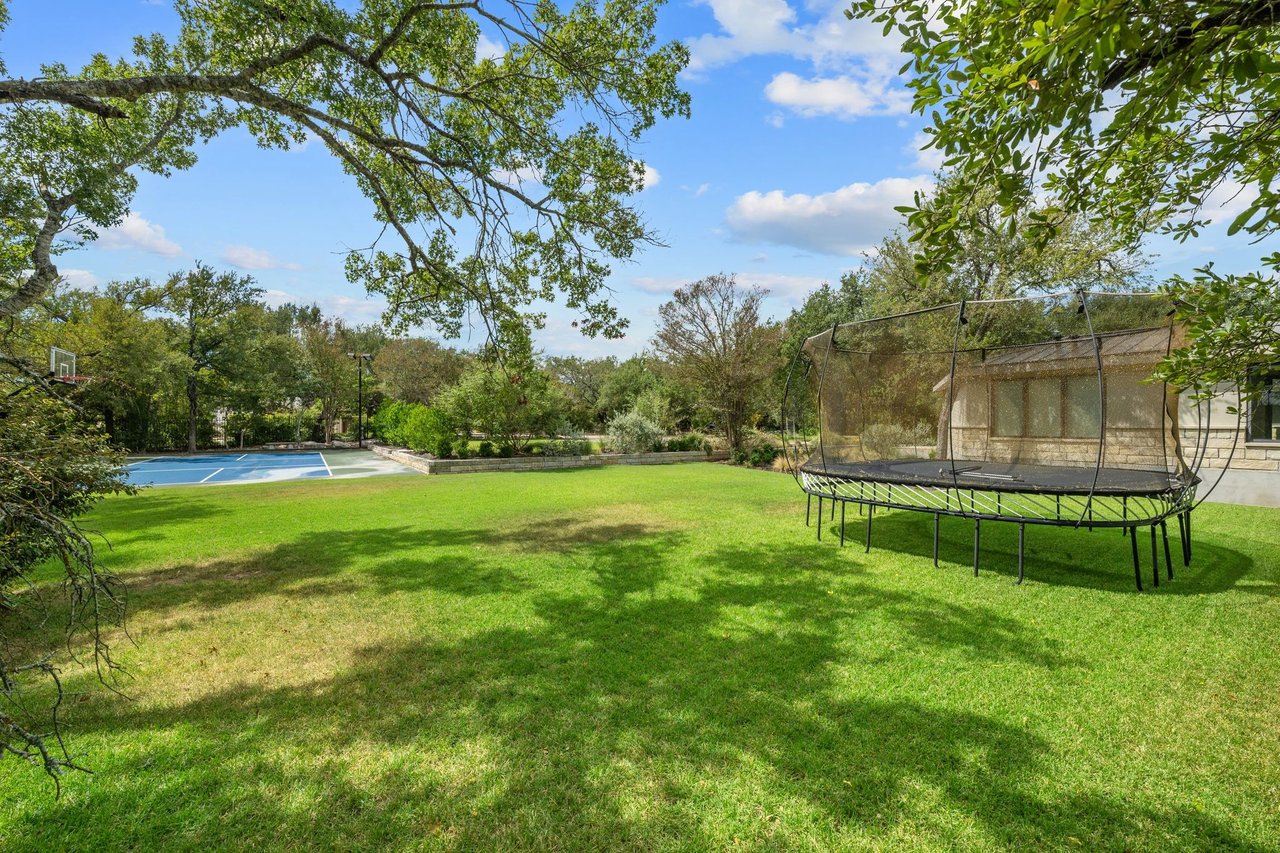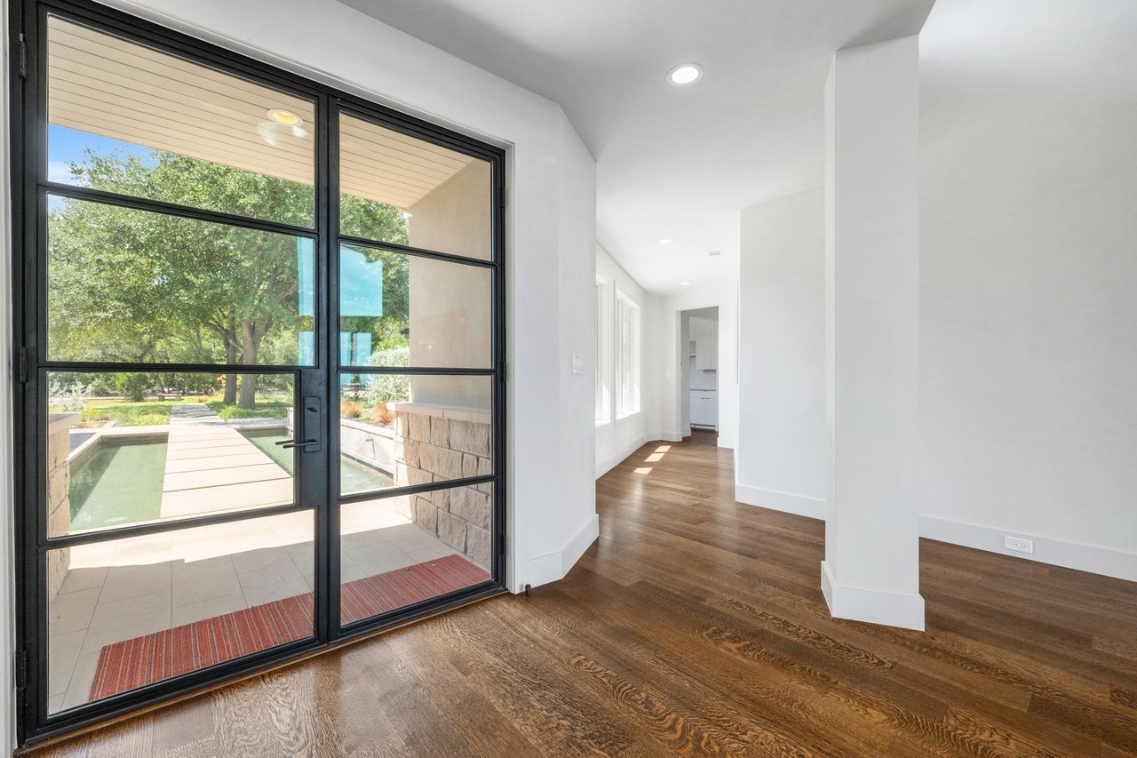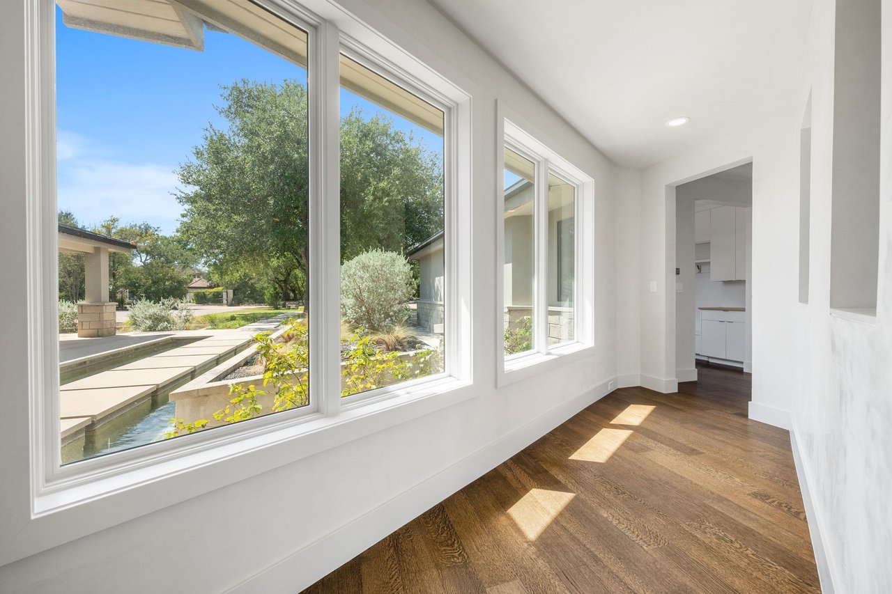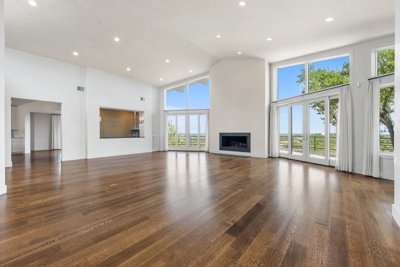 Situated in Rob Roy, one of Westlake’s most coveted gated communities, 10 Hedge Lane boasts exceptional views, expansive terraces, and a 3-car garage. The single-level residence features 4 bedrooms and 4.5 bathrooms on a premier lot with a lush green yard and a sports court. Glide over stones that appear to be floating on water as you approach the striking glass double doors that welcome you inside the residence. The interiors instantly impress with a vaulted ceiling, fireplace, recessed lighting, and incredible panoramic views of the Hill Country and the Austin skyline in the distance.