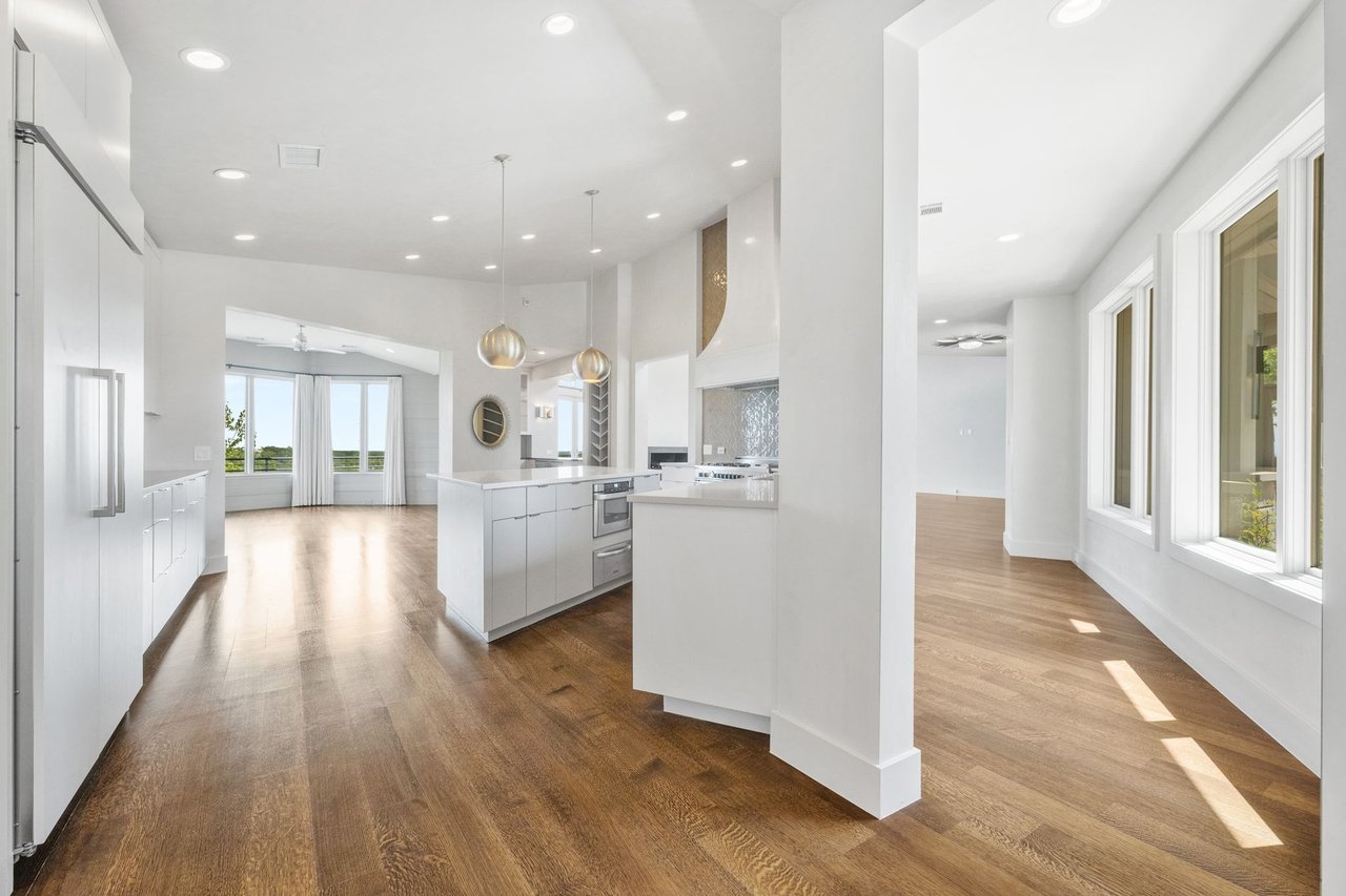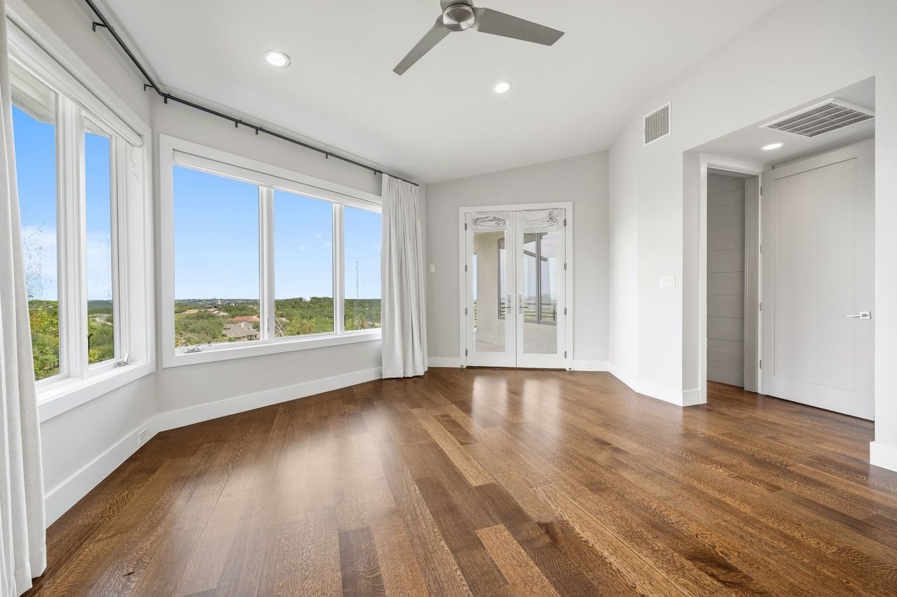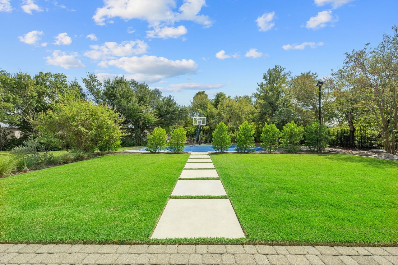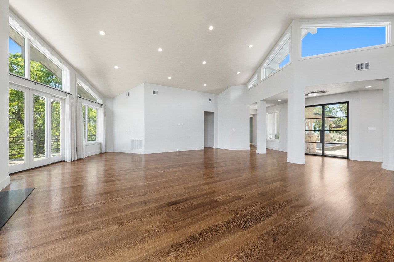 Situated in Rob Roy, one of Westlake’s most coveted gated communities, 10 Hedge Lane boasts exceptional views, expansive terraces, and a 3-car garage. The single-level residence features 4 bedrooms and 4.5 bathrooms on a premier lot with a lush green yard and a sports court. Glide over stones that appear to be floating on water as you approach the striking glass double doors that welcome you inside the residence. The interiors instantly impress with a vaulted ceiling, fireplace, recessed lighting, and incredible panoramic views of the Hill Country and the Austin skyline in the distance.