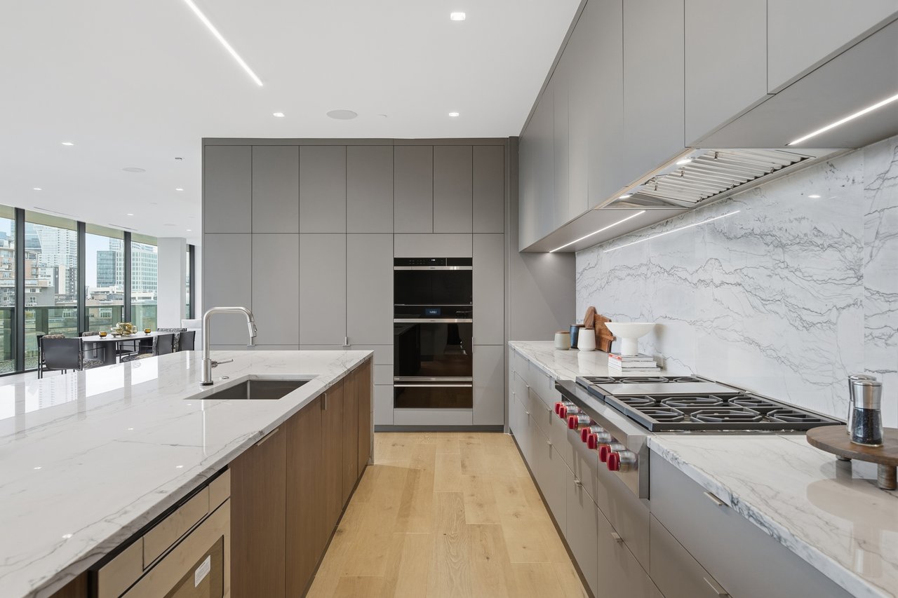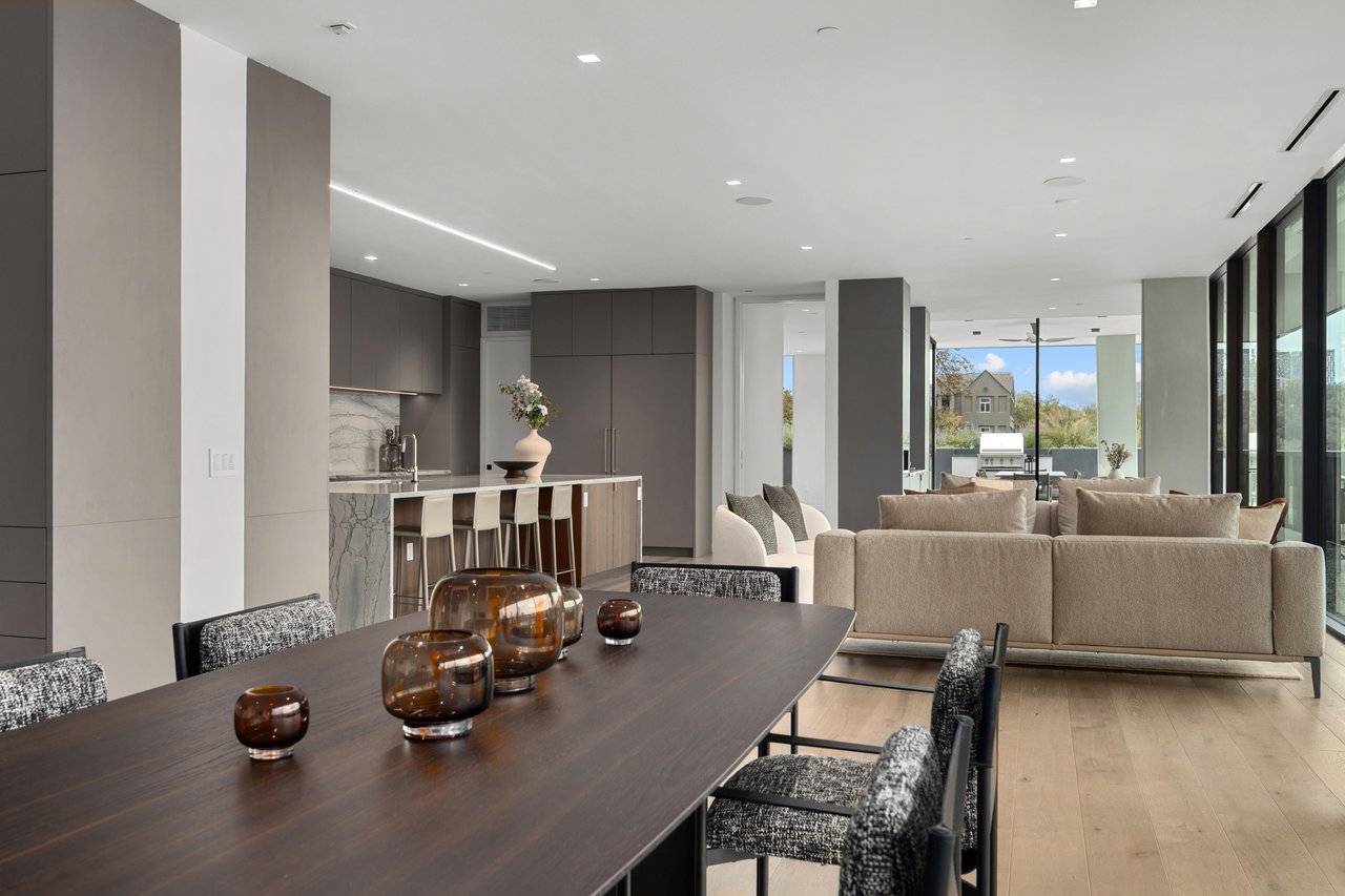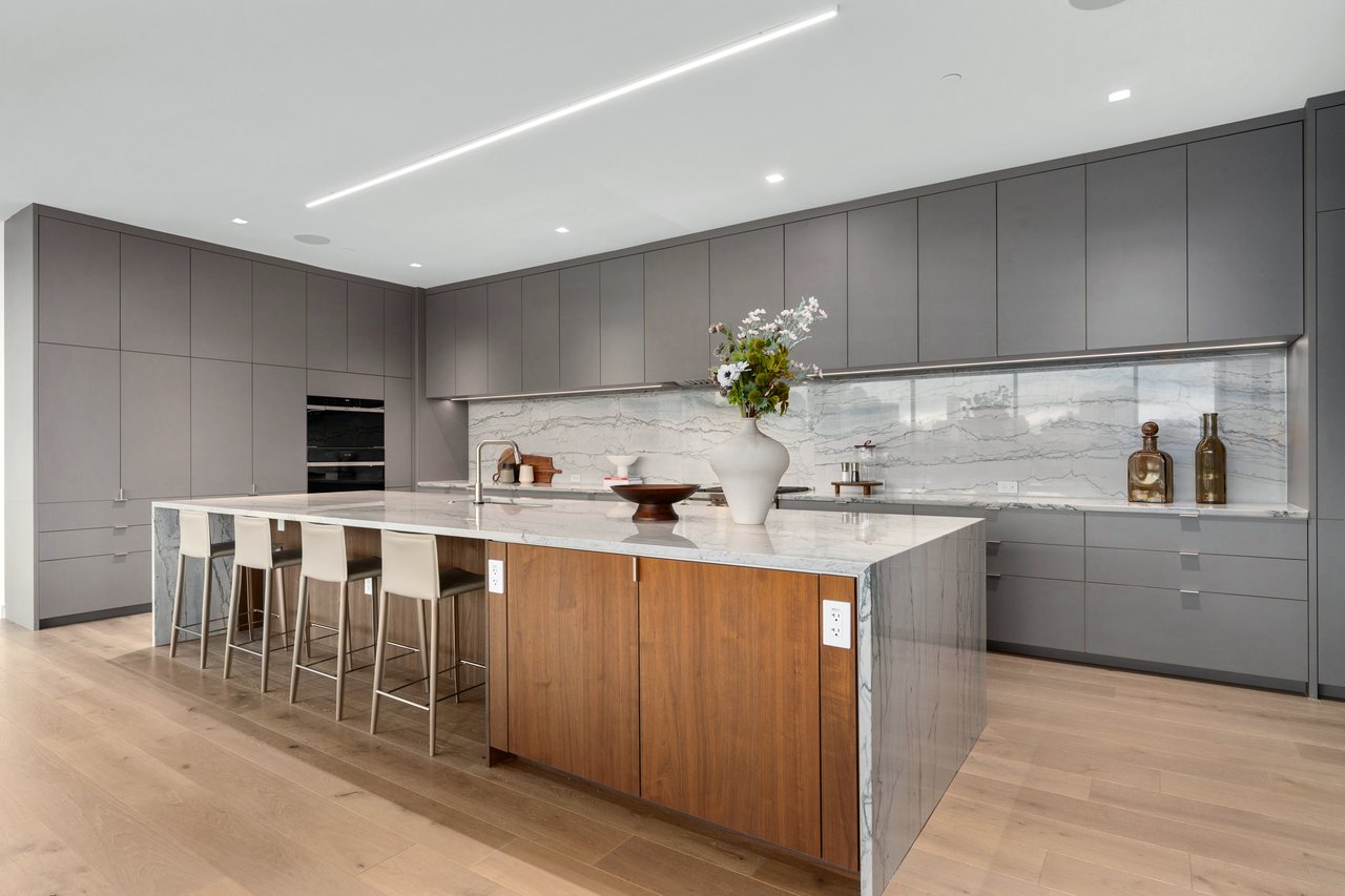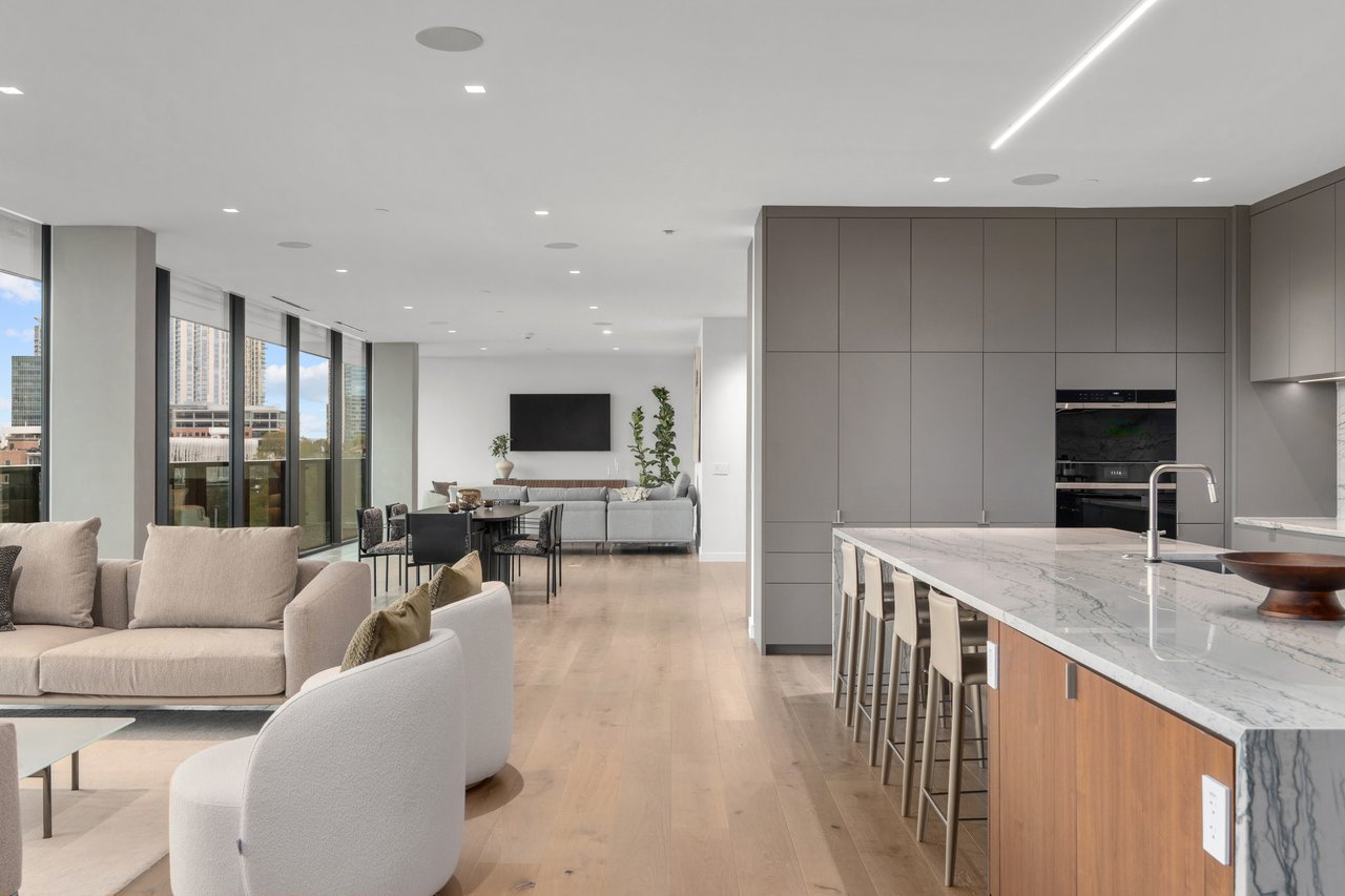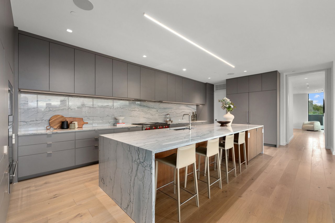Throughout you will find the most exquisite materials and craftsmanship. Wide-plank oak floors ground the space with an organic warmth, while Maldive quartzite surfaces glow against sleek cabinetry by local cabinetmakers Lavish Kitchen and Bath. Luxury plumbing and lighting fixtures add glittering finishing touches. Additional amenities include a private plunge pool on the terrace, a built-in coffee station, abundant storage and three reserved parking spaces.
