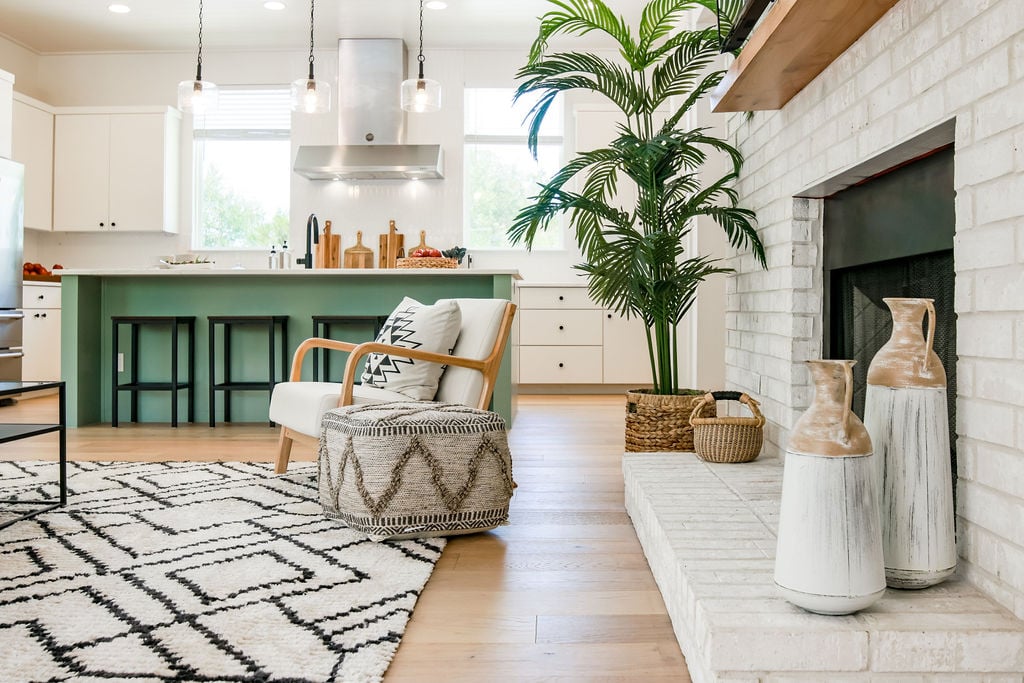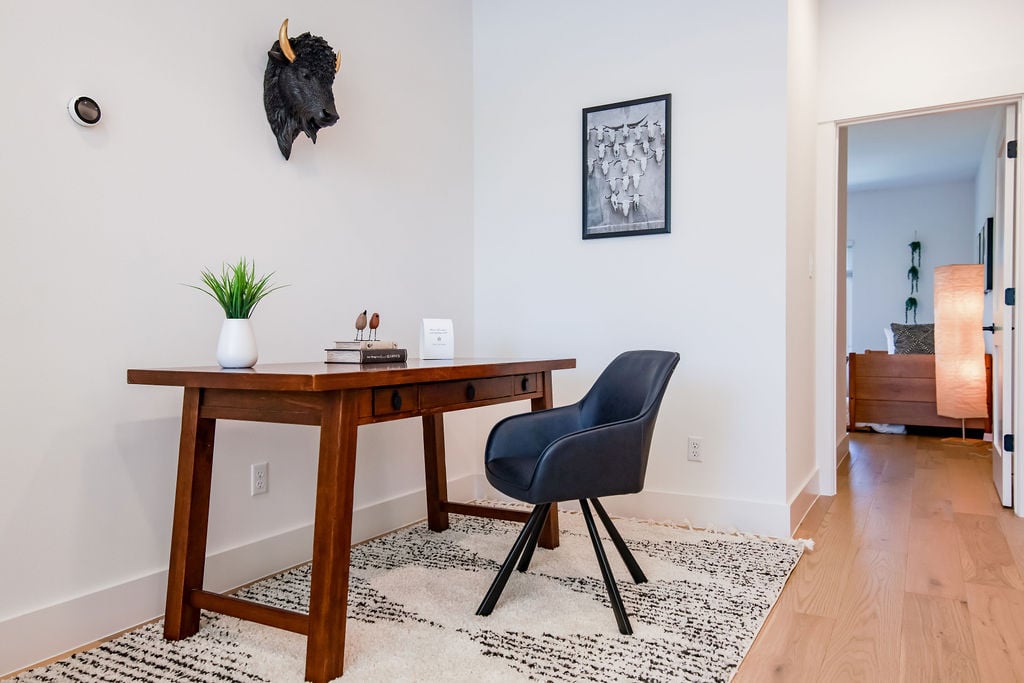 The heart of the home is the gourmet island kitchen, seamlessly open to the main living area and built for both busy mornings and easy entertaining. A Bertazzoni range, stainless steel appliances, farmhouse sink, abundant cabinet storage, pendant lighting, and generous island seating make this a space everyone will gather around. With two dining areas plus the island, there is room for everything from casual breakfasts to holiday dinners. A second downstairs living area provides the perfect spot for a playroom, game room, or tucked-away TV space. The private primary suite is thoughtfully positioned on its own side of the home and features a luxurious bath with dual vanities, a large walk-in shower, separate soaking tub, and oversized walk-in closet. Also downstairs are a secondary ensuite bedroom and an expansive office or flex room, currently shown as a bedroom with a Santa Fe-inspired art wall. With its own separate entrance and patio access, this room offers incredible flexibility for a home office, guest suite, or multigenerational living. A well-designed laundry room with drop zone completes the main level.