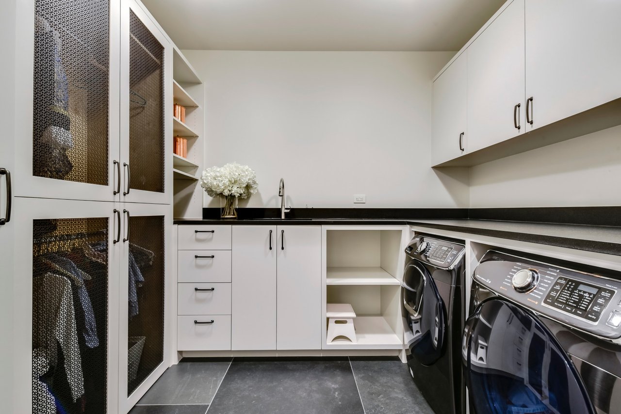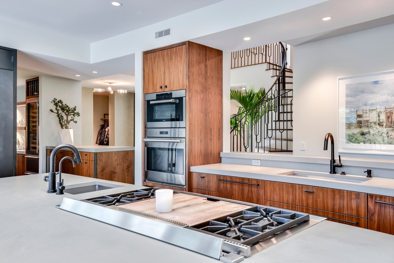 The materials throughout were selected by a renowned local firm, Wendy Williamson Design, to complement and enhance the view. Cool slate floors in the living room ground the space and contrast with exquisite walnut grain-matched cabinetry that is replicated throughout the house. Steel-framed windows are complemented by a custom iron railing on the entry staircase; each light fixture and wall finish are selected to enhance the space. The European-style chef’s kitchen is flooded with light from floor-to-ceiling windows and skylights and features a large island, walnut cabinetry, a double refrigerator, wine cooler and wet bar. The overall effect is calming and luxurious with a strong sense of nature.