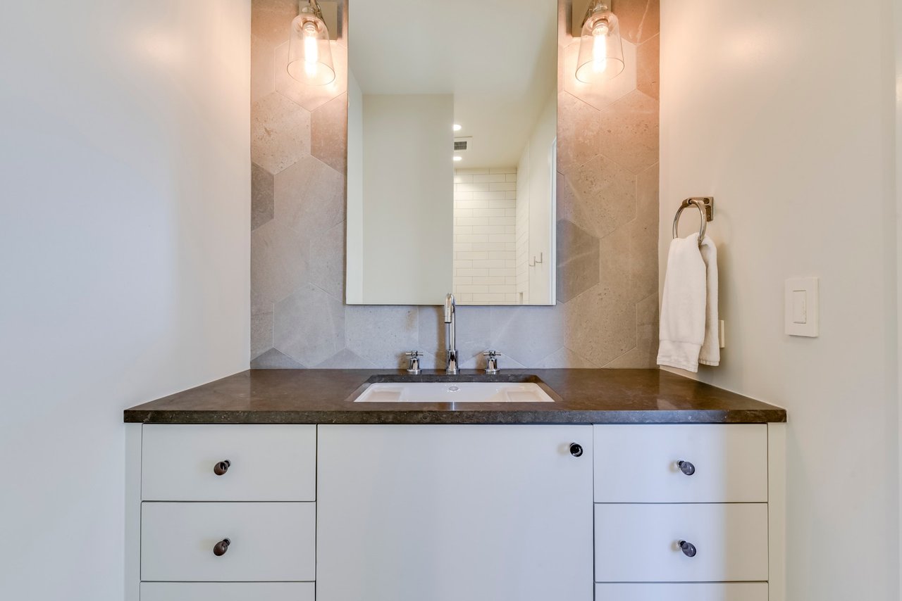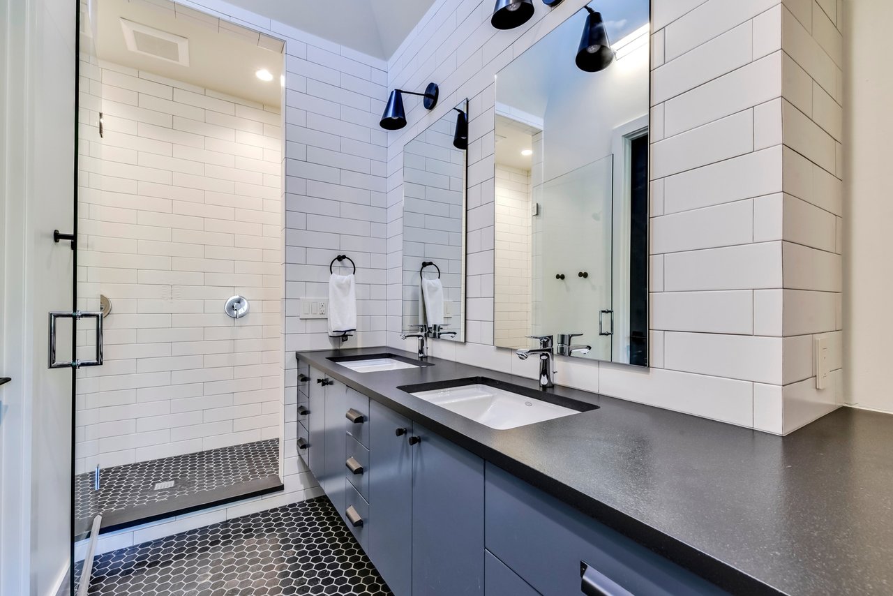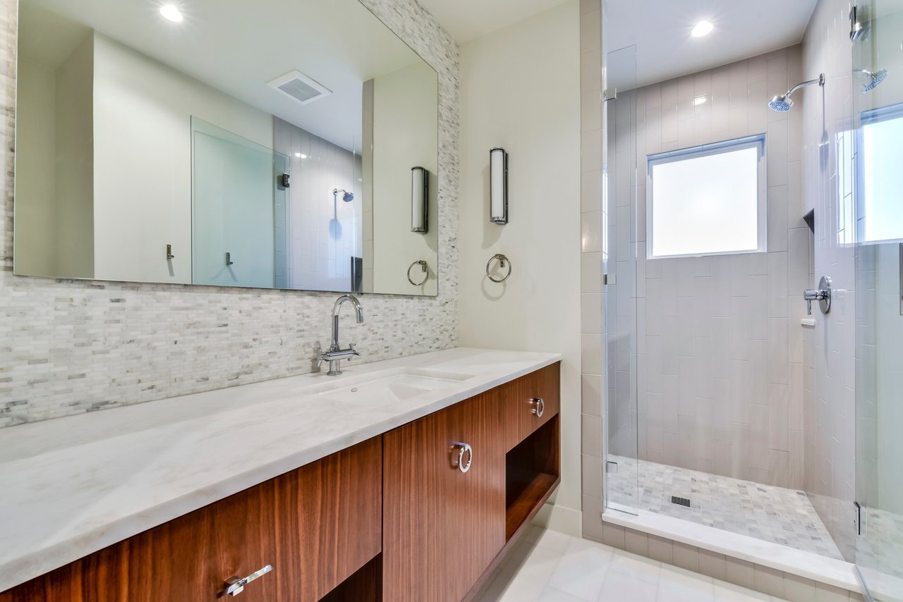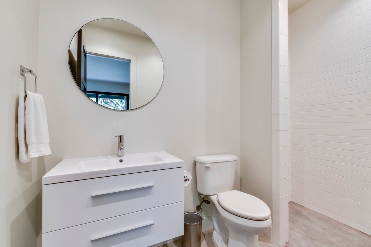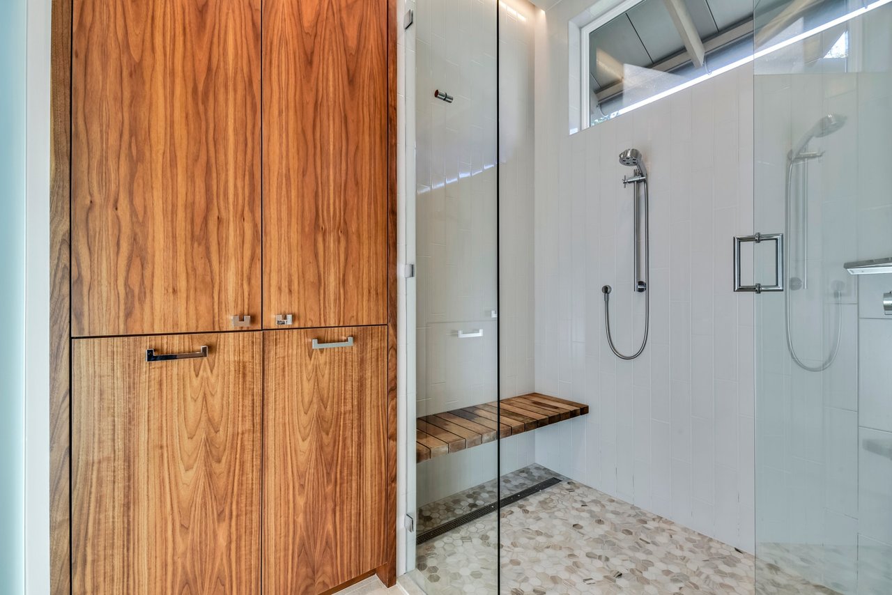 The soaring main living area feels a part of the landscape with the steel-beamed vaulted ceilings and matching windows seamlessly connecting the covered porch, which overlooks a sleek, negative-edge pool and the woodlands beyond. The most arresting feature is the suspended, glass-walled bridge connecting the main living area and the master bedroom; floating above a ravine, it is a magical place to host an elegant dinner party and provides a serene gateway to the cool, calm master suite.