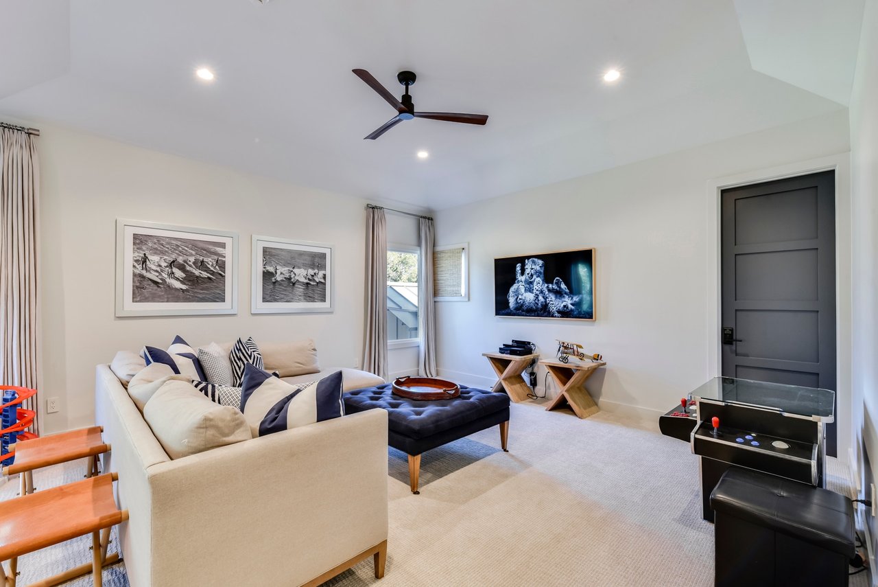With plenty of space for both entertaining and family activities, the floor plan includes four additional en-suite bedrooms; one features a set of built-in bunk beds and another is located on the opposite side of the house for privacy. An upstairs game room provides family and play space away from the more formal areas. Opening to the lawn on the lower floor is a huge exercise room with a full bath. With the luxuries surrounding you, you’ll never want to leave home.