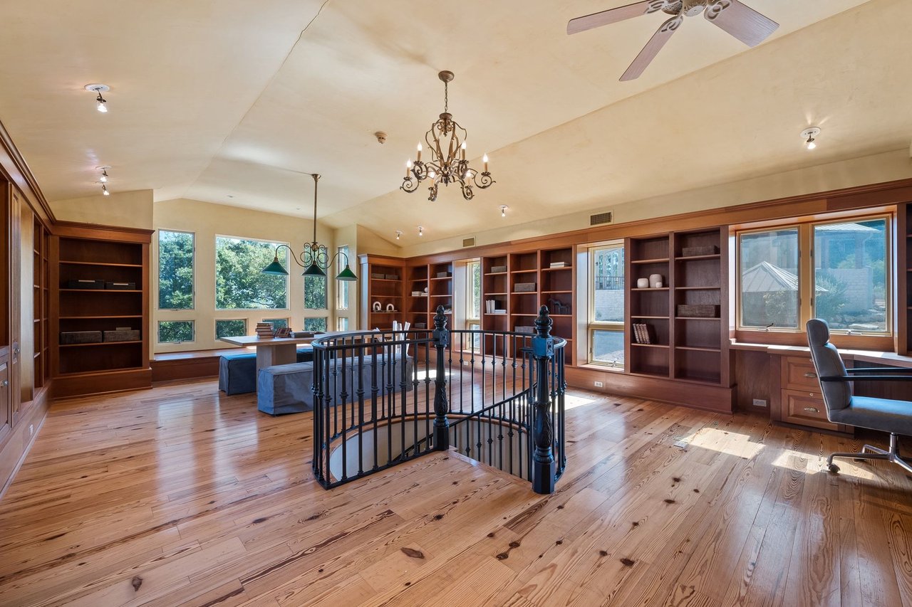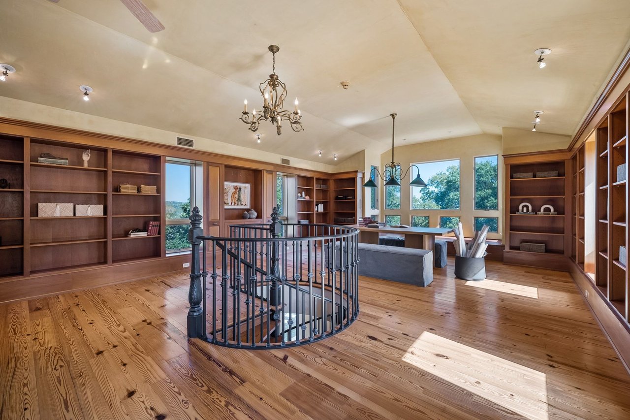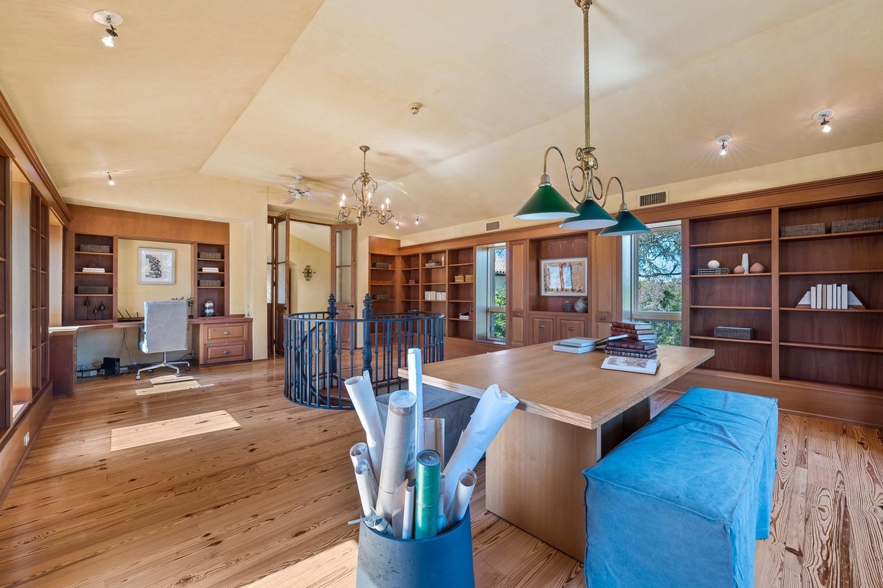 Inside, the home impresses with exquisite craftsmanship and a sense of grandeur balanced by inviting livability. Soaring ceilings, stunning wood floors, a fireplace, and rich finishes complement expansive windows that fill the interiors with natural light in the living area. The beautiful kitchen boasts stainless steel appliances, a center island, and a desirable built-in pizza oven. The first-level primary suite offers a private haven with French doors leading to the outdoors and a spa-like bathroom featuring a soaking tub, walk-in shower, and elegant dual vanities. A spiral staircase within the suite ascends to a breathtaking library lined with wood shelving, where sunlight pours in through tall windows, creating an idyllic retreat for quiet reading or creative inspiration.