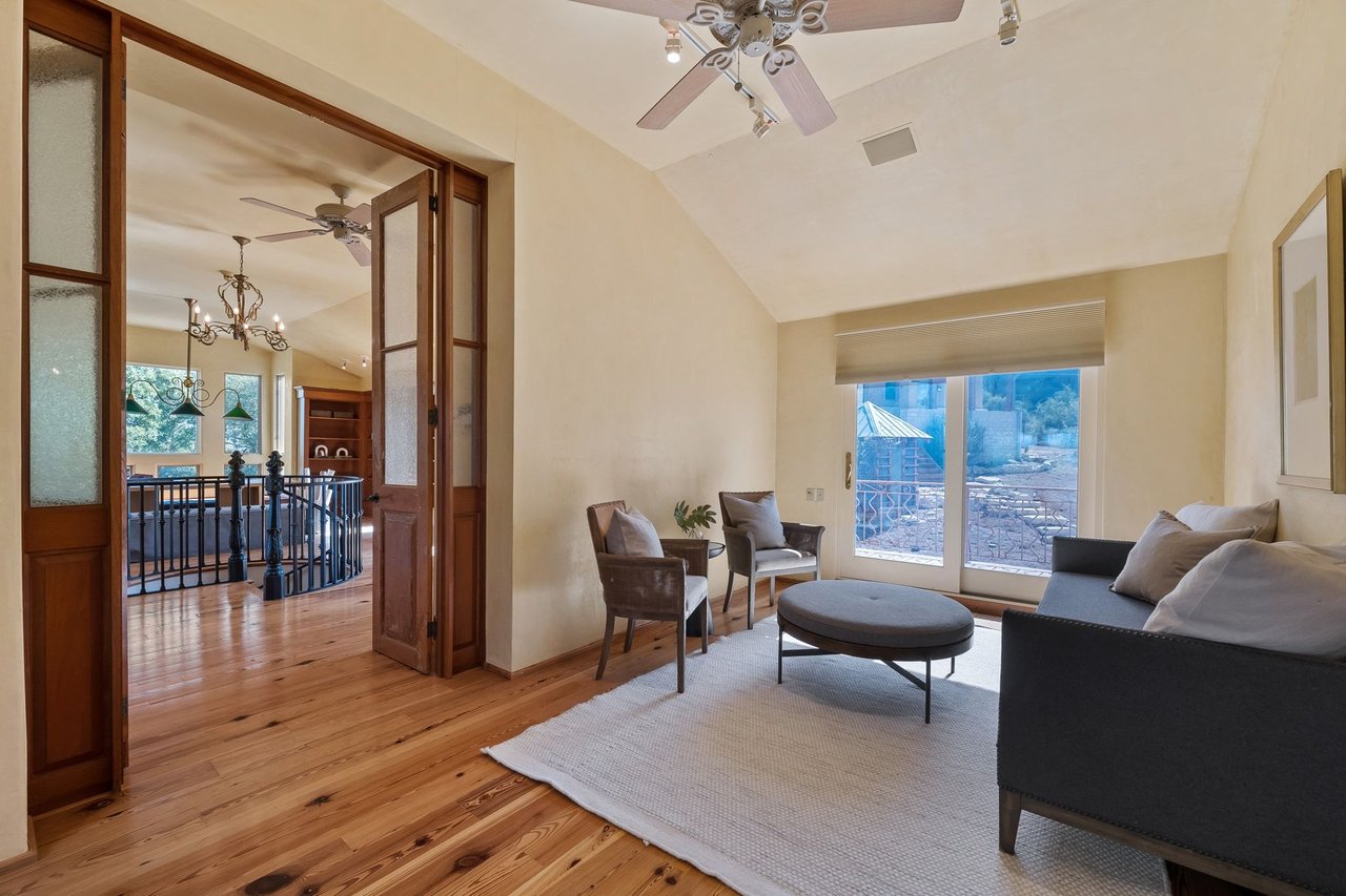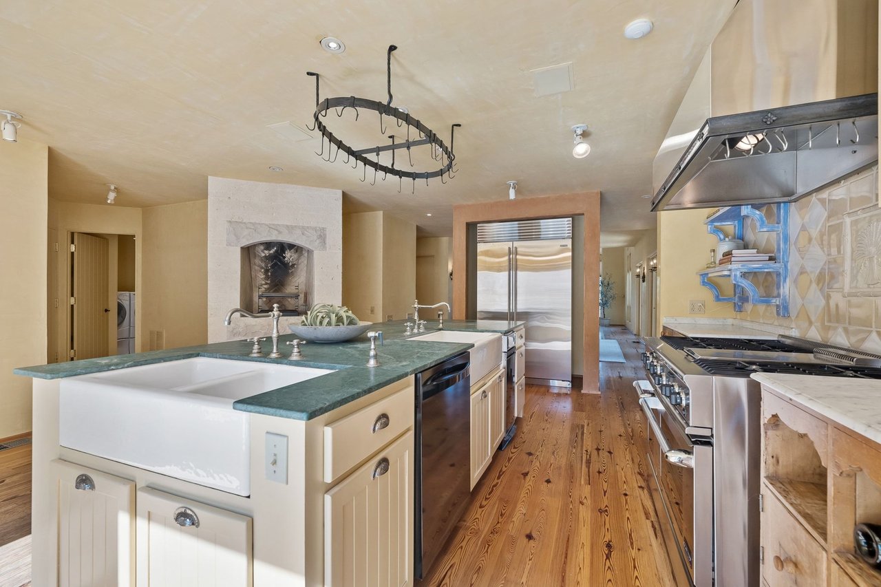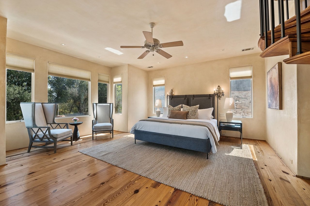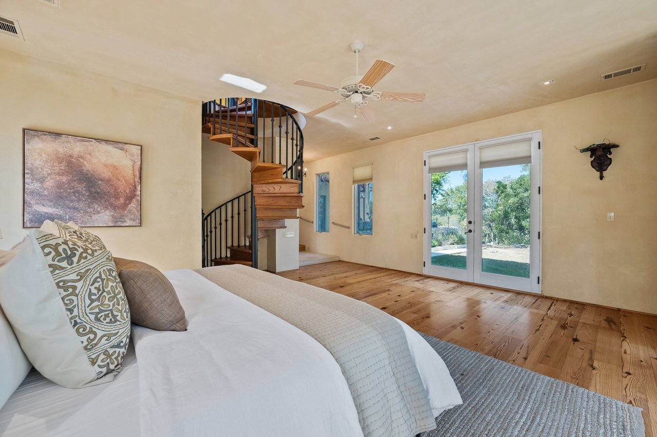 Inside, the home impresses with exquisite craftsmanship and a sense of grandeur balanced by inviting livability. Soaring ceilings, stunning wood floors, a fireplace, and rich finishes complement expansive windows that fill the interiors with natural light in the living area. The beautiful kitchen boasts stainless steel appliances, a center island, and a desirable built-in pizza oven. The first-level primary suite offers a private haven with French doors leading to the outdoors and a spa-like bathroom featuring a soaking tub, walk-in shower, and elegant dual vanities. A spiral staircase within the suite ascends to a breathtaking library lined with wood shelving, where sunlight pours in through tall windows, creating an idyllic retreat for quiet reading or creative inspiration.
