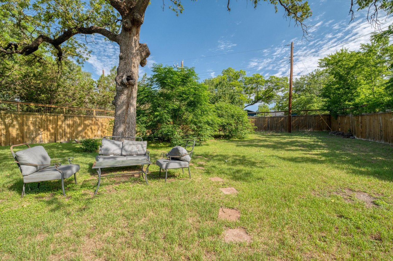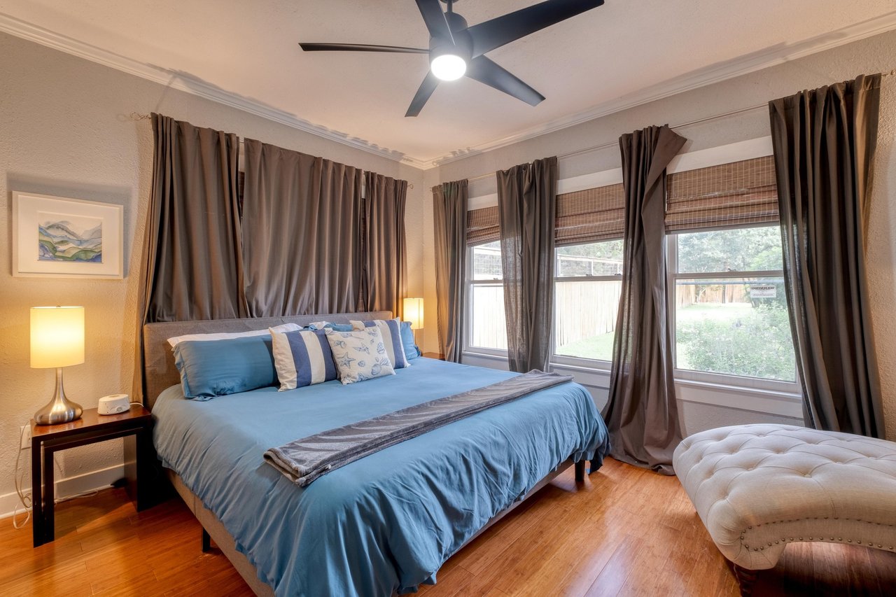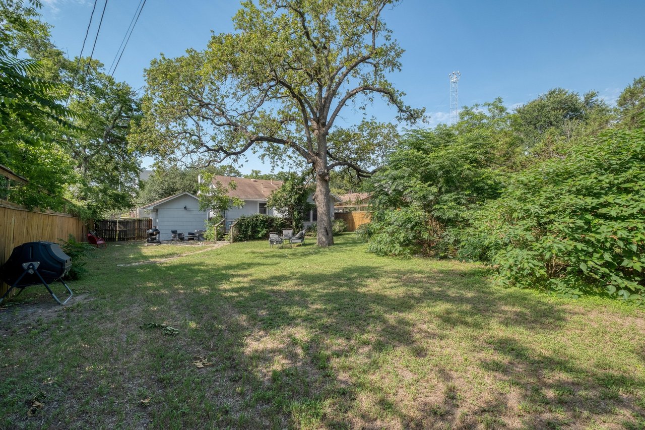 Designed with comfort and entertaining in mind, the open-concept living and dining areas are warm and welcoming, anchored by vintage lighting and a curated library. Outdoors, a covered front porch with vintage rockers leads to a sprawling backyard oasis featuring a lit deck with dining and lounge spaces, a biergarten, and grill—perfect for gathering under the stars. Ideal as a full-time residence, guest house, or investment property in the heart of Austin.