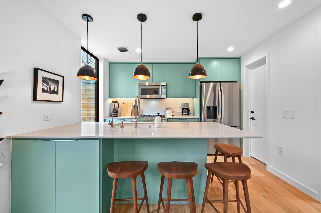 The open-concept main living area seamlessly connects the living, dining, and kitchen spaces, creating an ideal layout for both entertaining and daily living. White Oak flooring and abundant natural light enhance the bright, welcoming atmosphere. The kitchen is beautifully appointed with quartz countertops, custom cabinetry in Sherwin Williams Halcyon Green, and high-end Thermador stainless steel appliances.