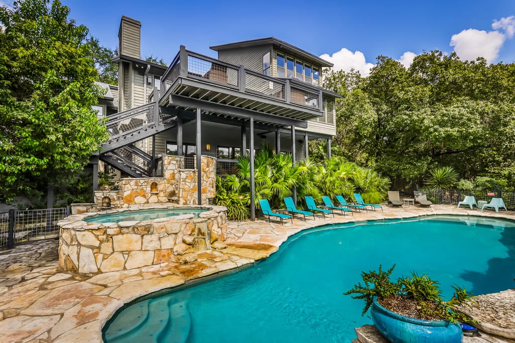 Tranquil Creekside Contemporary Serene Westlake home fronting peaceful Bee Creek, just minutes to shopping, Mopac and downtown. A striking contemporary limestone façade angles up in to the trees with clerestory windows allowing light to flood in to the rooms. Floor-to-ceiling windows in the living room look out over the largest of the four decks to the creek and the lush hillside beyond. The lower level opens to another covered alfresco space and then out to a huge limestone-paved patio surrounding a pool and spa; you’ll feel miles away from everything ensconced in trees and greenery as you enjoy tranquility. A covered boat dock is topped by a sun deck for post-aquatic cocktails. Treetop Views and Light-Flooded Rooms The recently remodeled interior features warm oak floors complemented by bleached wood ceilings and a riverstone fireplace in the living room. The adjacent kitchen is outfitted by bleached knotty-pine cabinetry, rich granite and stainless appliances. The ultra-private treetop master suite inhabits the entire second floor and has soaring ceilings and floor-to-ceiling windows that open to its own deck. A luxurious bath is filled with windows and a large soaking tub. Materials throughout are recently updated and of utmost quality. Multi-Purpose Rooms for Any Activity The main floor includes three sun-filled bedrooms, one of which has its own deck and a loft space above for additional guests or a tucked-away office. A study with built-in desk and extra-large laundry room complete the main floor. Down a half flight of stairs are two additional bedrooms and a game room, accessing the covered terrace and pool.