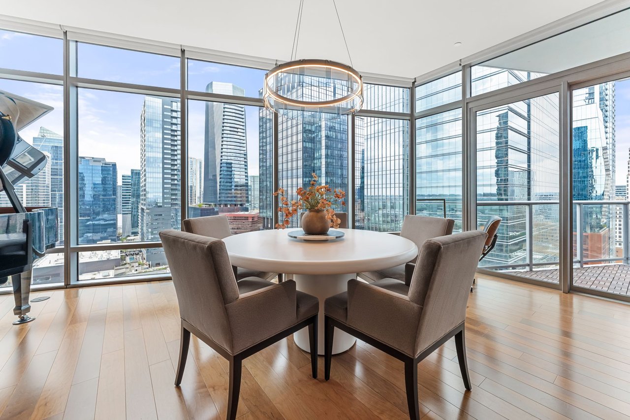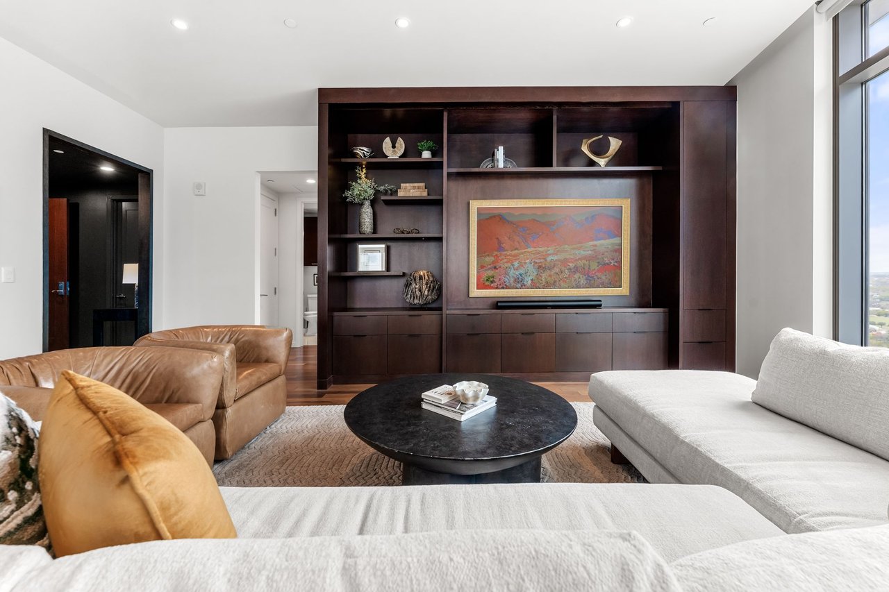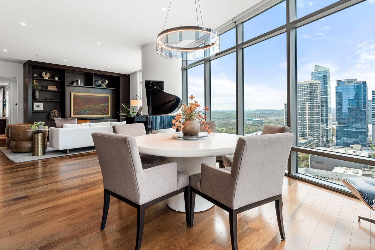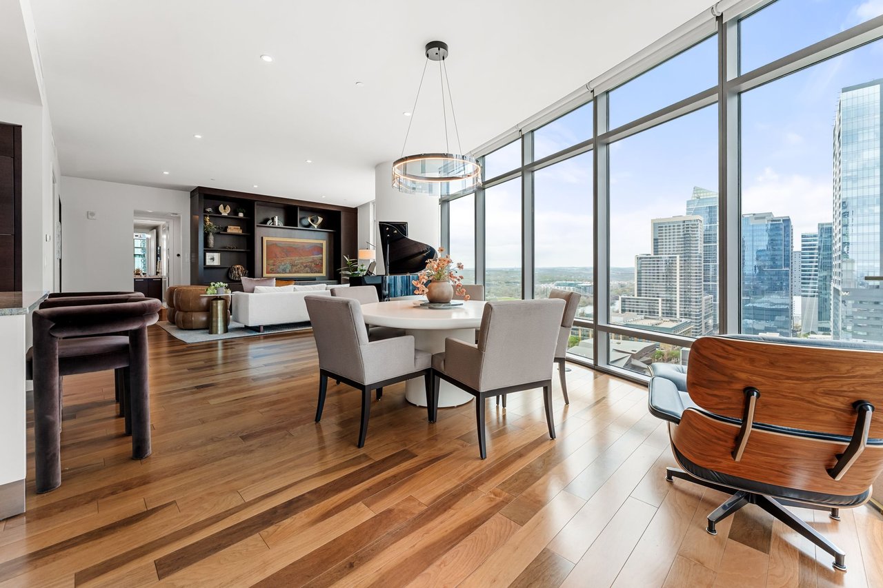 Thoughtfully enhanced by Dick Clark Architecture, this coveted “E” residence on the 21st floor of The Austonian showcases sweeping views of the Austin skyline, Hill Country, and Lady Bird Lake. The northwest corner floor plan offers an ideal balance of open living and private retreat, featuring two bedrooms plus an office. Generous living and dining areas create an elegant setting for everyday living or entertaining, while the bedrooms are positioned for privacy.