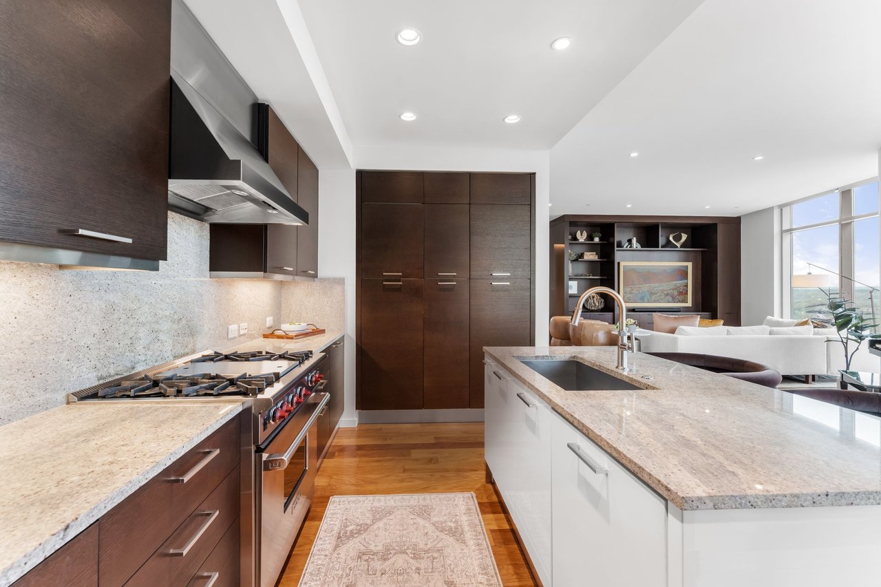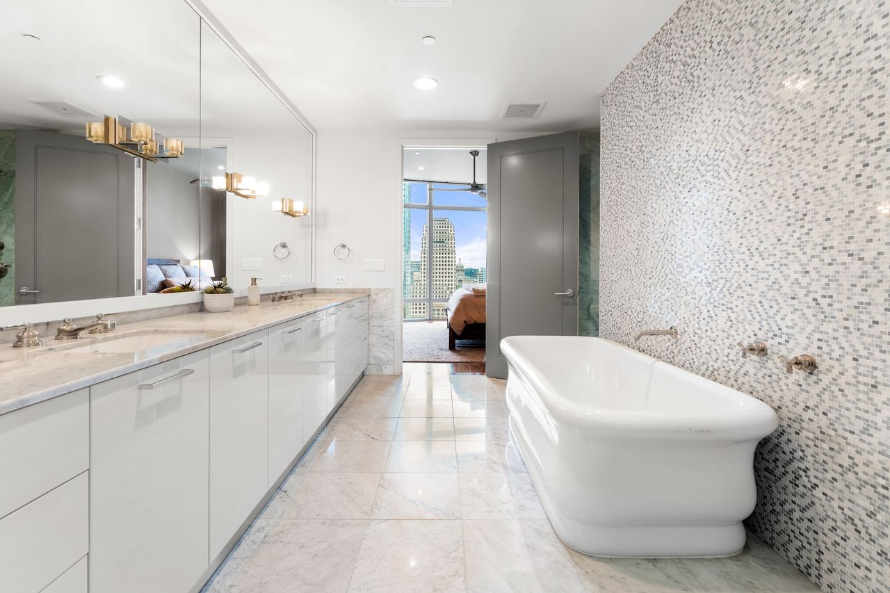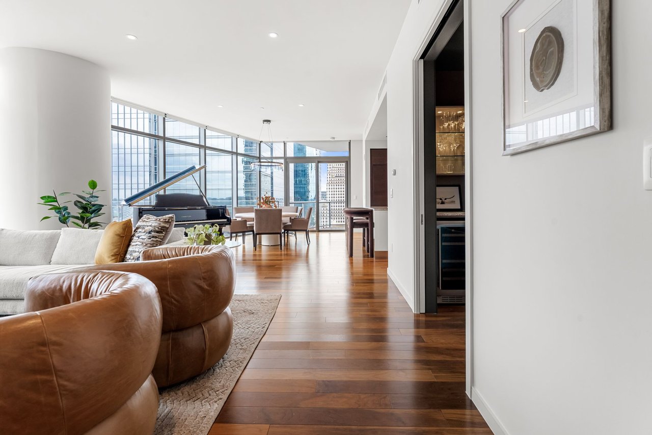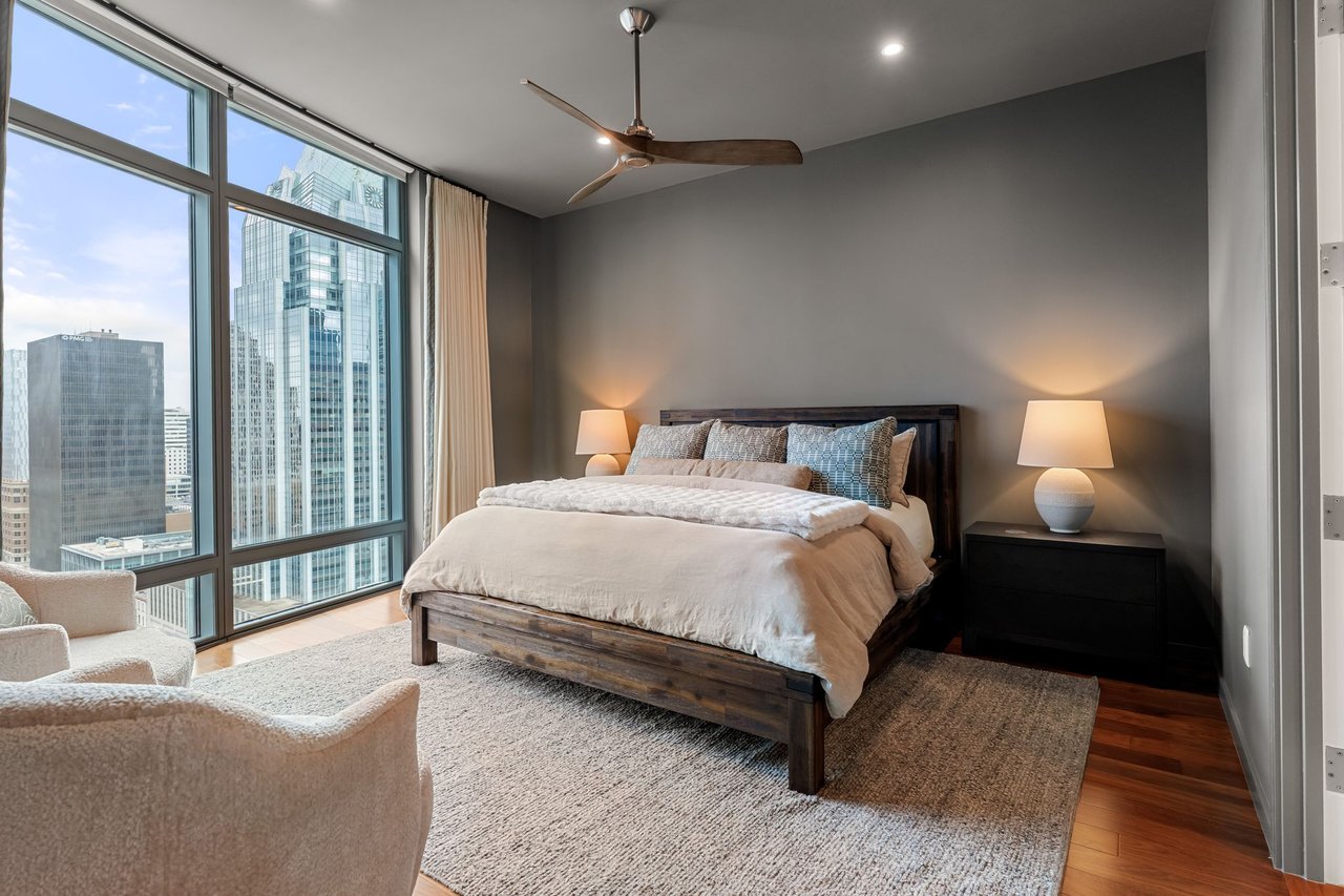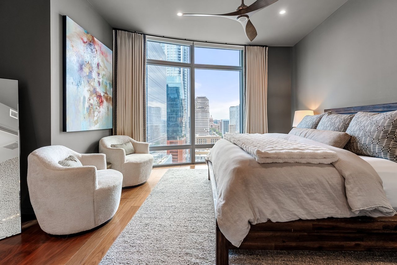 Thoughtfully enhanced by Dick Clark Architecture, this coveted “E” residence on the 21st floor of The Austonian showcases sweeping views of the Austin skyline, Hill Country, and Lady Bird Lake. The northwest corner floor plan offers an ideal balance of open living and private retreat, featuring two bedrooms plus an office. Generous living and dining areas create an elegant setting for everyday living or entertaining, while the bedrooms are positioned for privacy.