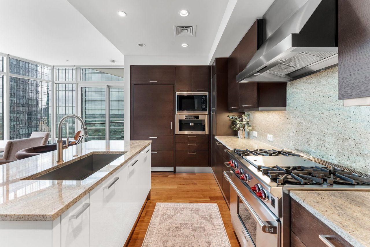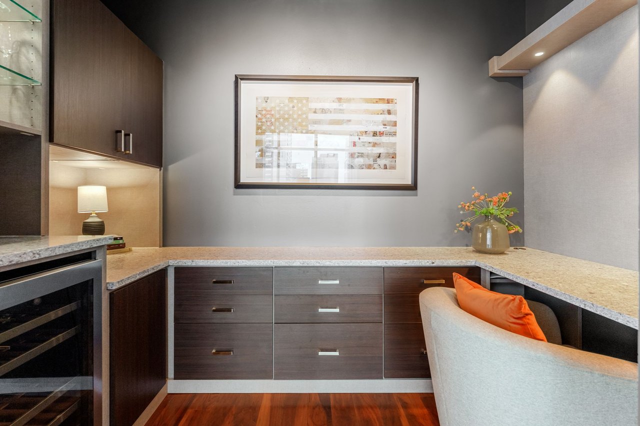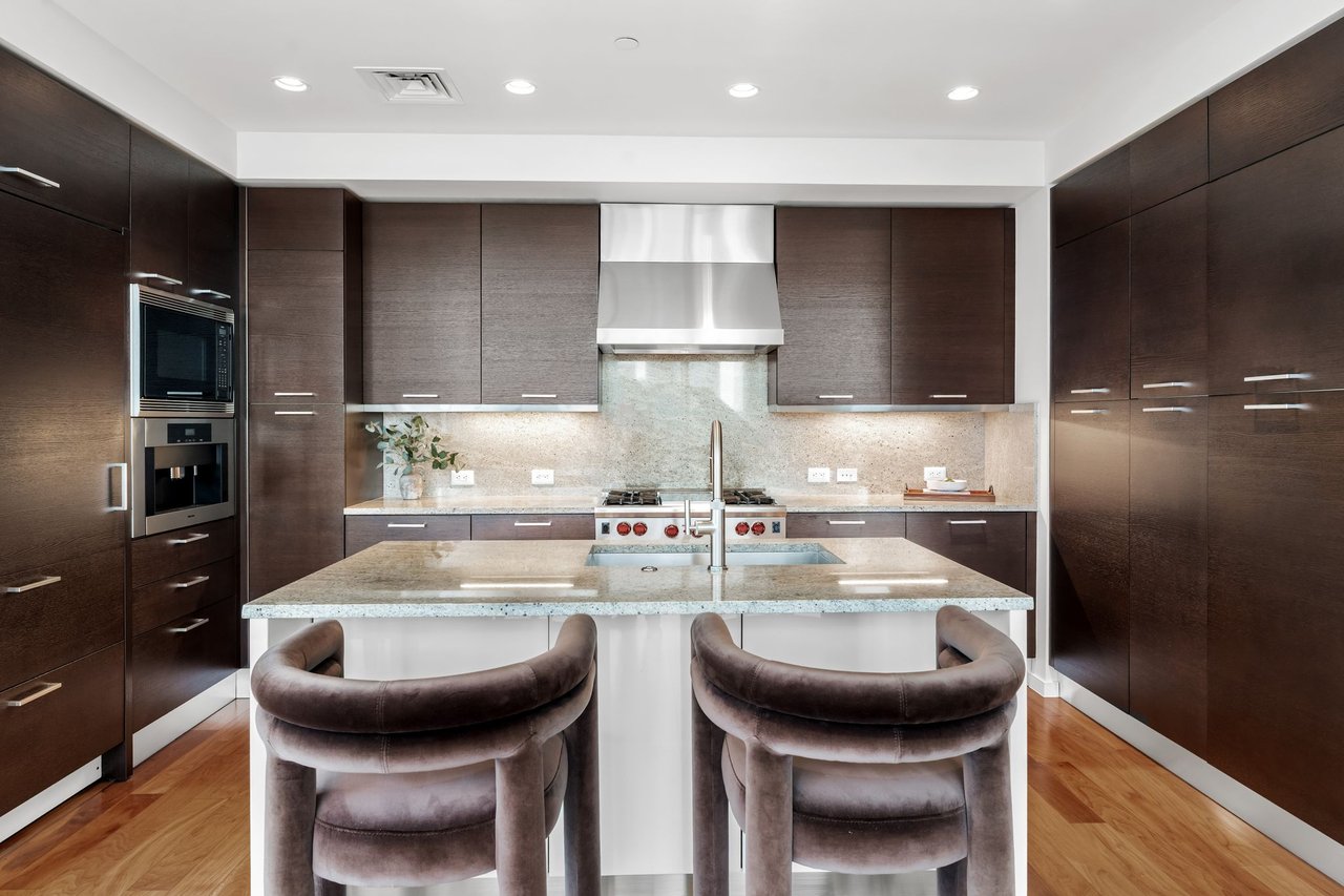 The primary suite is a peaceful escape with a spa-inspired bath, dual vanities, and a spacious walk-in closet. The kitchen is appointed with premium appliances and refined finishes, and the office/flex space is outfitted with built-ins and a desk for effortless work-from-home functionality. The residence also conveys two reserved parking spaces and a private storage unit.