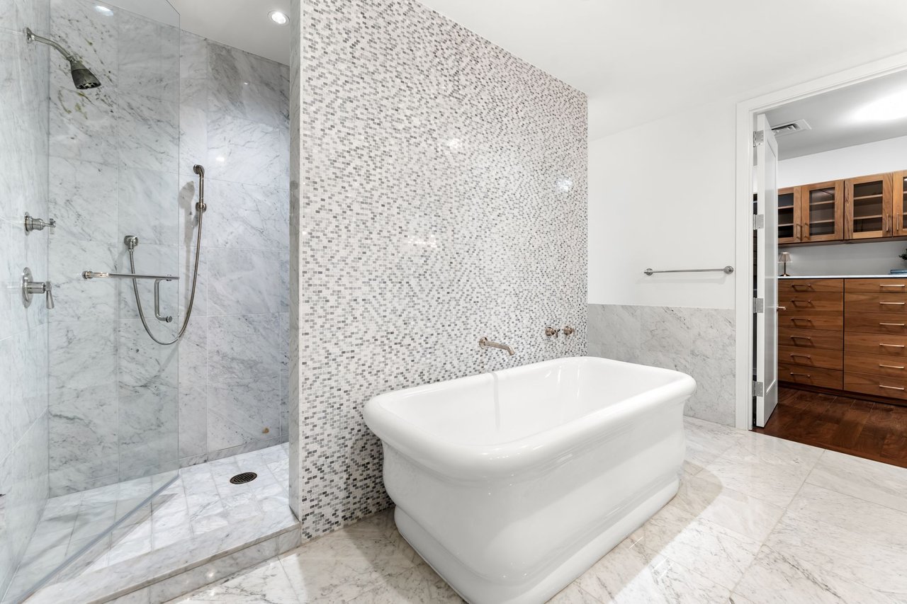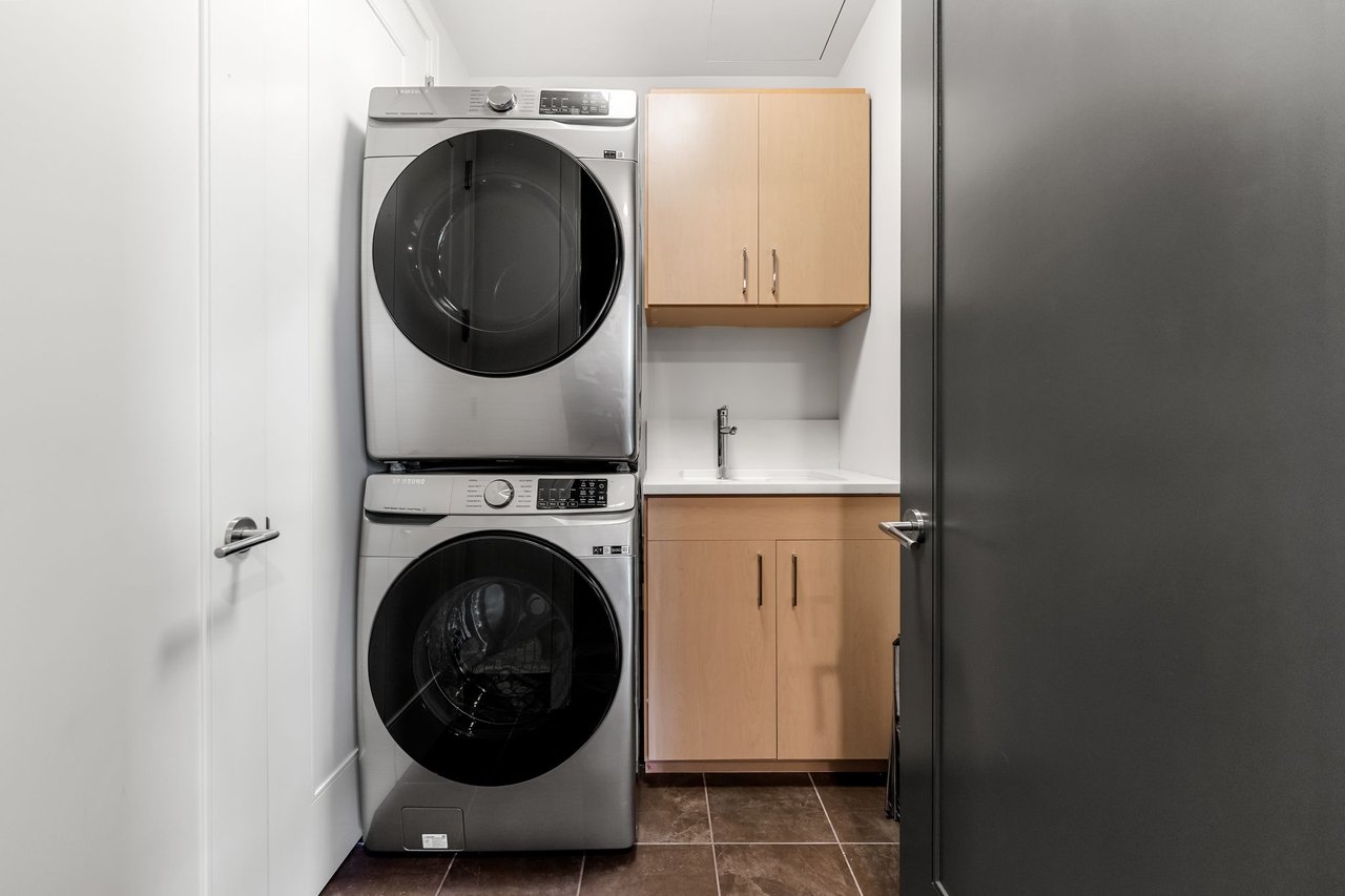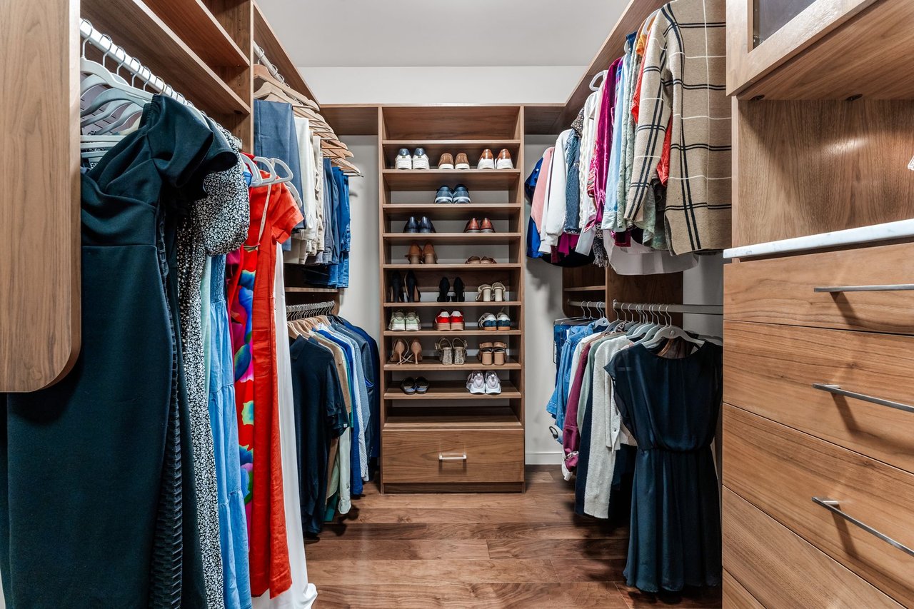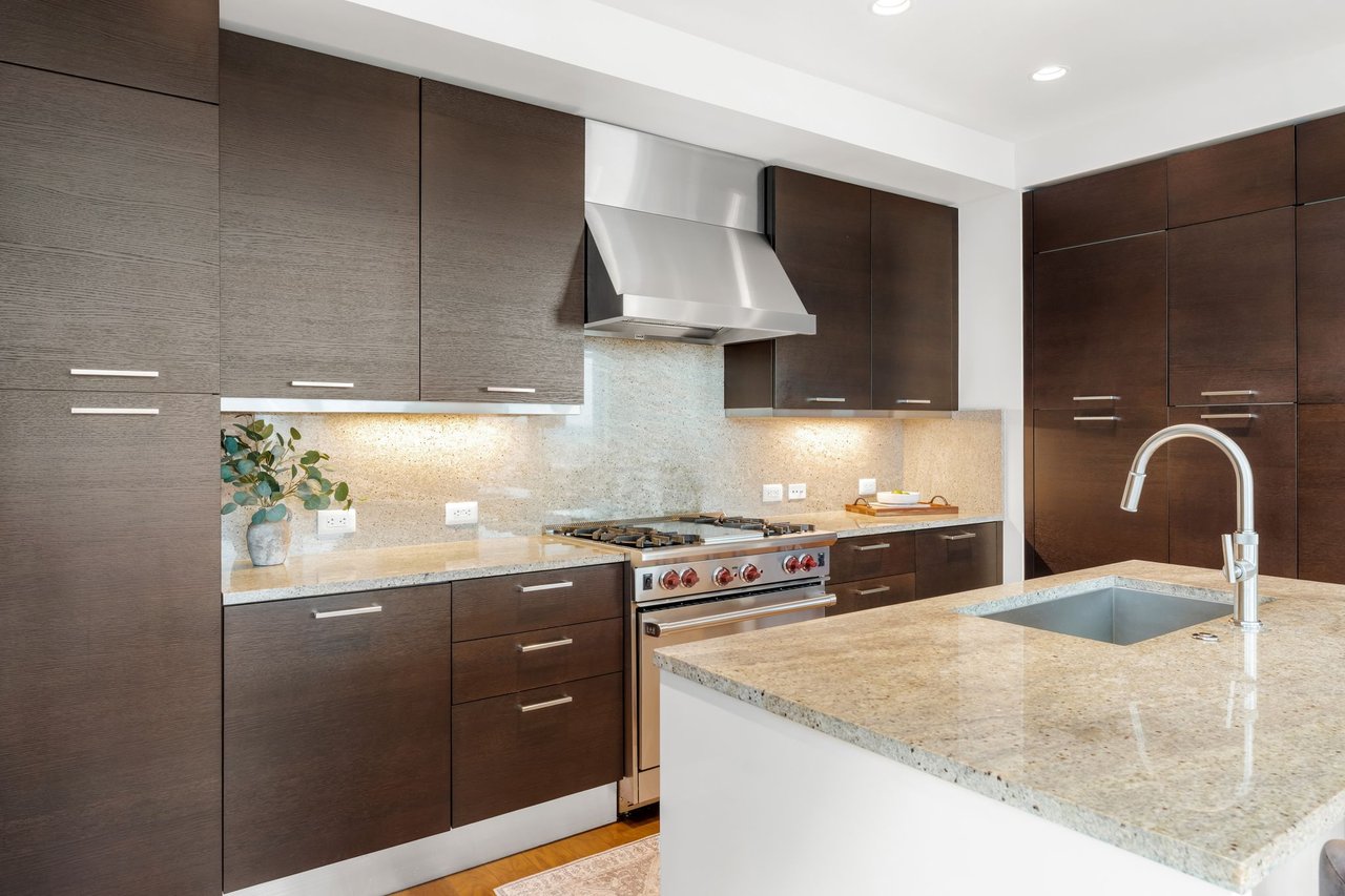 The primary suite is a peaceful escape with a spa-inspired bath, dual vanities, and a spacious walk-in closet. The kitchen is appointed with premium appliances and refined finishes, and the office/flex space is outfitted with built-ins and a desk for effortless work-from-home functionality. The residence also conveys two reserved parking spaces and a private storage unit.