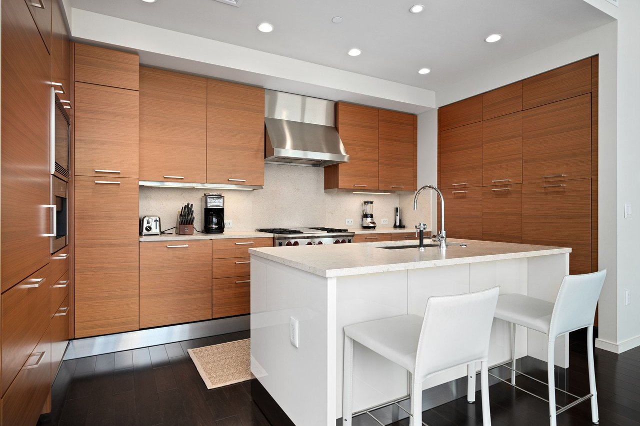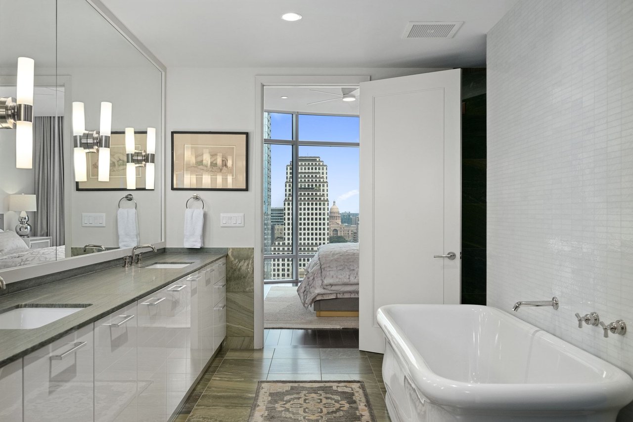 This immaculate 2-bedroom residence on the 24th floor of The Austonian boasts breathtaking views, artfully showcased through floor-to-ceiling windows that light up the skyline. Scenic views of Congress Avenue and the Frost Tower adorn the North balcony off the master suite, while sunsets paint views over Lady Bird Lake from the living space. The residence is anchored by the kitchen complete with granite marble counter tops, custom walnut cabinetry, SubZero refrigerator, and built in coffee machine. The primary suite is adorned with custom-built-in cabinetry, a garden bathtub, and a double vanity. In addition to The Austonian’s world-class services and amenities, 24E also conveys with two parking spaces.