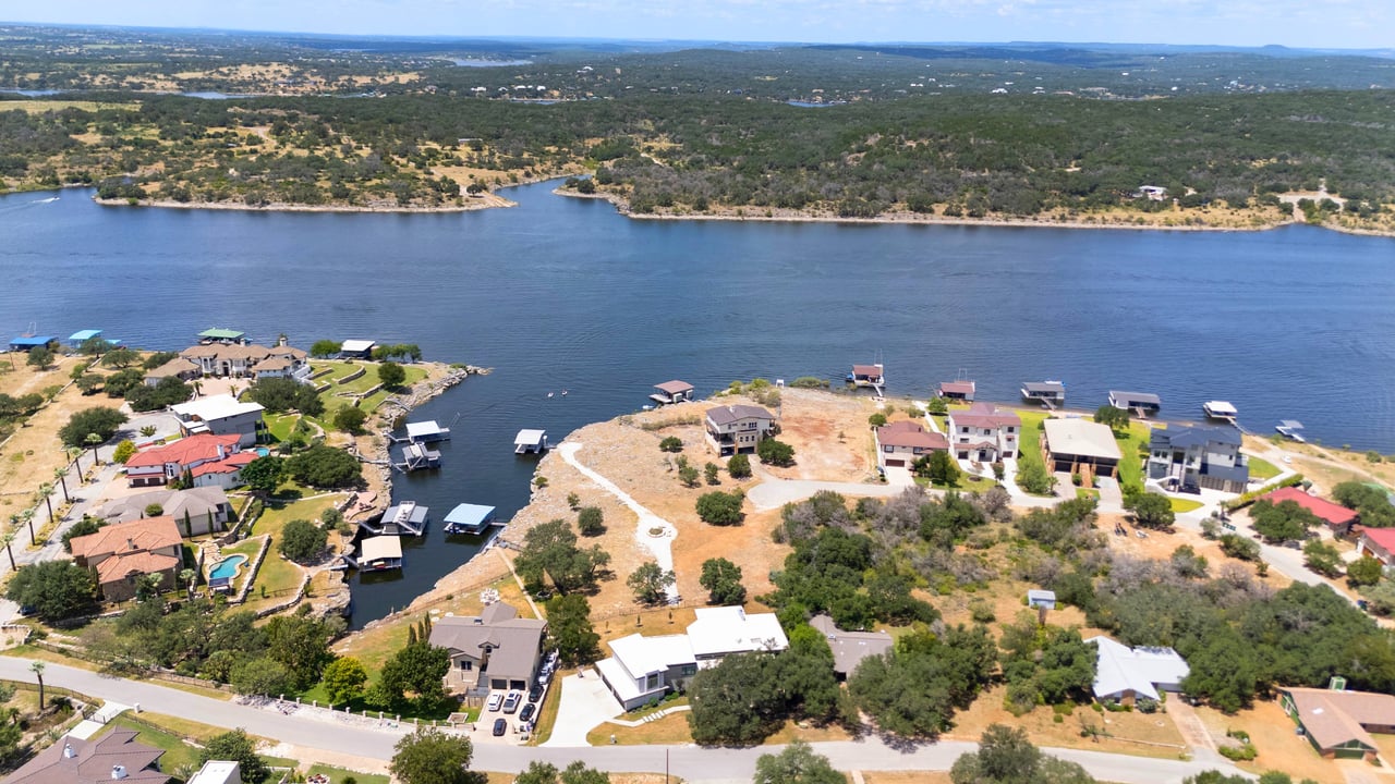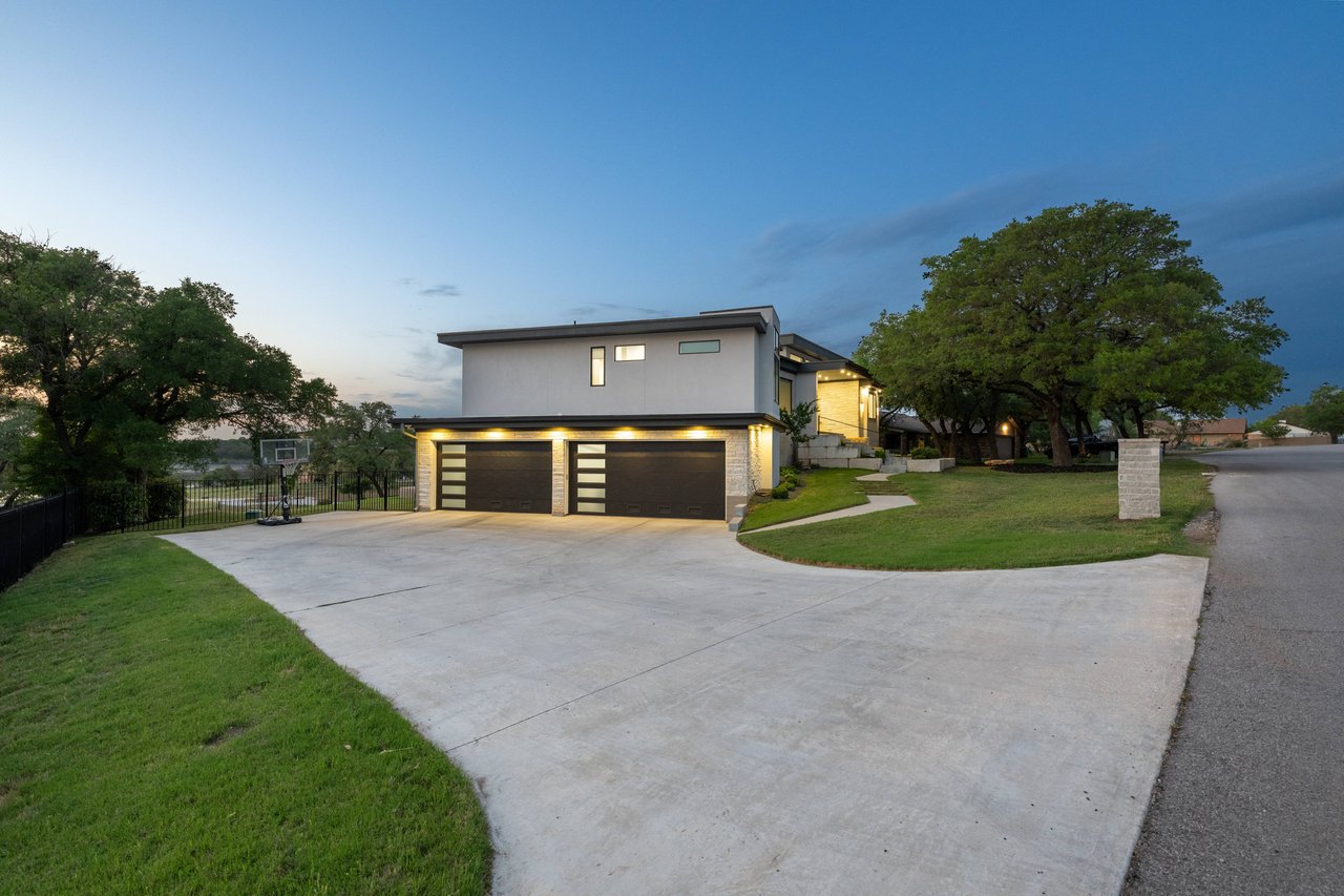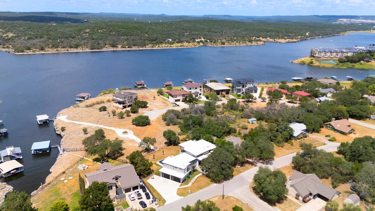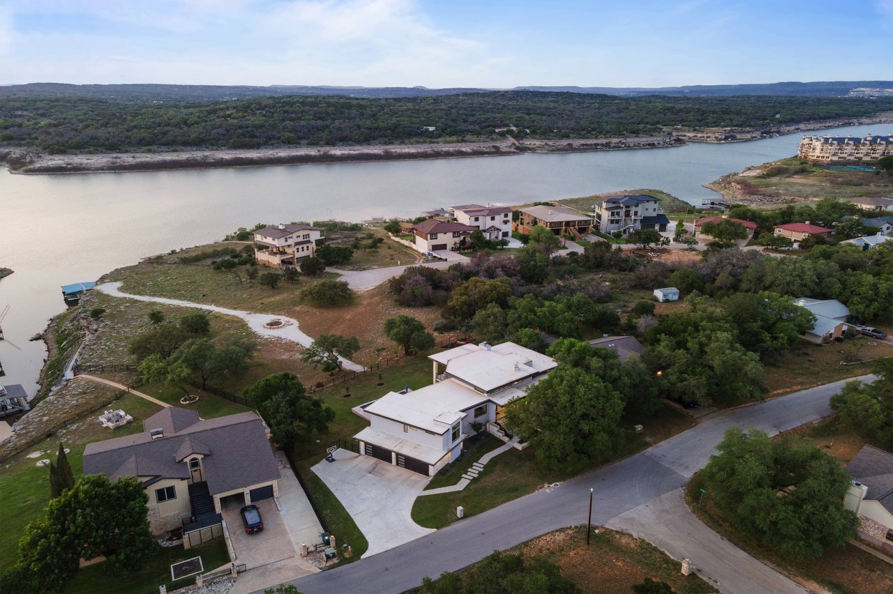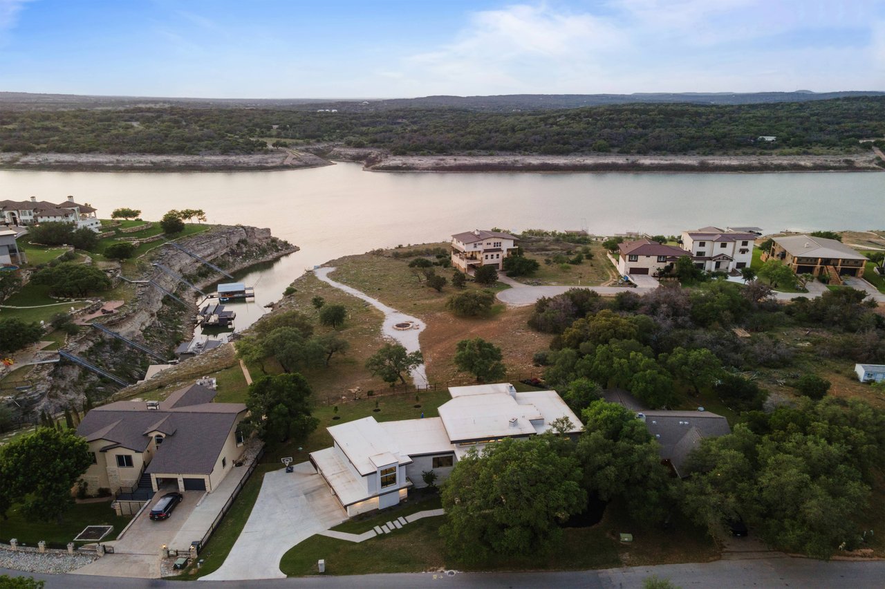 Perched on deep-water Lake Travis in Lago Vista, this exceptional 2019 Hill Country modern retreat captures the best of waterfront living with both cove and main-body access potential. Walls of windows frame sweeping Lake Travis and Hill Country views, while the hand-cut white limestone exterior blends seamlessly into the natural landscape. Overlooking the undeveloped beauty of Pace Bend Park, the setting offers rare privacy, dramatic scenery, and unforgettable sunsets—an ideal backdrop for a full-time residence, vacation home, or short-term rental opportunity.