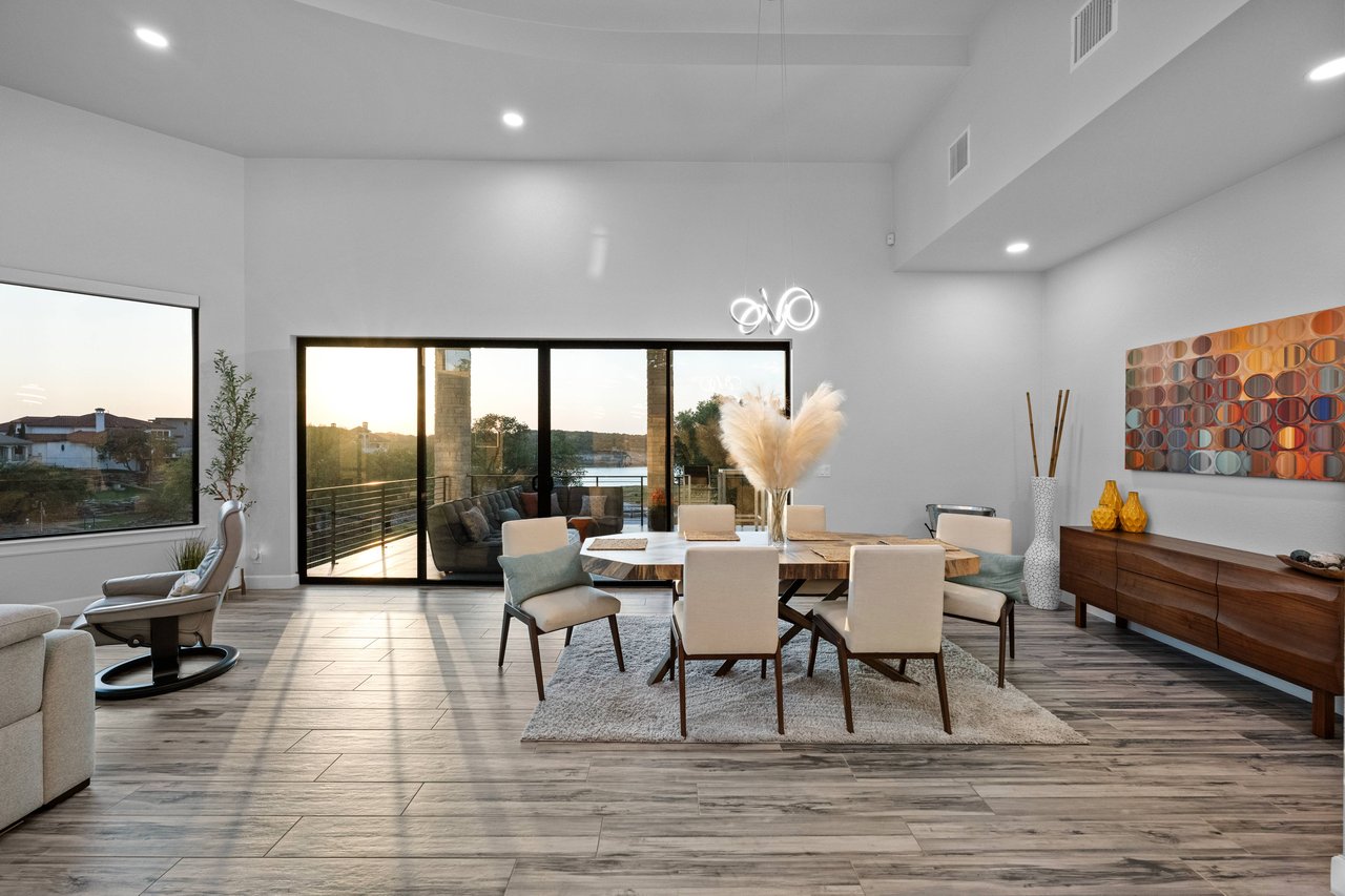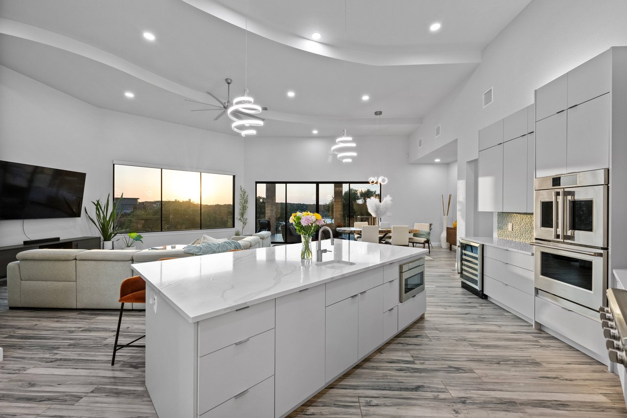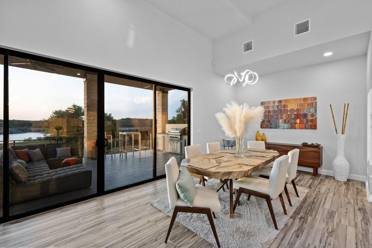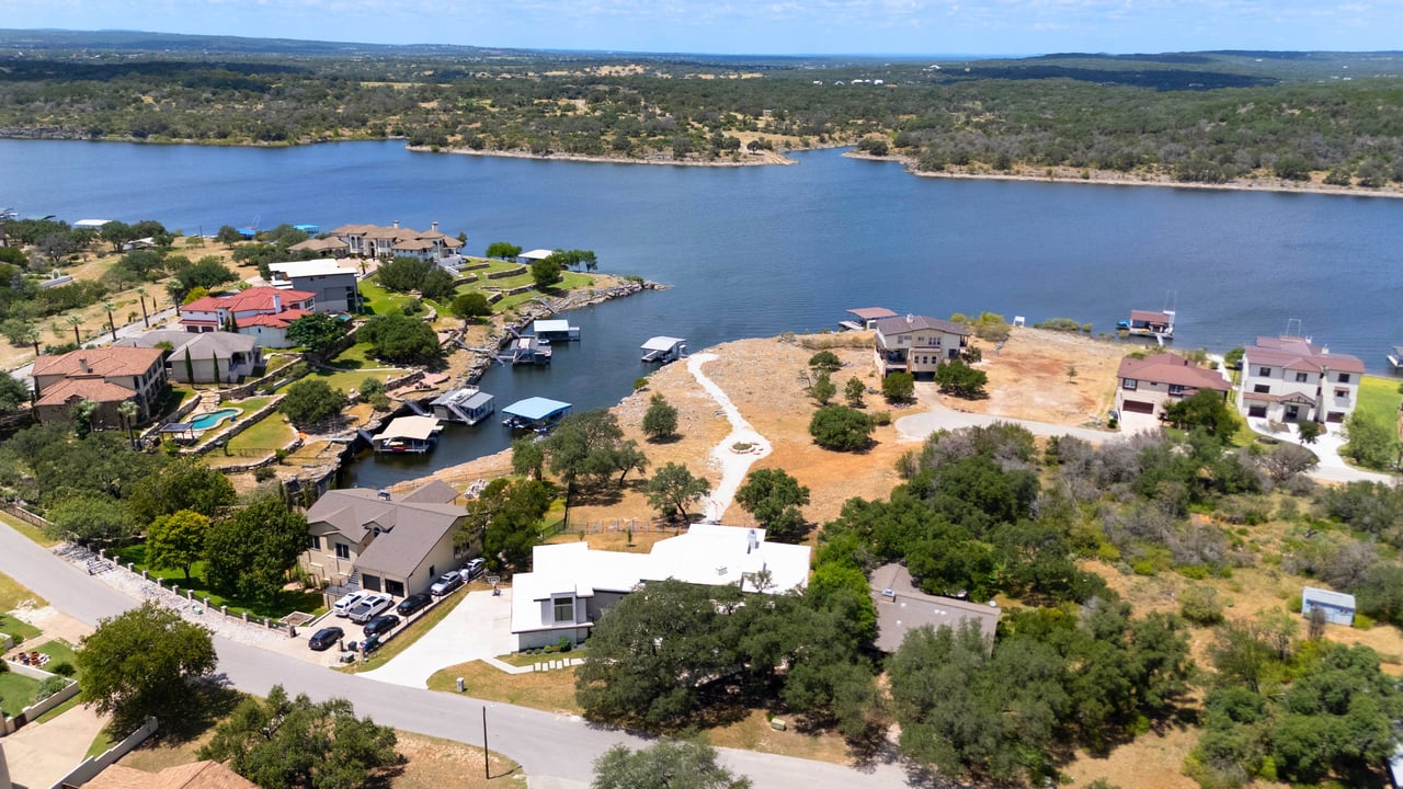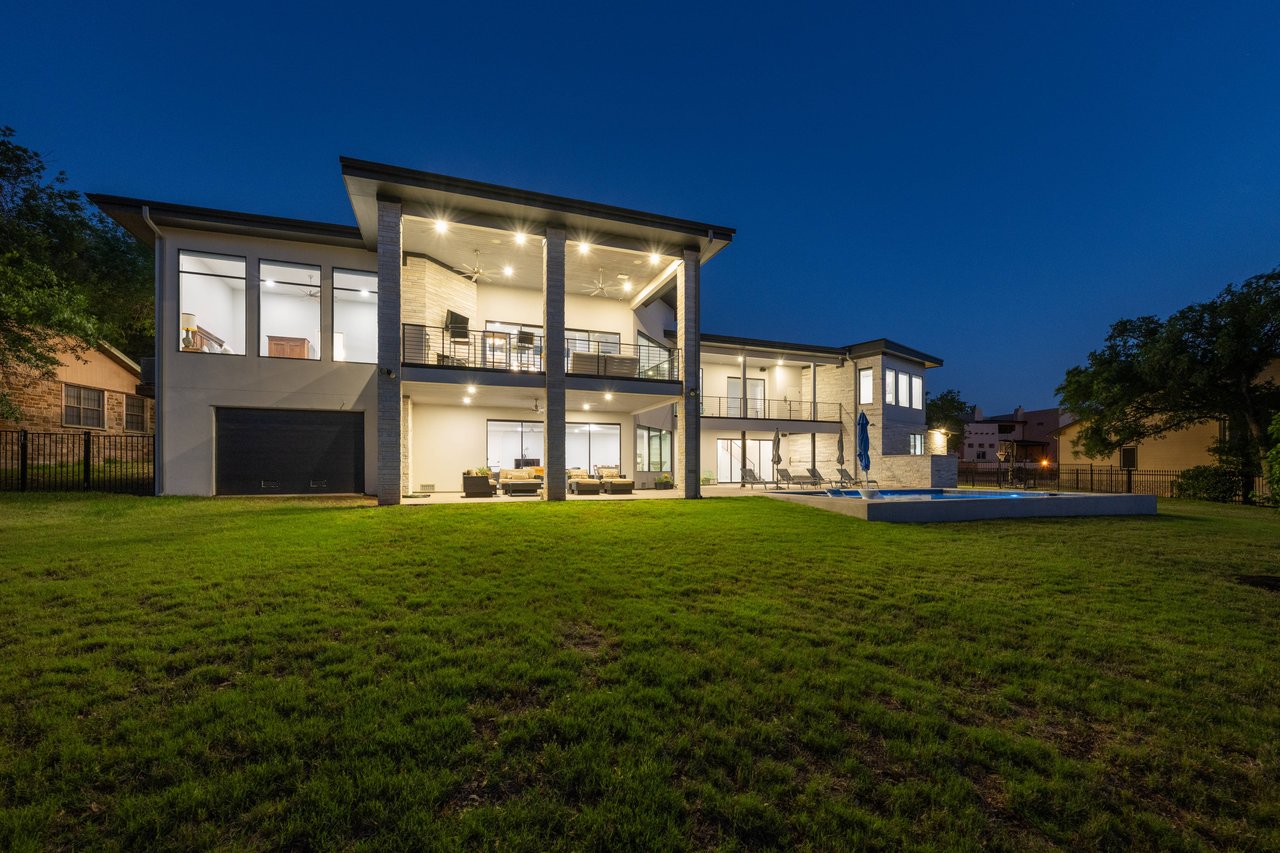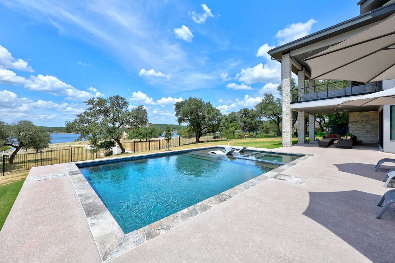 Perched on deep-water Lake Travis in Lago Vista, this exceptional 2019 Hill Country modern retreat captures the best of waterfront living with both cove and main-body access potential. Walls of windows frame sweeping Lake Travis and Hill Country views, while the hand-cut white limestone exterior blends seamlessly into the natural landscape. Overlooking the undeveloped beauty of Pace Bend Park, the setting offers rare privacy, dramatic scenery, and unforgettable sunsets—an ideal backdrop for a full-time residence, vacation home, or short-term rental opportunity.