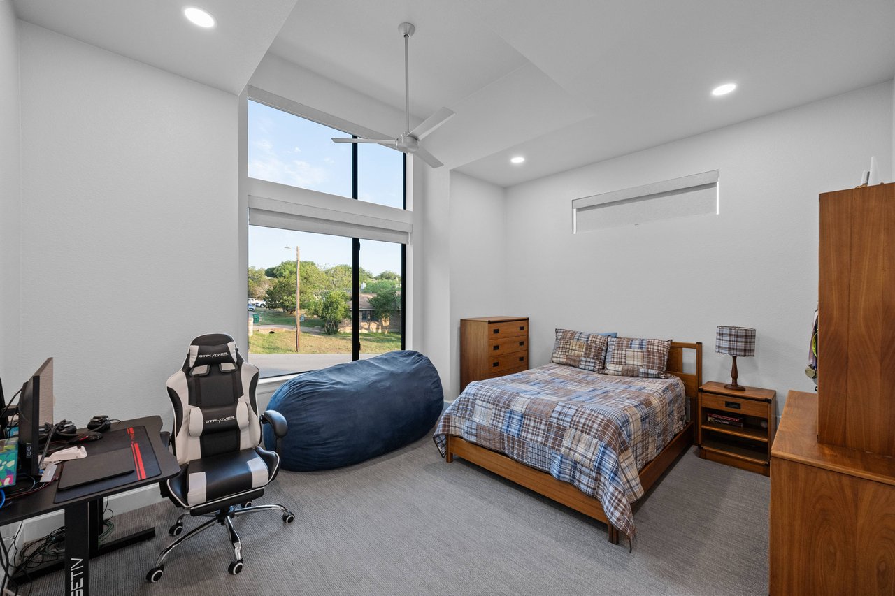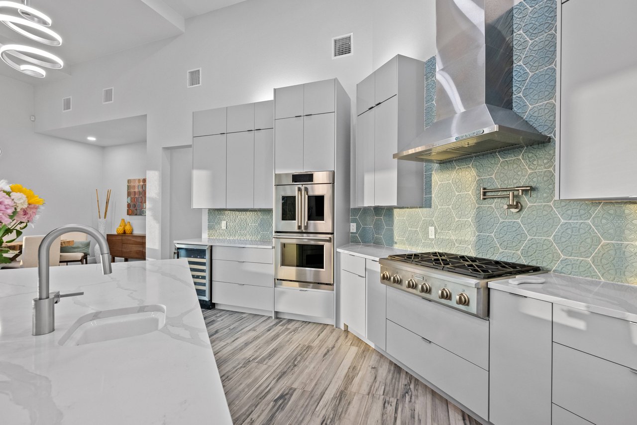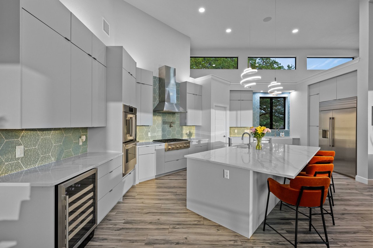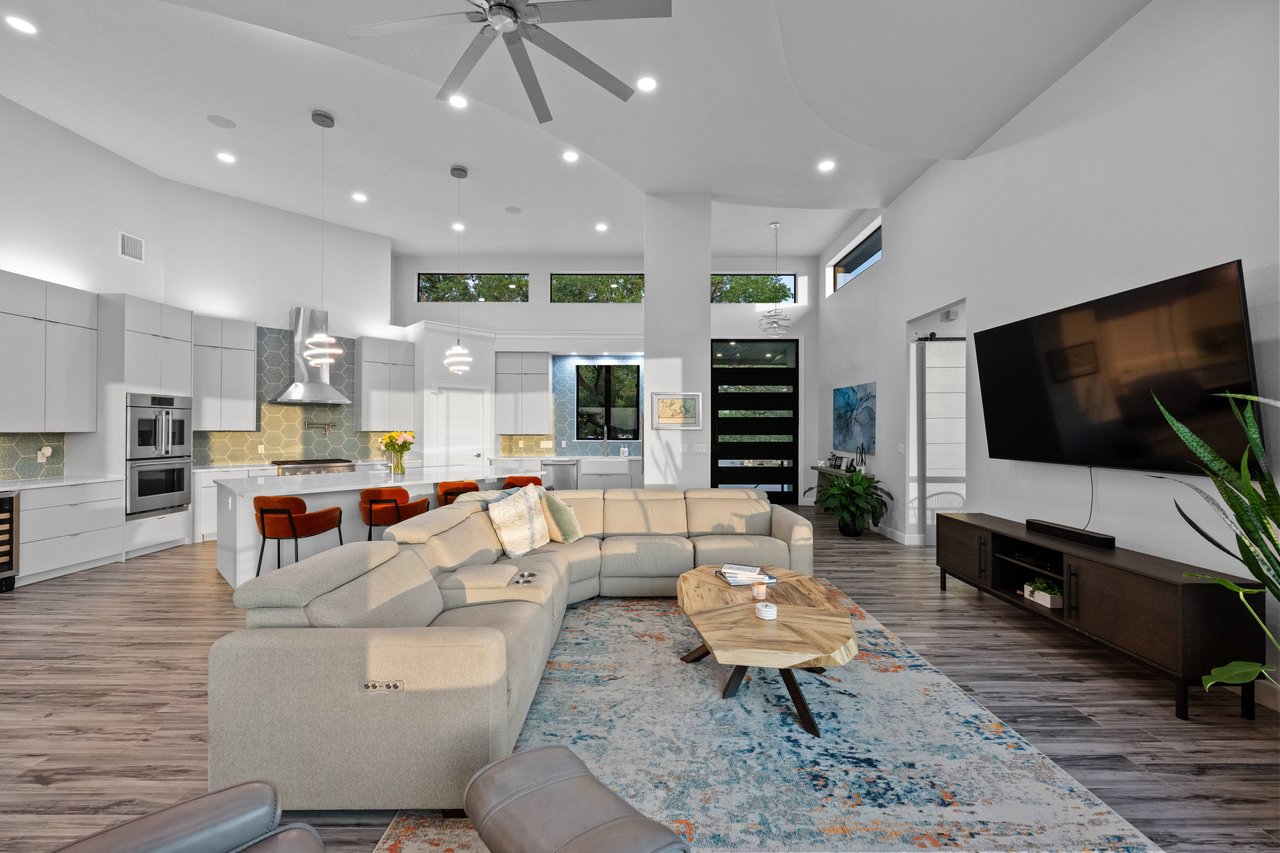 Inside, light and bright interiors are elevated by soaring 15+ foot ceilings, warm wood floors, and a thoughtfully designed open layout featuring four bedrooms, two-and-a-half baths, and two exceptionally large living areas—one easily convertible into a bunkroom. Quartz countertops, designer tile backsplashes, modern light fixtures, Big Ass Fans, and carefully curated uplighting and low lighting create a vibrant yet inviting atmosphere. Incredible storage throughout the home adds everyday practicality to the refined design.