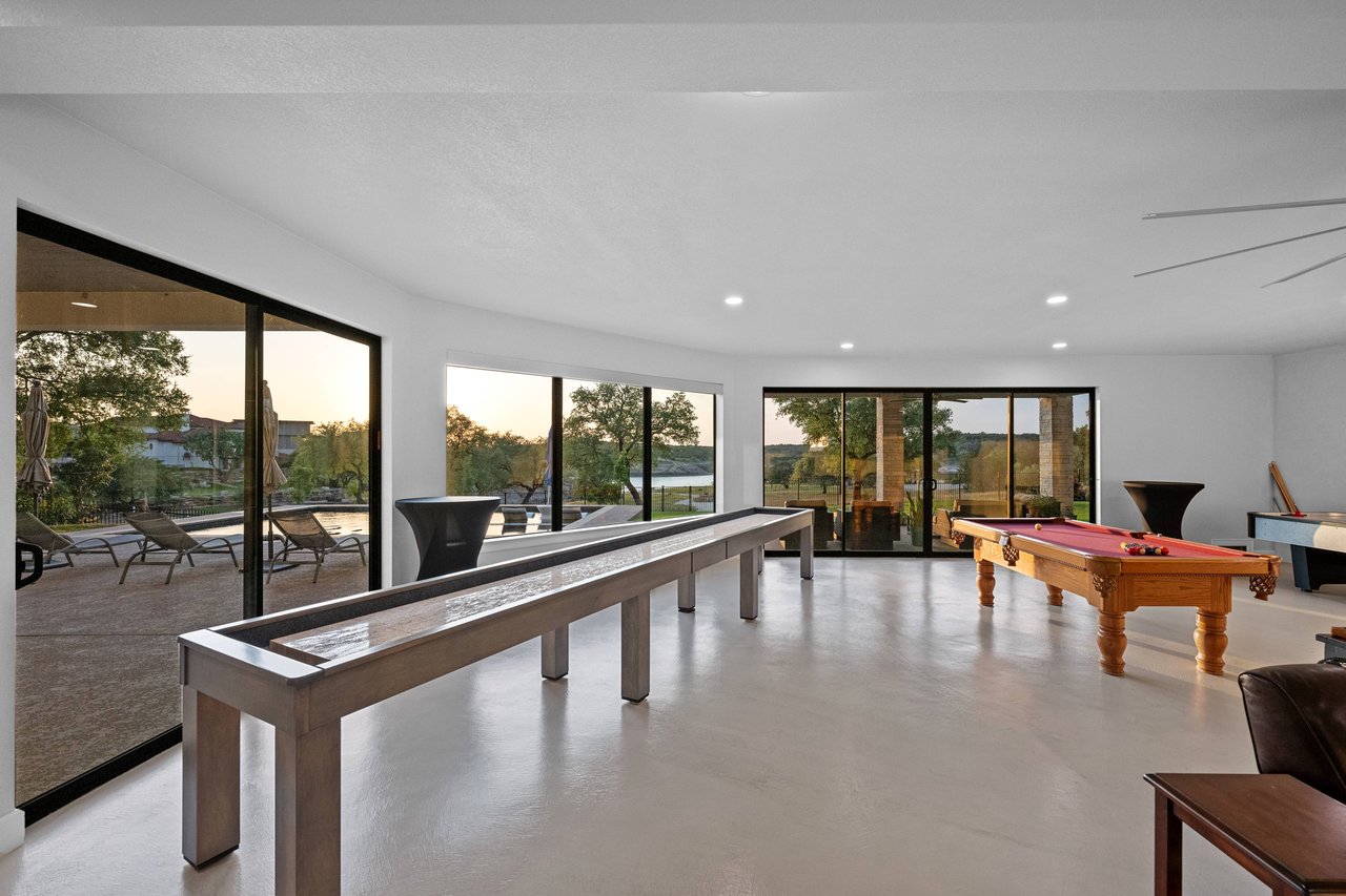 Outdoor living shines just as brilliantly, with a pool and spa overlooking the lake, plus an expansive deck complete with fireplace and outdoor kitchen—perfect for entertaining year-round. The oversized four-car garage is complemented by a second dedicated workshop garage large enough to accommodate a golf cart or small boat, while the impressive game room conveys with billiards, air hockey, shuffleboard, and more for endless fun. Don’t forget the reason you live on the lake – your own boat dock with easy access stairs and a walking/golf cart path already created. Over 2 acres provides ample space for all to play, on deep water cove and main Lake Travis waterfront access (an additional .82 acre waterfront lot can also be purchased separately).