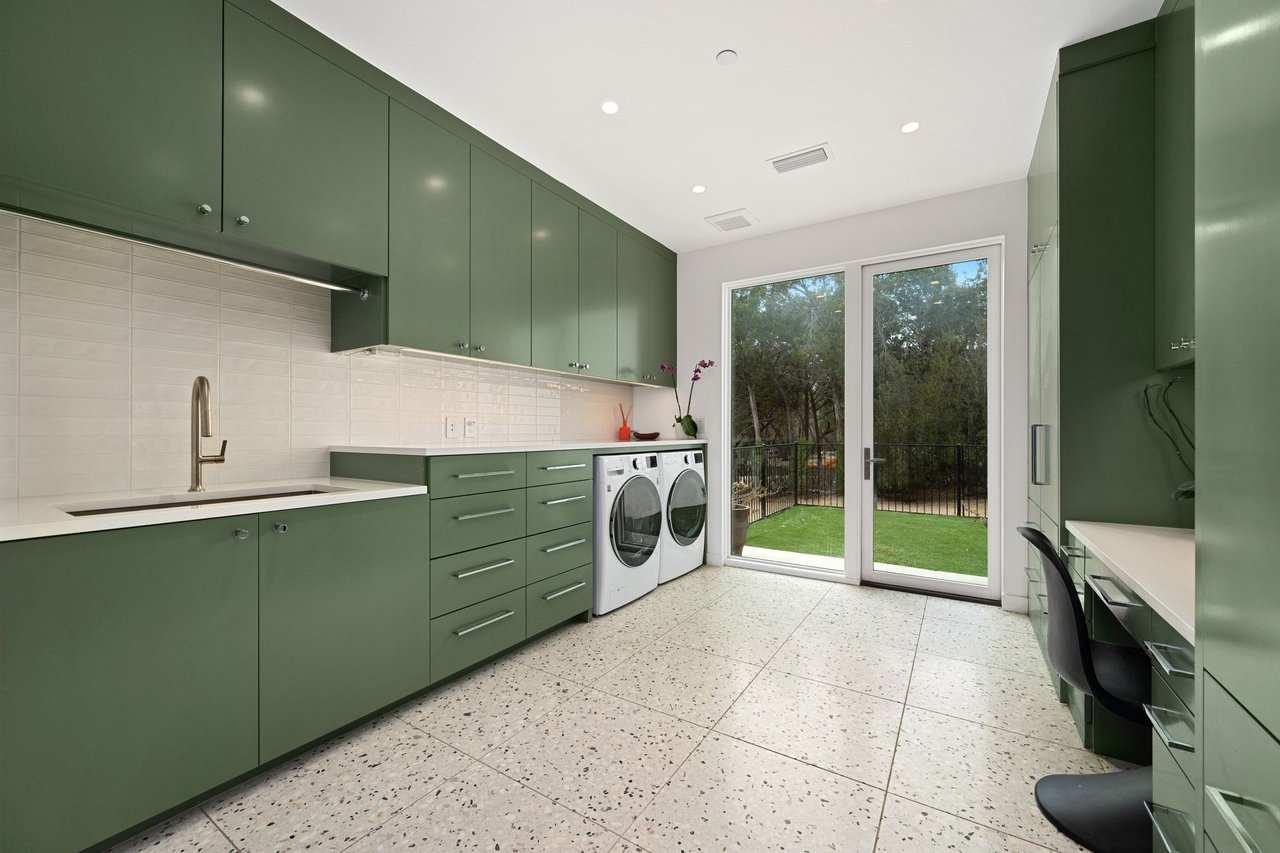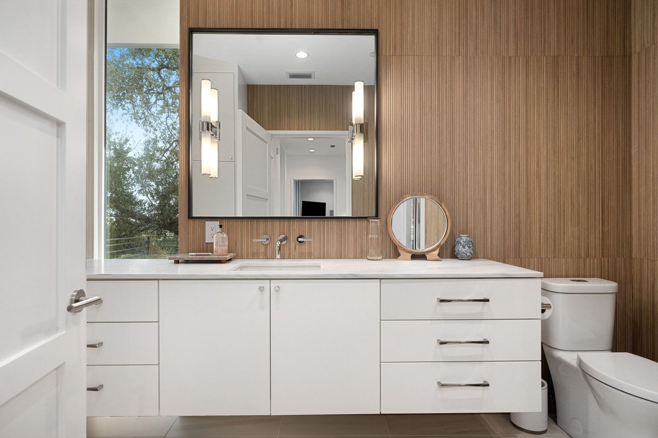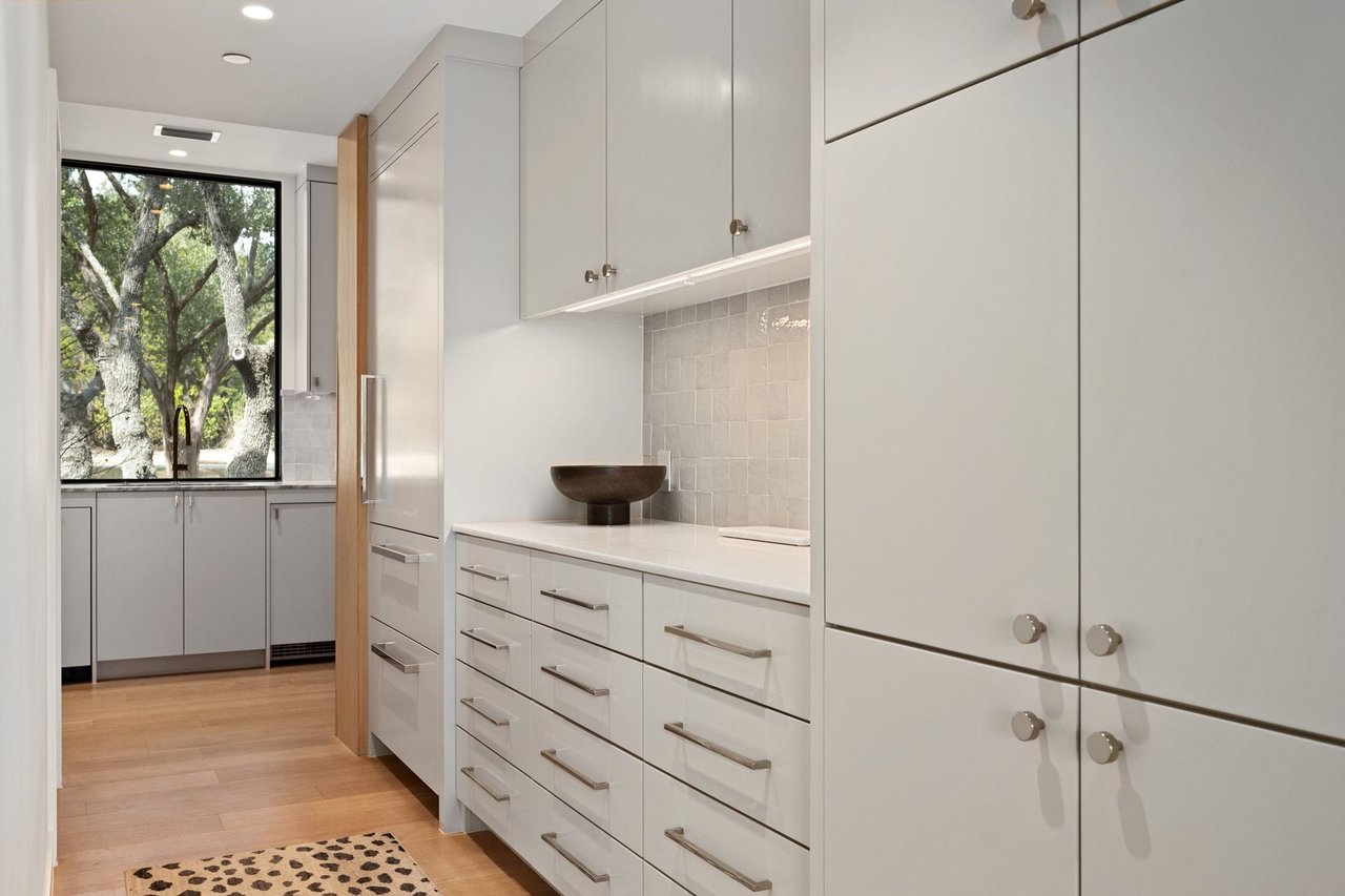 299 Cedar Oak Drive presents a newly constructed and thoughtfully designed three-story residence set on ~1.12 private acres in Eanes ISD. With 5 bedrooms, 5 full and 2 half bathrooms, the immaculate contemporary home offers generous space for both daily living and entertaining. The main level opens to a light-filled foyer with views of the pool and patio beyond. High ceilings and beautiful wood design elements harmonize in the open living room with a stone fireplace and the stunning kitchen outfitted with Wolf and Sub-Zero appliances, and statement stone countertops and backsplash. A separate prep kitchen adds convenience for entertaining, while a media room with a full bar enhances the home’s gathering spaces.