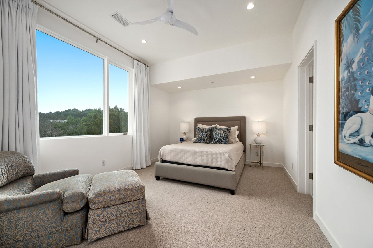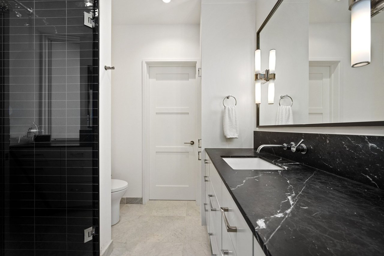 The primary suite is privately positioned and features a spa-inspired bath with dual vanities, a soaking tub, a steam shower, and an oversized walk-in closet. On the lower level, a private casita-style guest apartment with separate access includes a bedroom, full bath, kitchenette, gym, and flexible living space, making it ideal for guests or multigenerational living. The third level offers three additional bedrooms, each with en-suite baths and walk-in closets, along with a secondary lounge area.