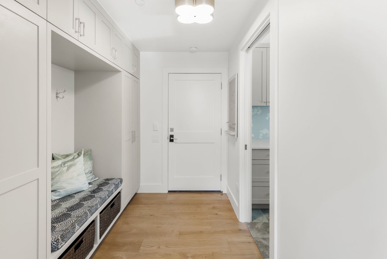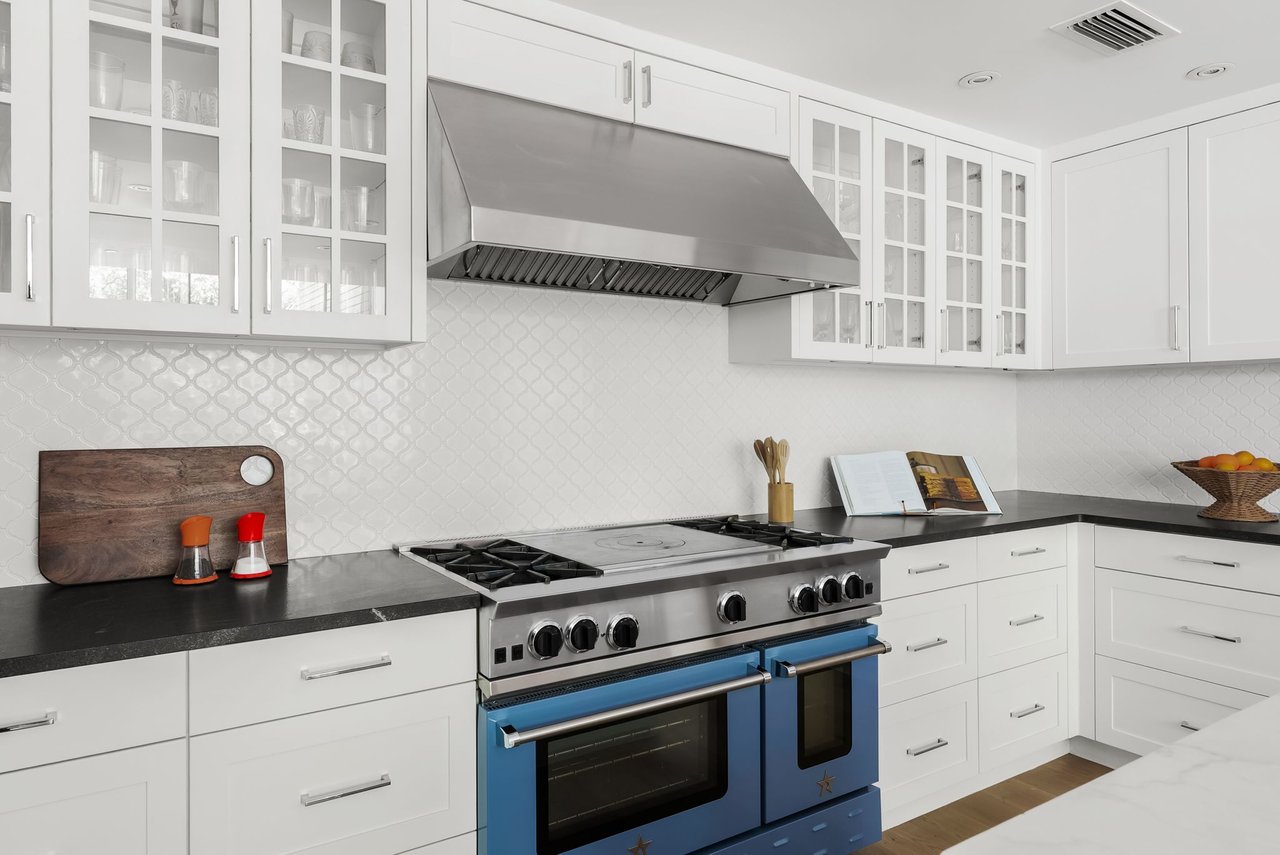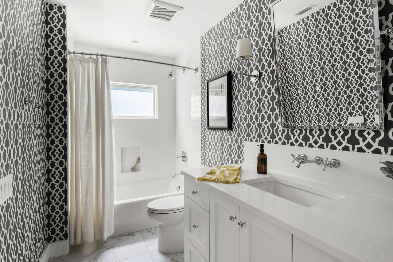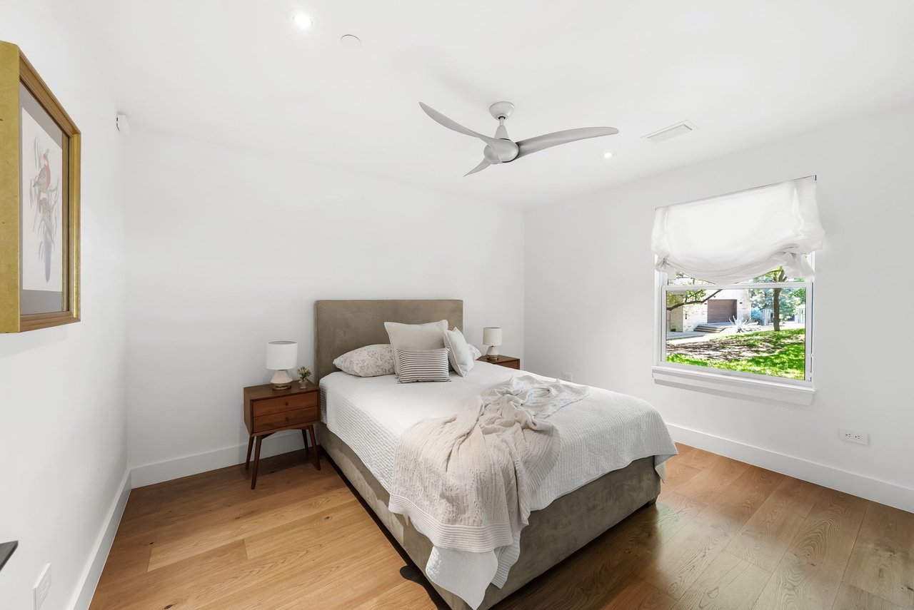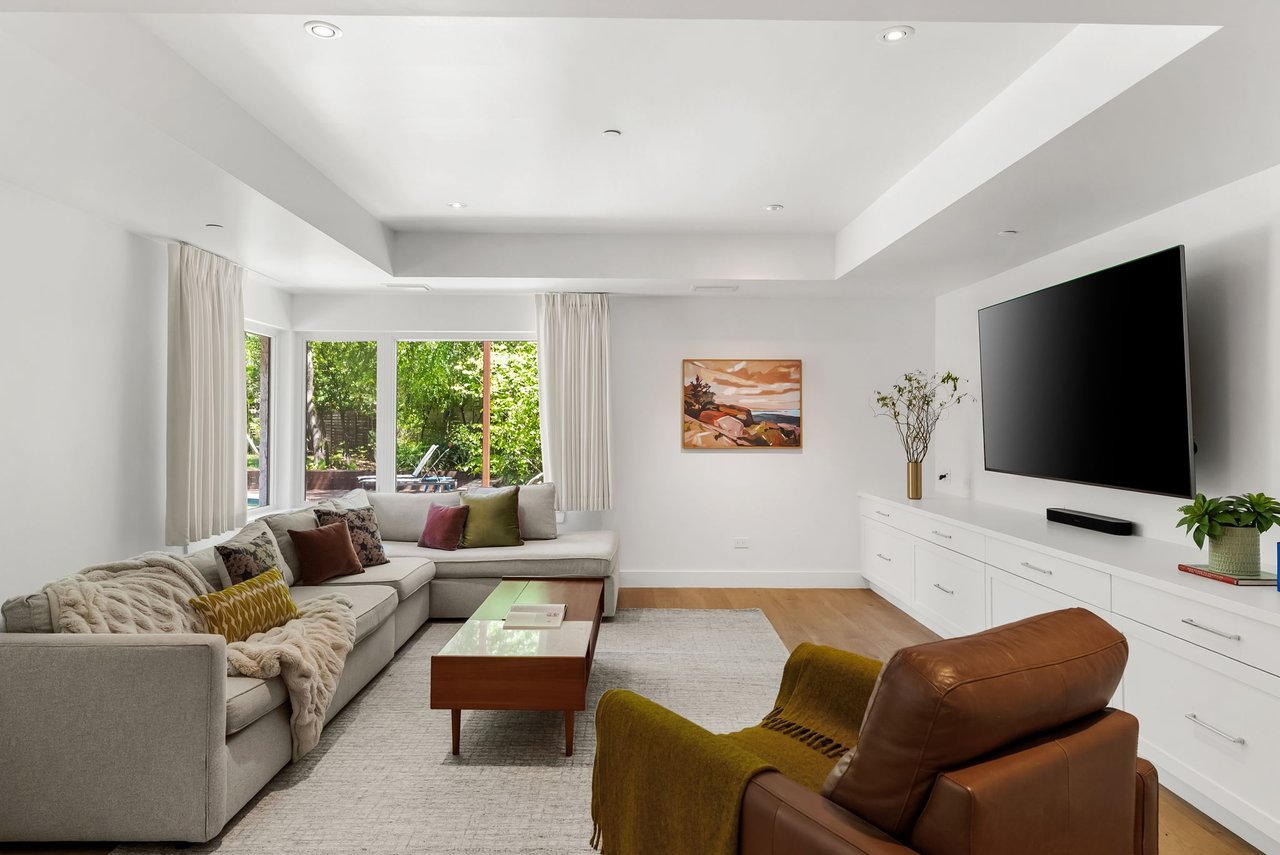 Upon entry, you’re welcomed by a stunning living room where floor-to-ceiling windows frame serene views of the pool and lush backyard, filling the space with natural light. A striking fireplace and custom built-ins serve as both functional elements and architectural focal points. The pristine, upgraded kitchen is equally impressive, featuring ample cabinetry, high-end stainless steel appliances, including a BlueStar range, and an oversized center island with bar seating. A dedicated office with a full wall of custom built-ins offers an inspiring work-from-home environment, while the secondary living room could also function as a fourth bedroom with an en-suite bathroom and closet.