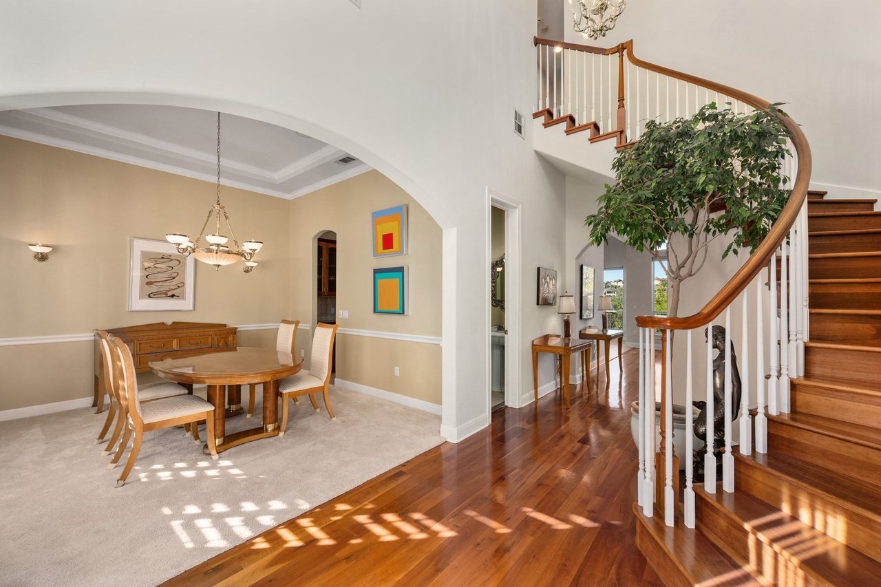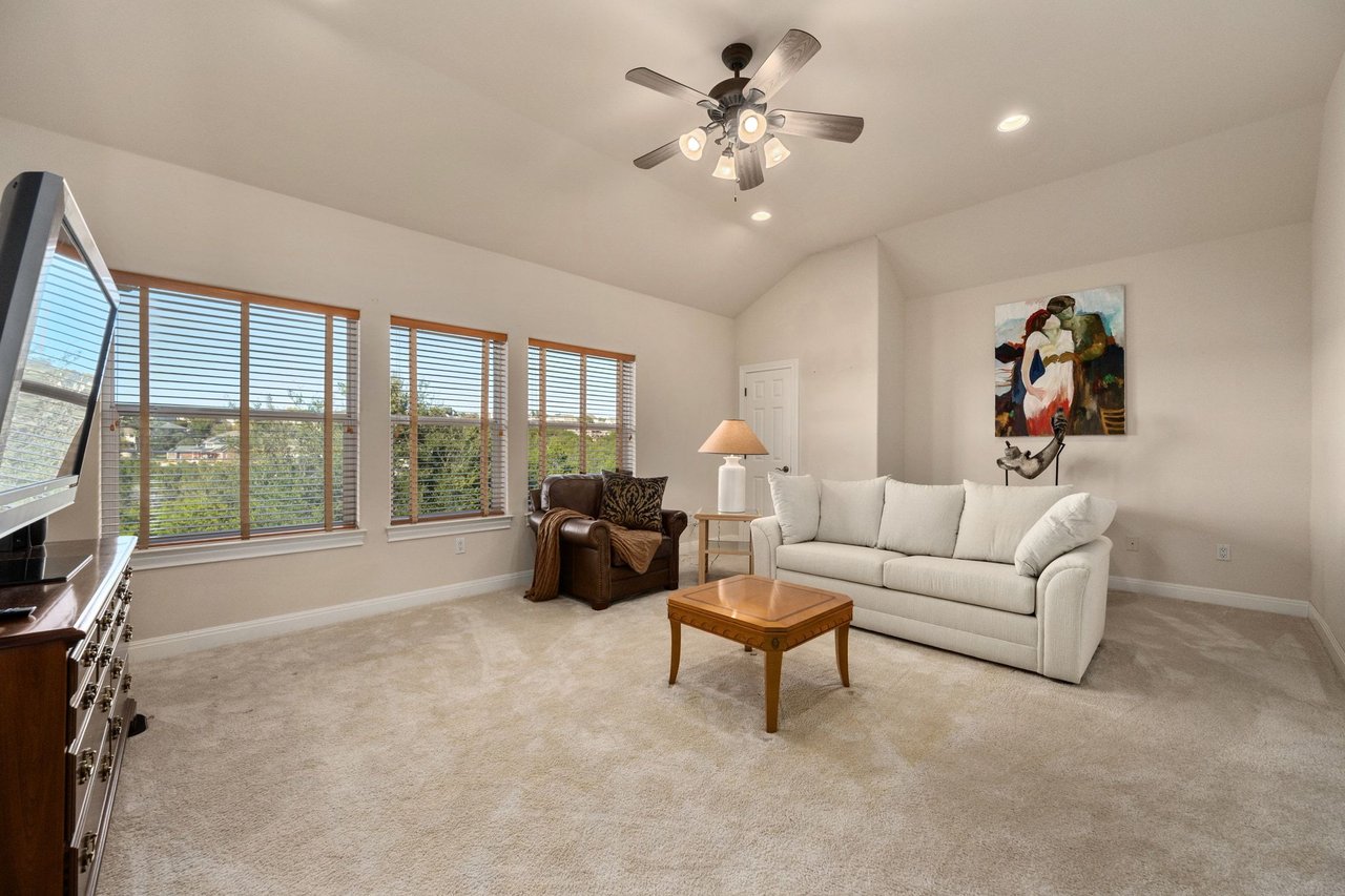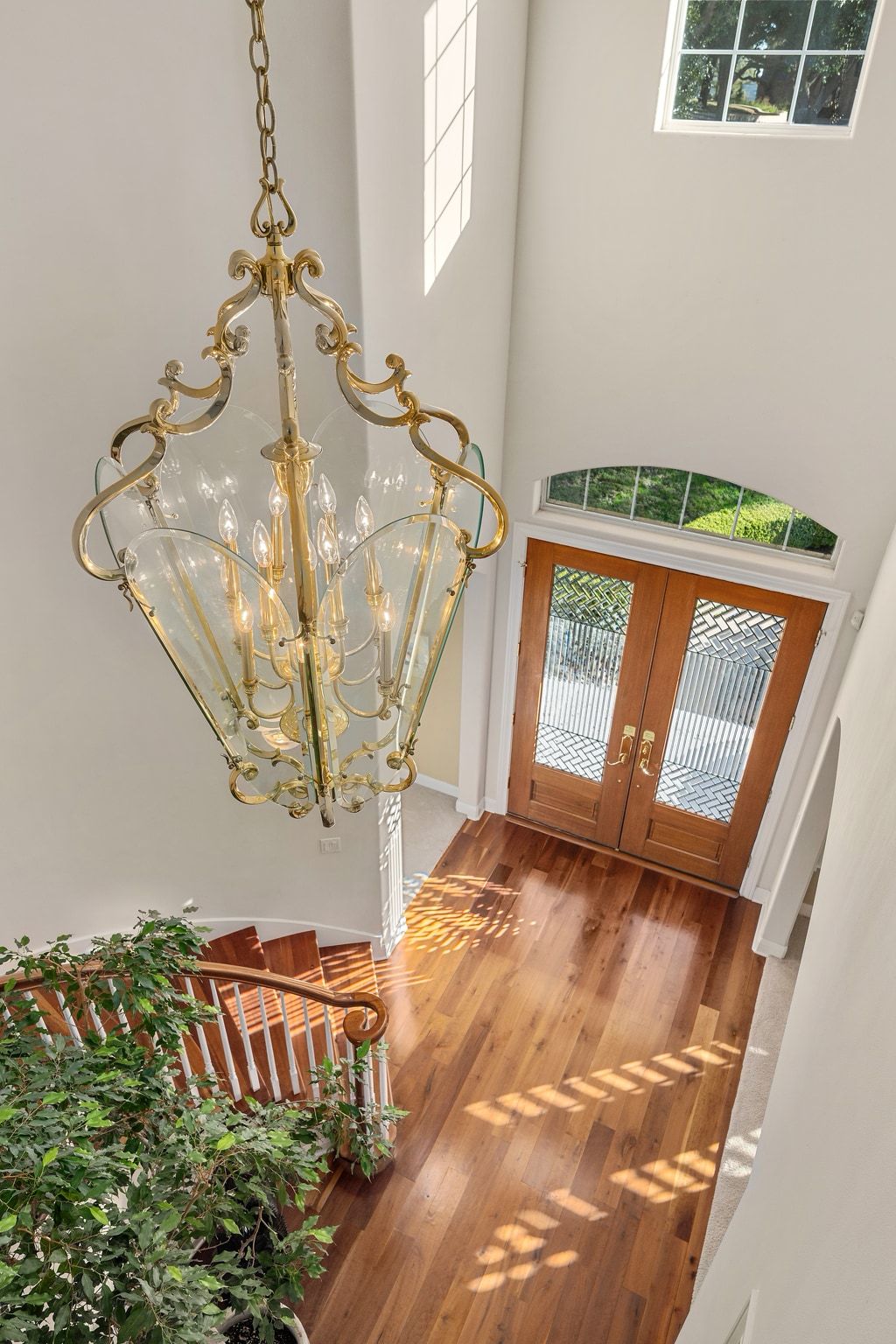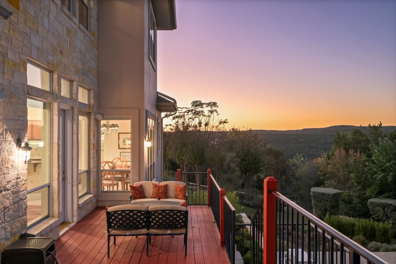 This exquisite Hill Country home offers panoramic views, a resort-style pool, and beautifully maintained interiors designed for elevated everyday living. A dramatic double-height entry foyer with a sweeping staircase makes an unforgettable first impression, drawing the eye through expansive windows to the scenic landscape beyond. Hardwood floors, abundant natural light, and a spacious living room with a fireplace define the main gathering space, creating a warm and inviting atmosphere ideal for both relaxing and entertaining.