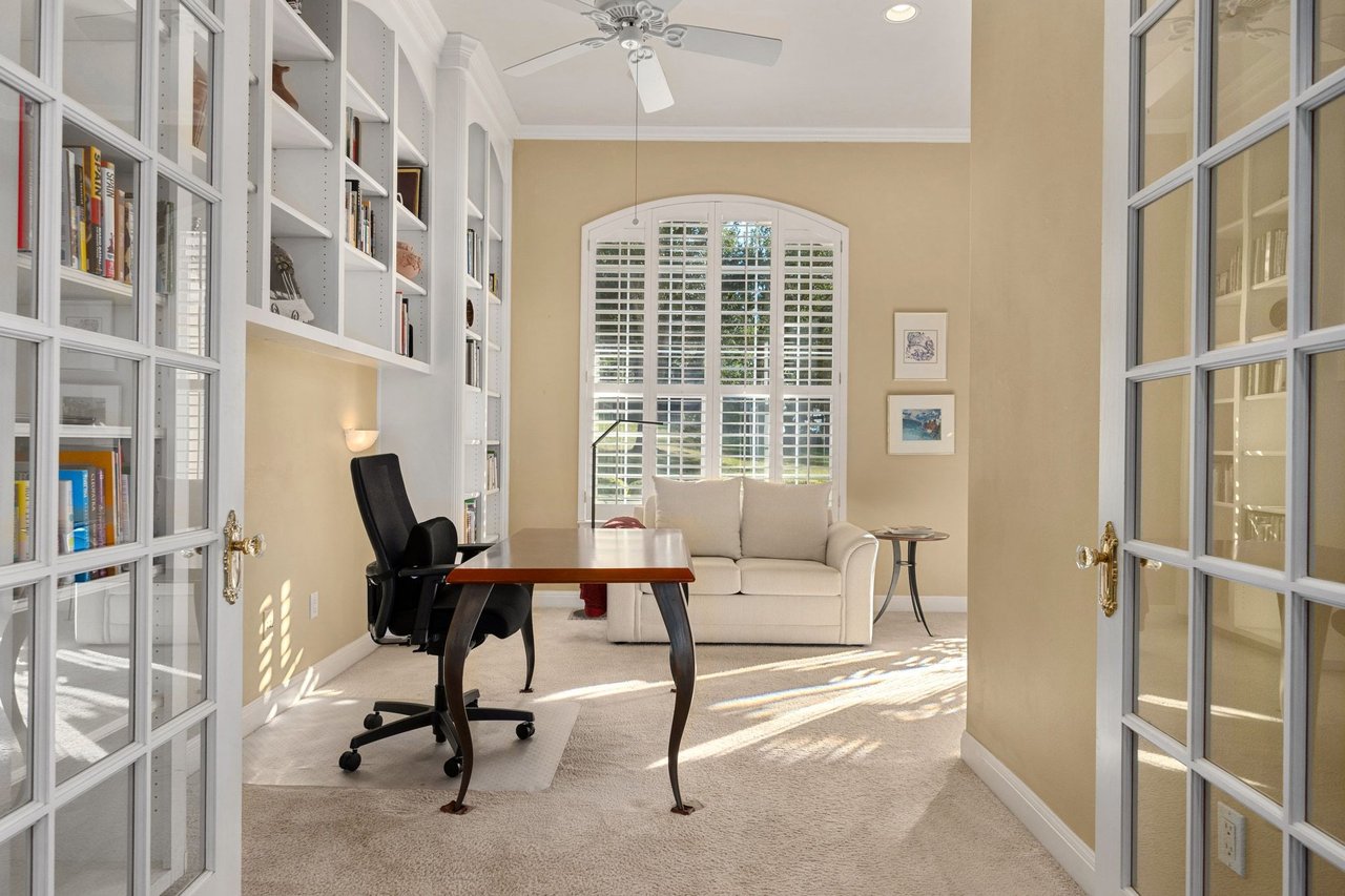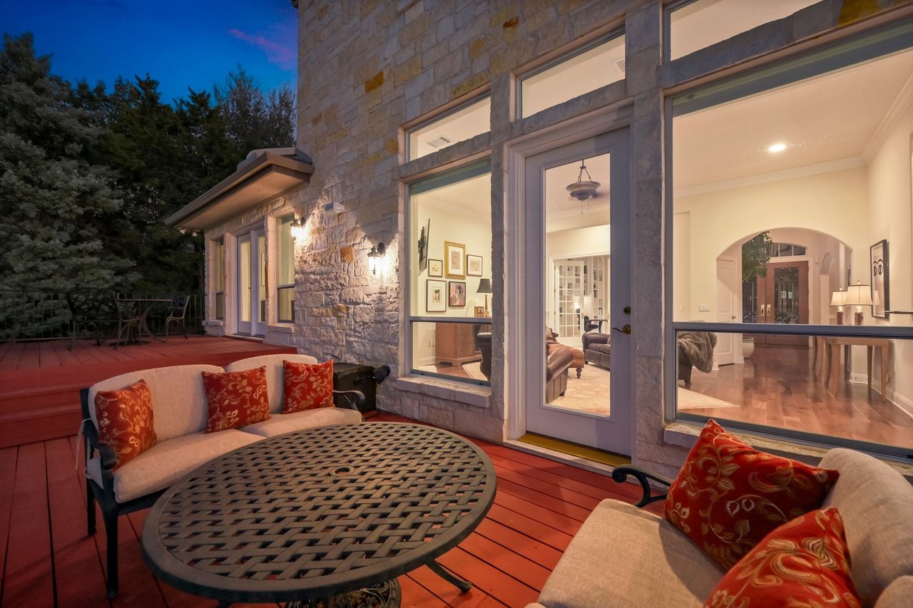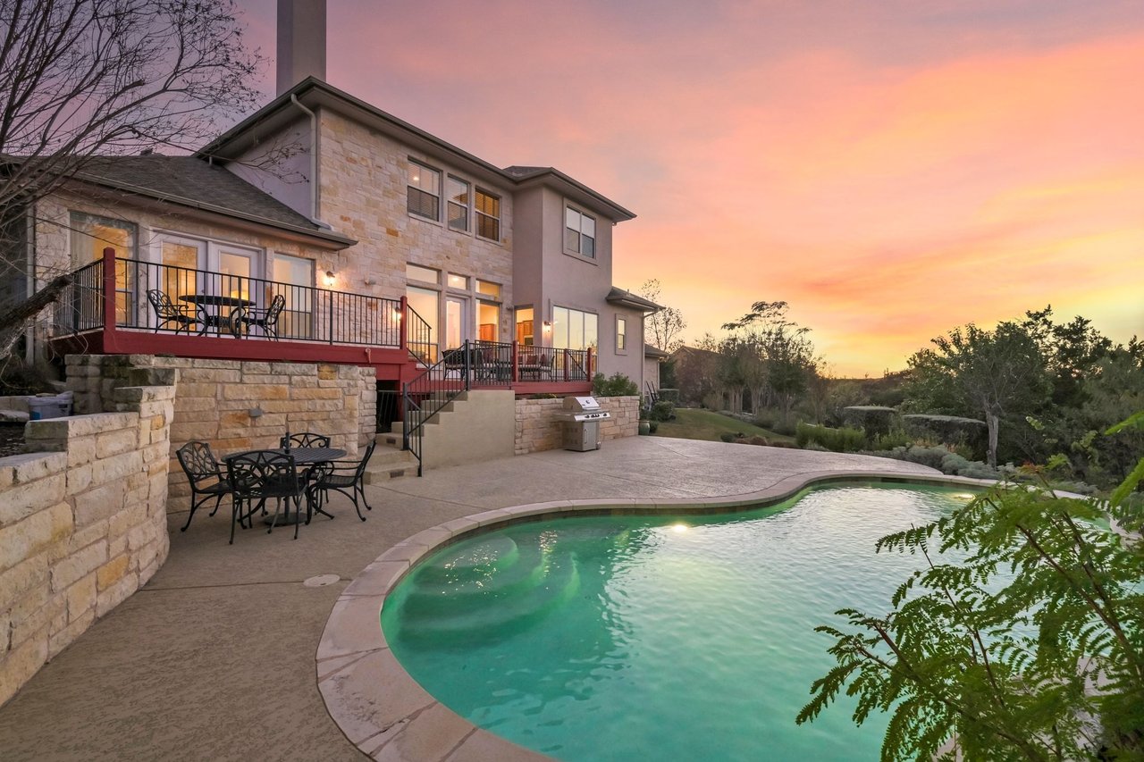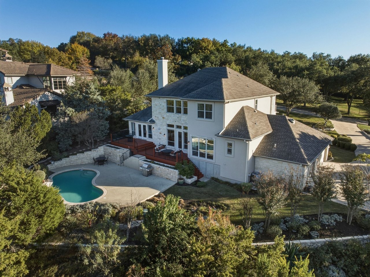The thoughtfully designed kitchen features stainless steel appliances, including a double oven, and flows seamlessly into a breakfast nook framed by large windows that capture the surrounding Hill Country views. A private study with custom built-in shelving provides an ideal home office or library, while a generous game room with a wet bar offers additional space for gathering. Outdoor living is a standout, with an expansive deck and resort-style pool surrounded by mature trees and lush landscaping, creating a private retreat perfect for entertaining or unwinding. An attached three-car garage adds convenience and functionality.
