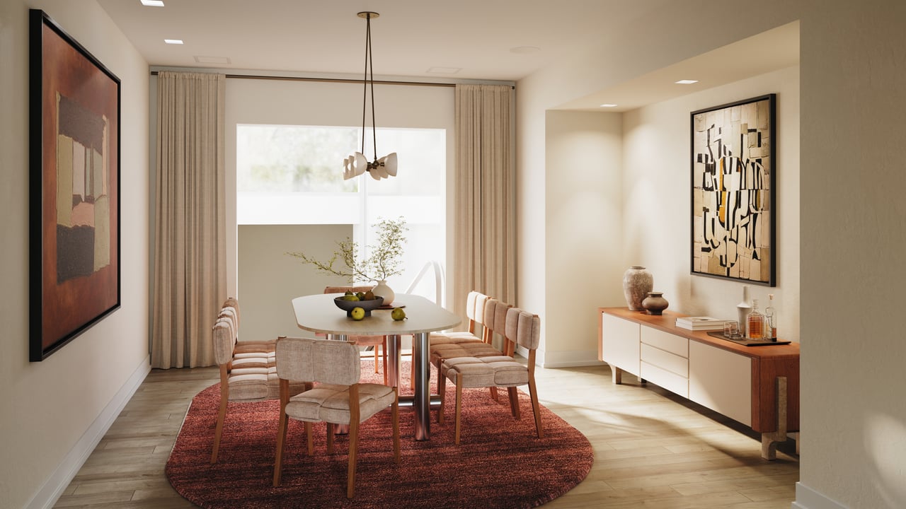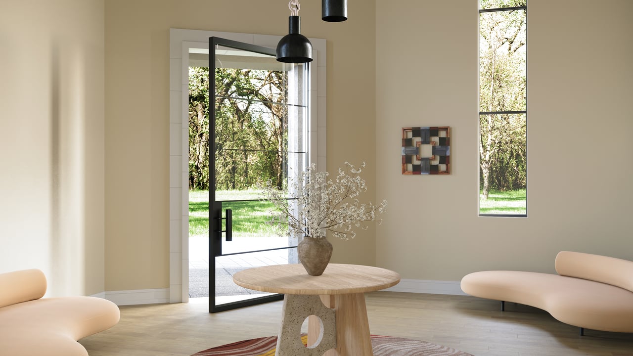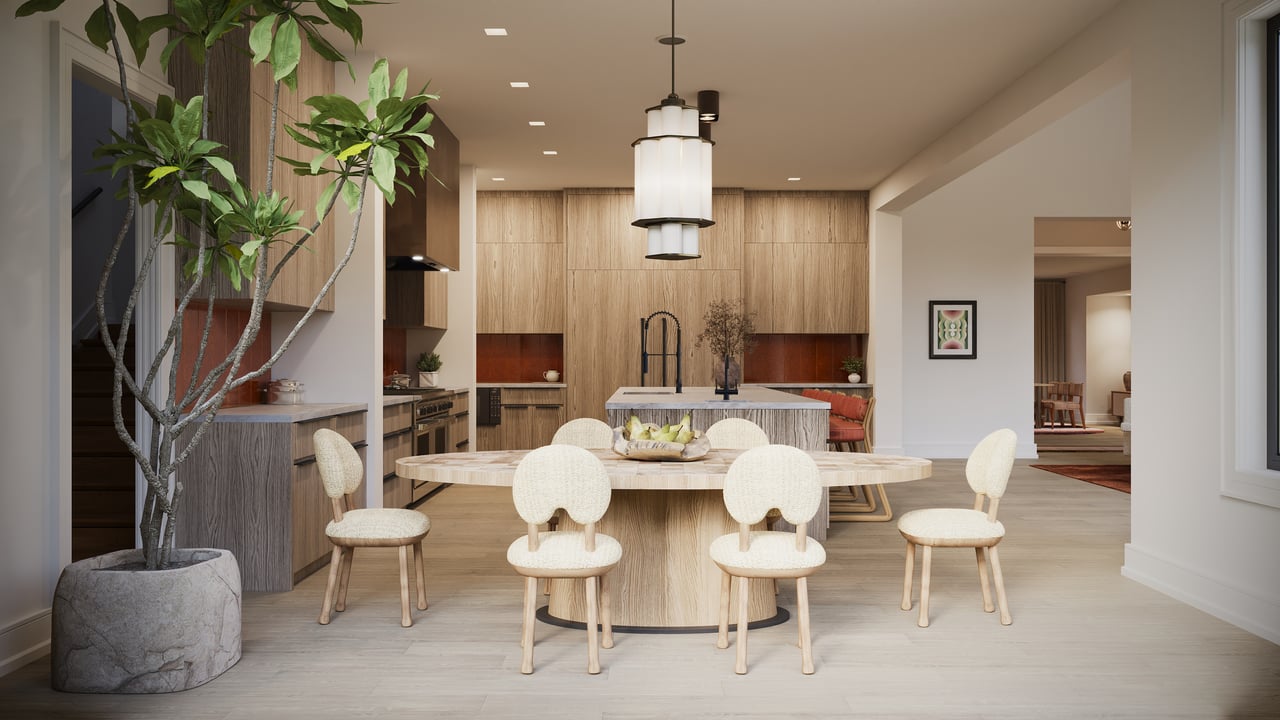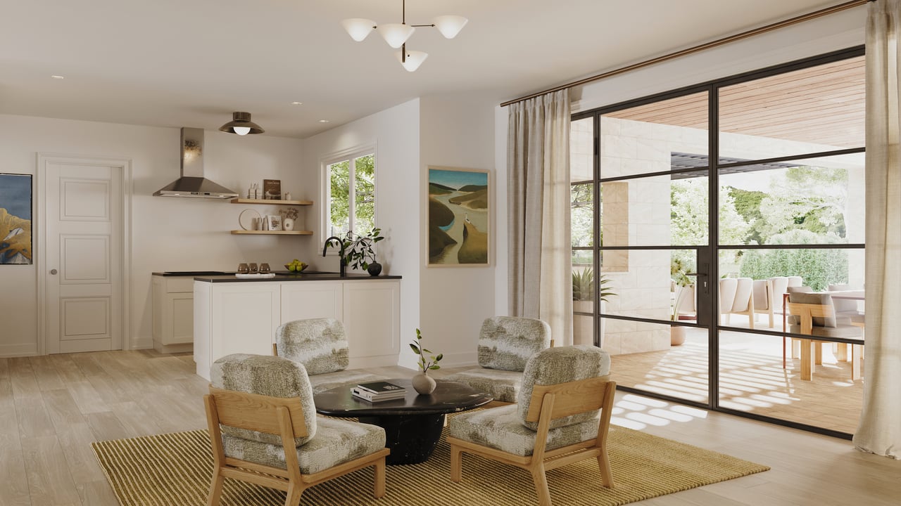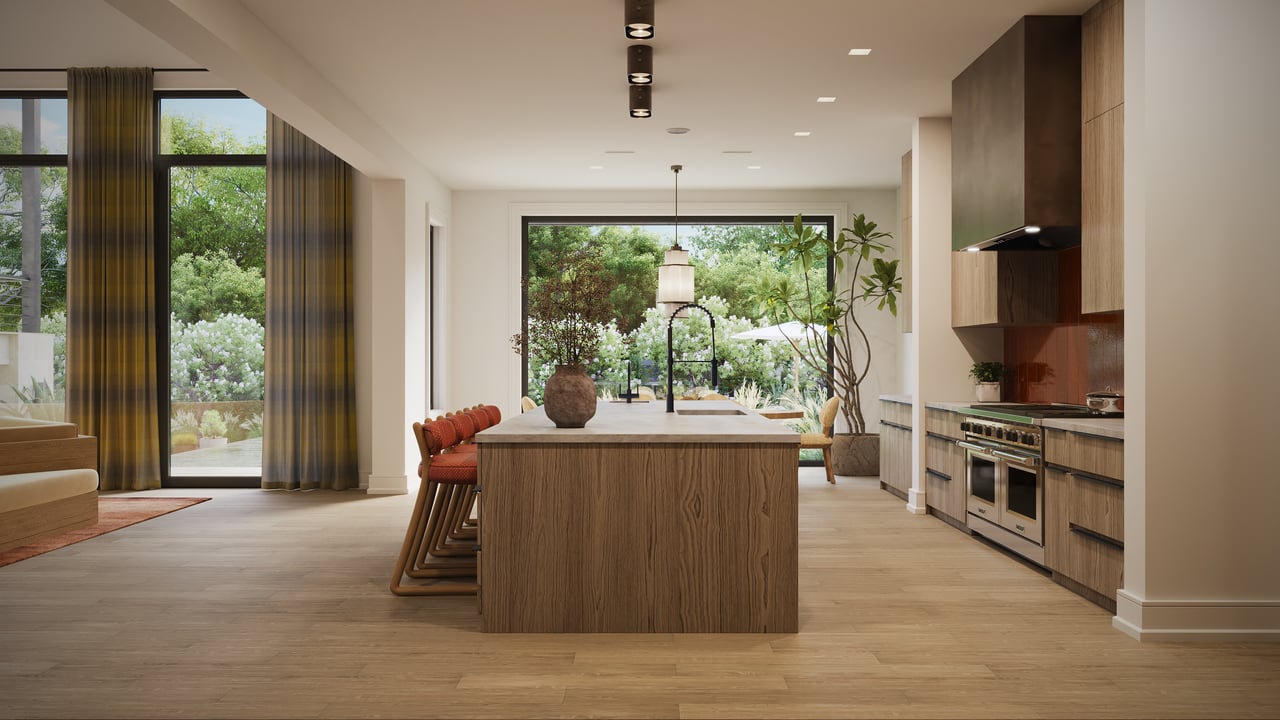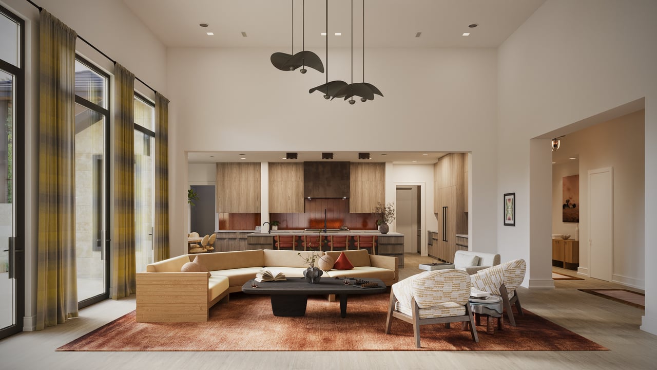 Natural light–treated as its own design material–is a pillar of the home’s allure. In the living room, three double-height pivot doors with single-pane glass allow natural light to pour inside with a stunning view of the infinity-edge pool and grounds. The hardwood floors were carefully selected for the way the light reflects off them, another representation of how no detail was overlooked in the construction process.