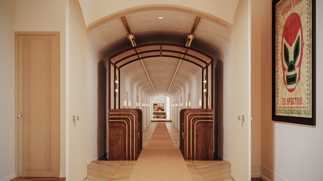 The Spine is a wholly unique innovation that connects all three buildings, inspired by the transportive powers of a hotel hallway. With an emphasis on warmth, functionality, and accessibility, the smartly designed People-Mover carries people, luggage, and heavy boxes down the Spine, to and from the gym and guest house to the main residence. In the Texas heat, use the People-Mover to avoid high temperatures outdoors and appreciate the security of not having to go outside to access any area of the compound. The Spine showcases the attention to detail that abounds in every decision of this property’s design.