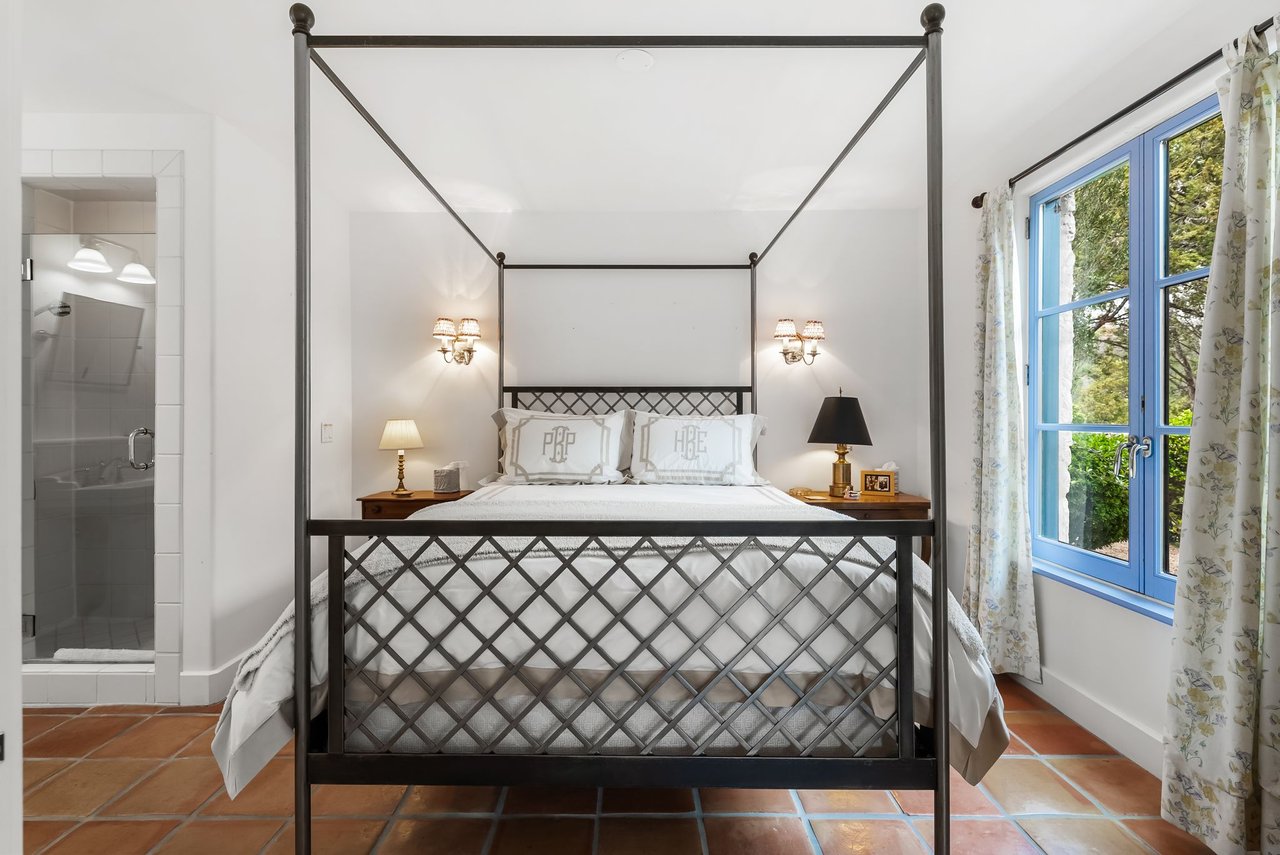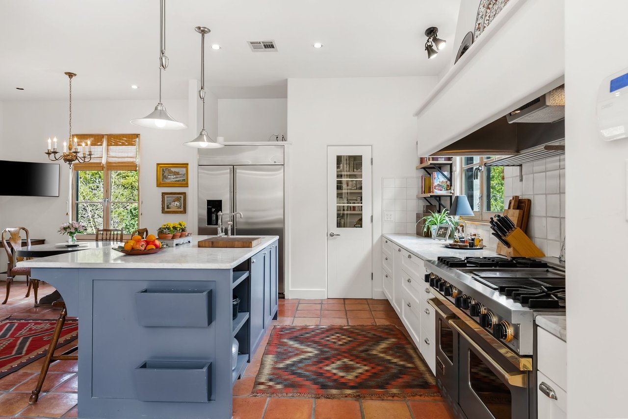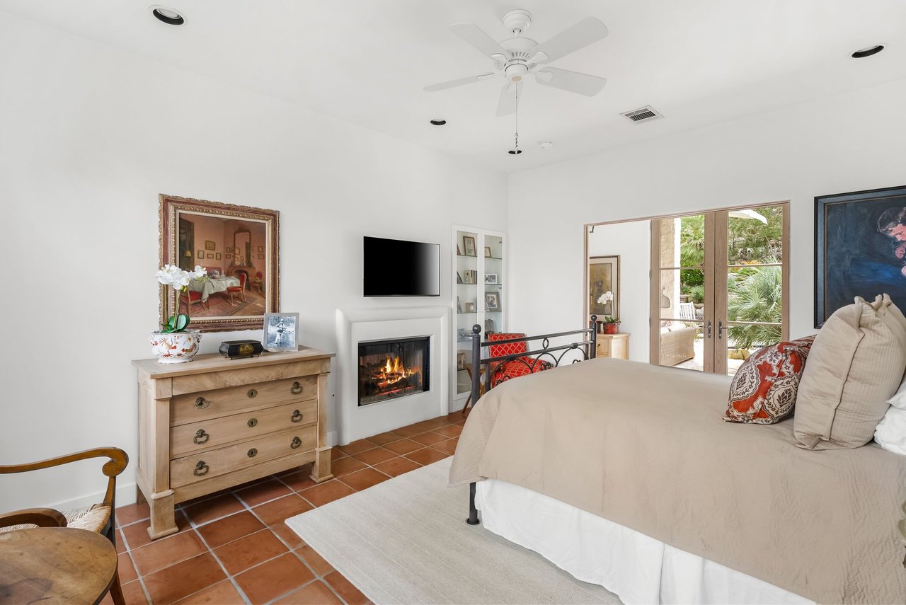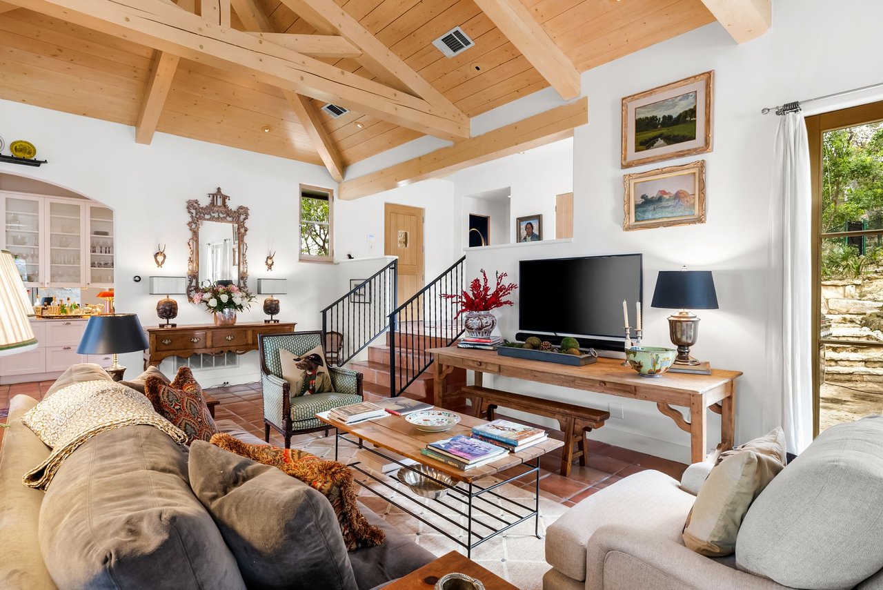 Character defines the interiors, where large windows, high wood vaulted ceilings, Saltillo floors, and French doors bring in abundant light. The upgraded kitchen boasts high-end appliances, a center island, and immaculate finishes with plenty of prep space and a well-appointed breakfast nook. Enjoy dining in the beautifully converted sunroom, then relax in the quiet den with built-in shelving and a fireplace. The main-level primary suite is a private retreat with a fireplace, exquisite marble accents, and a luxurious soaking tub.