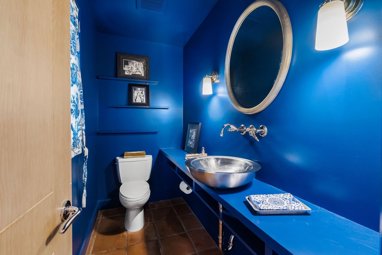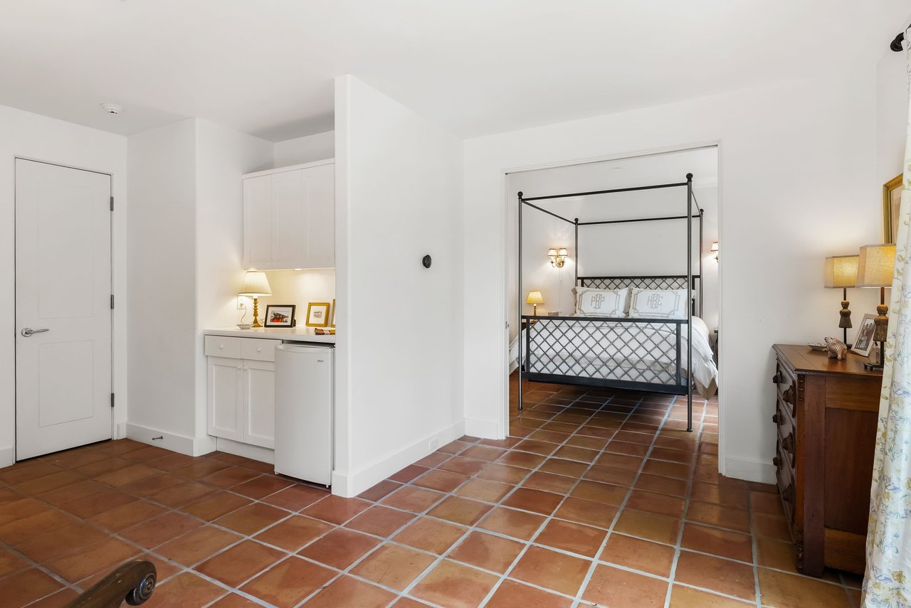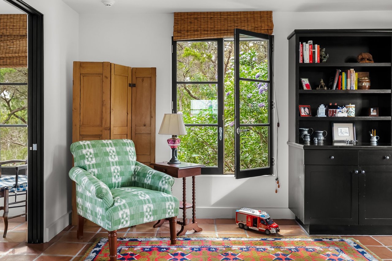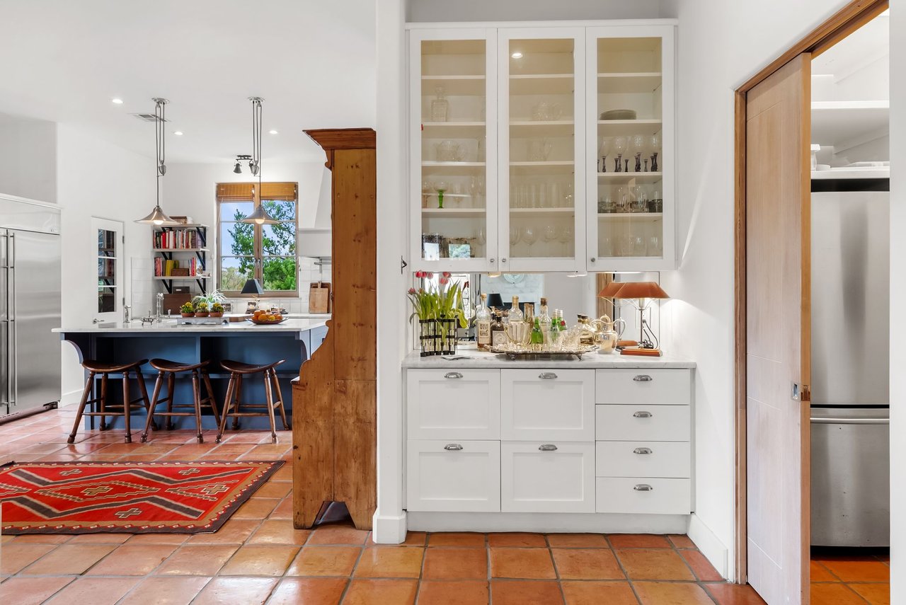 Character defines the interiors, where large windows, high wood vaulted ceilings, Saltillo floors, and French doors bring in abundant light. The upgraded kitchen boasts high-end appliances, a center island, and immaculate finishes with plenty of prep space and a well-appointed breakfast nook. Enjoy dining in the beautifully converted sunroom, then relax in the quiet den with built-in shelving and a fireplace. The main-level primary suite is a private retreat with a fireplace, exquisite marble accents, and a luxurious soaking tub.