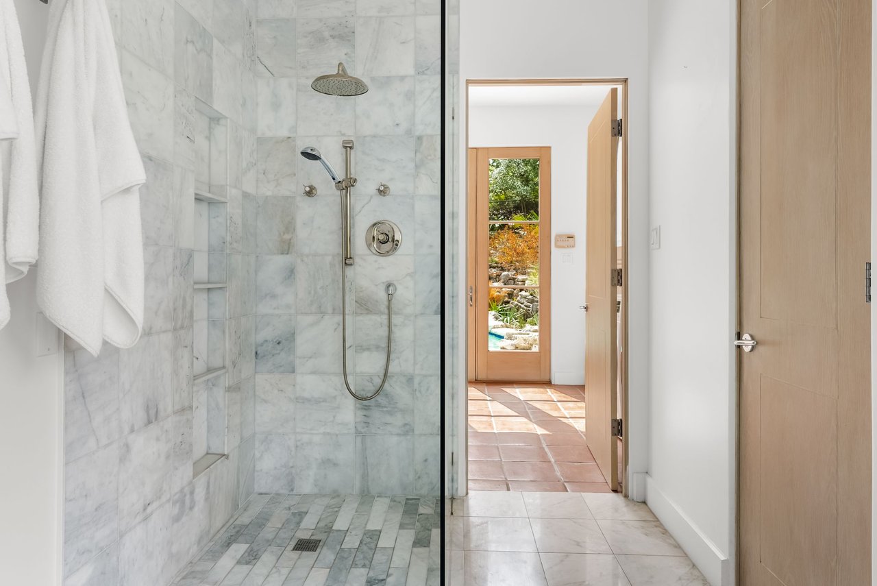Outdoors, the property is a secluded oasis with meandering pathways surrounded by the curated natural landscape with various seating areas designed that showcase the views.