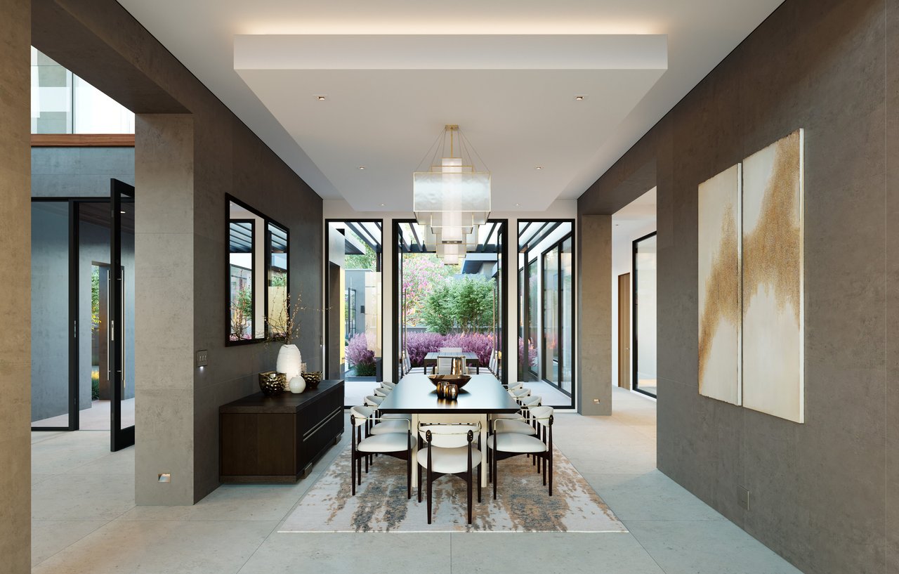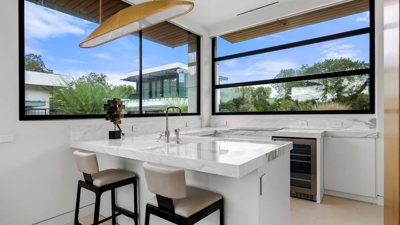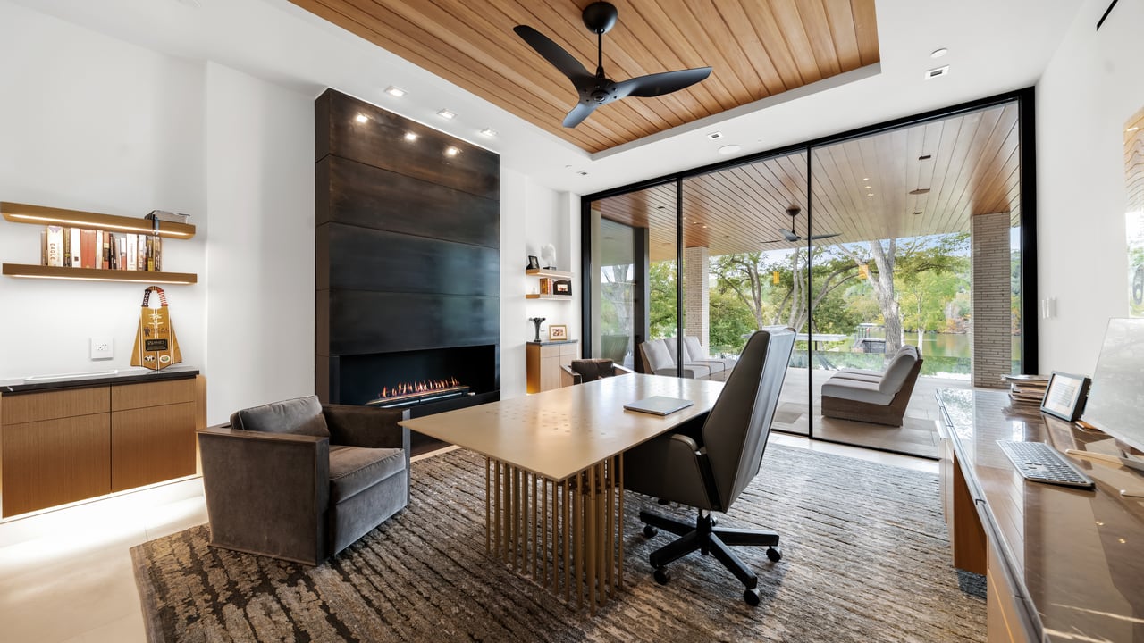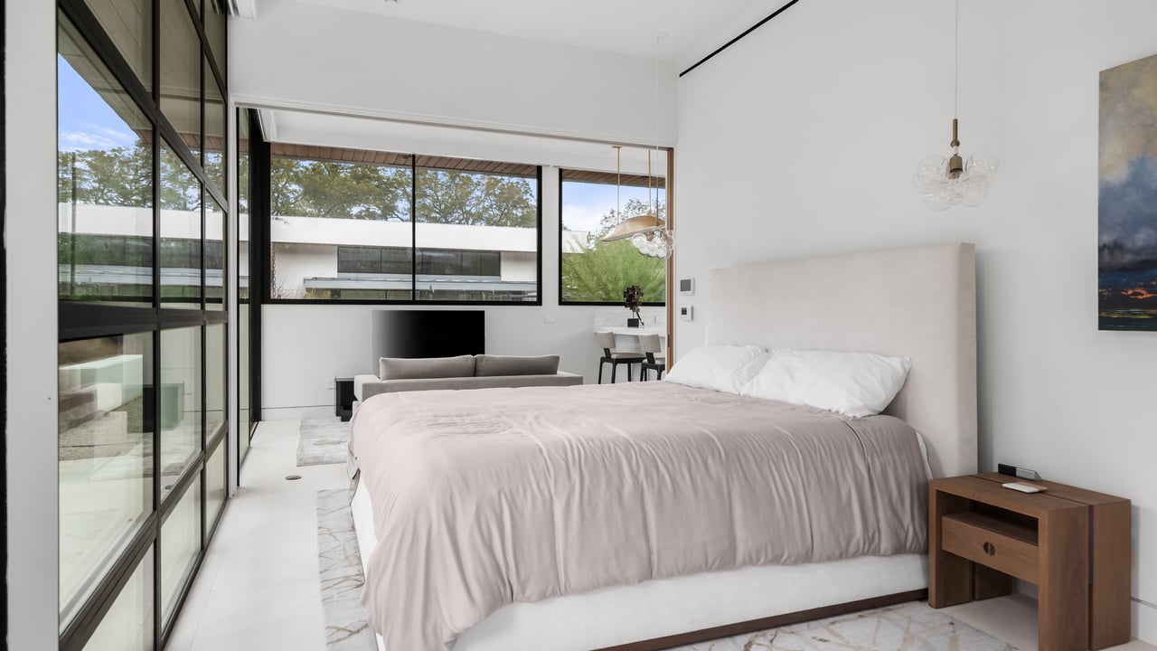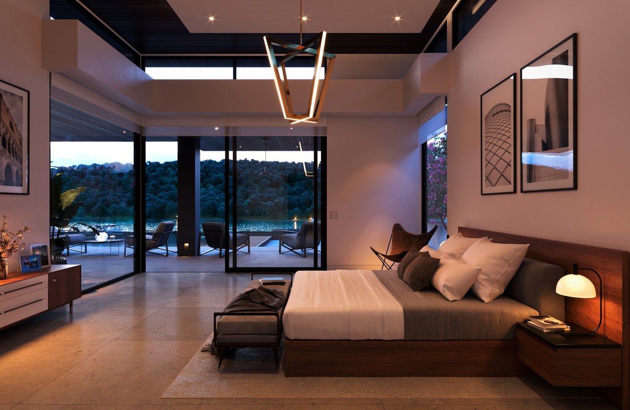 The principal estate is a masterwork of modern design and functionality, offering three bedrooms, three full and three half bathrooms, and a four-car garage. Walls of windows are a pinnacle of the home’s contemporary design. The immaculate chef’s kitchen features Gaggenau appliances, sleek cabinetry, and an impressive L-shaped island with seating. The guest house provides an additional one-bedroom, one-and-a-half-bath retreat with a full kitchen, living area, and study, while “The Treehouse” above the detached two-car garage adds another bedroom suite with a balcony and kitchenette. In the main house, plans have been created to convert the secondary office into a bedroom and to add an additional second-floor bedroom over the scullery, allowing the estate to evolve with ease. A private boat dock completes the lakefront offering.