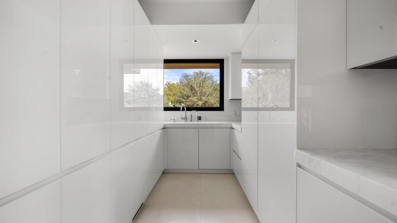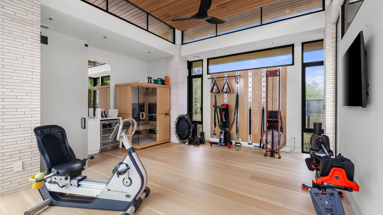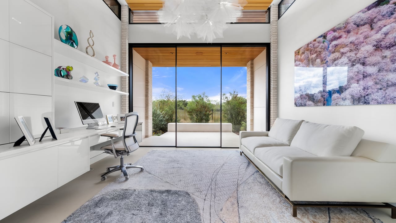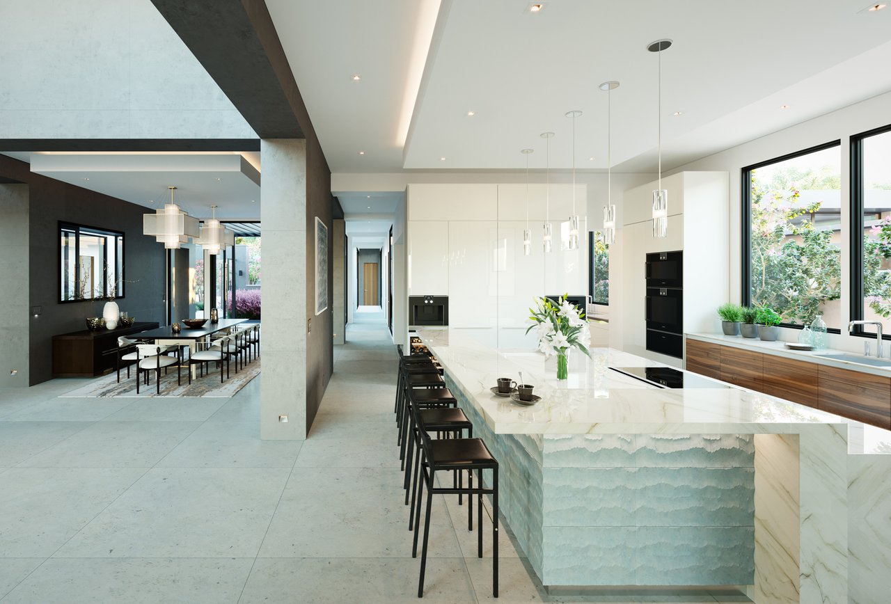 The principal estate is a masterwork of modern design and functionality, offering three bedrooms, three full and three half bathrooms, and a four-car garage. Walls of windows are a pinnacle of the home’s contemporary design. The immaculate chef’s kitchen features Gaggenau appliances, sleek cabinetry, and an impressive L-shaped island with seating. The guest house provides an additional one-bedroom, one-and-a-half-bath retreat with a full kitchen, living area, and study, while “The Treehouse” above the detached two-car garage adds another bedroom suite with a balcony and kitchenette. In the main house, plans have been created to convert the secondary office into a bedroom and to add an additional second-floor bedroom over the scullery, allowing the estate to evolve with ease. A private boat dock completes the lakefront offering.