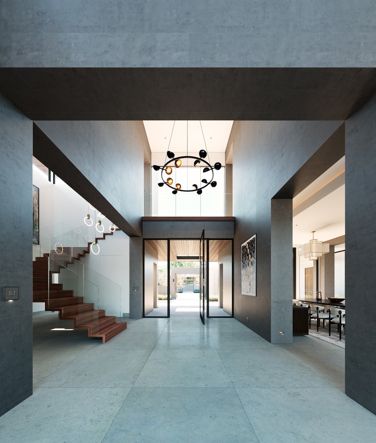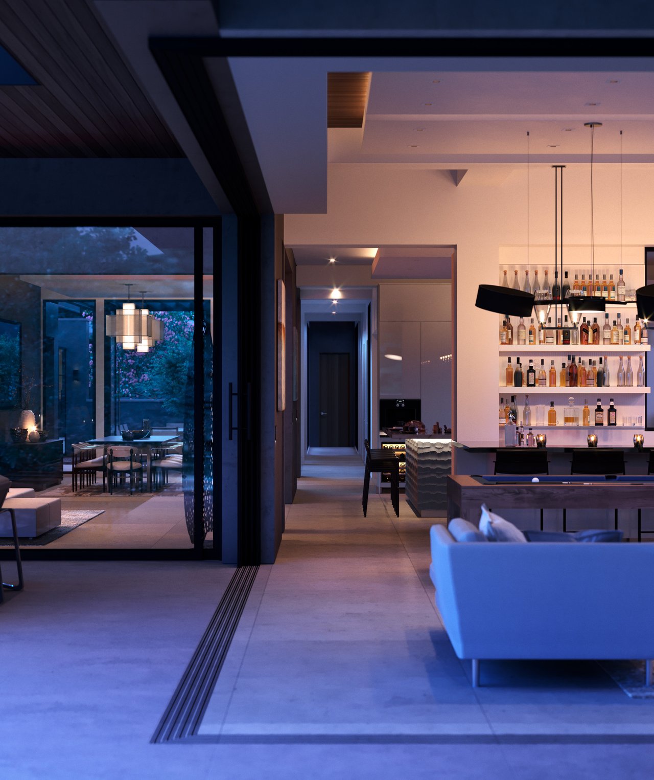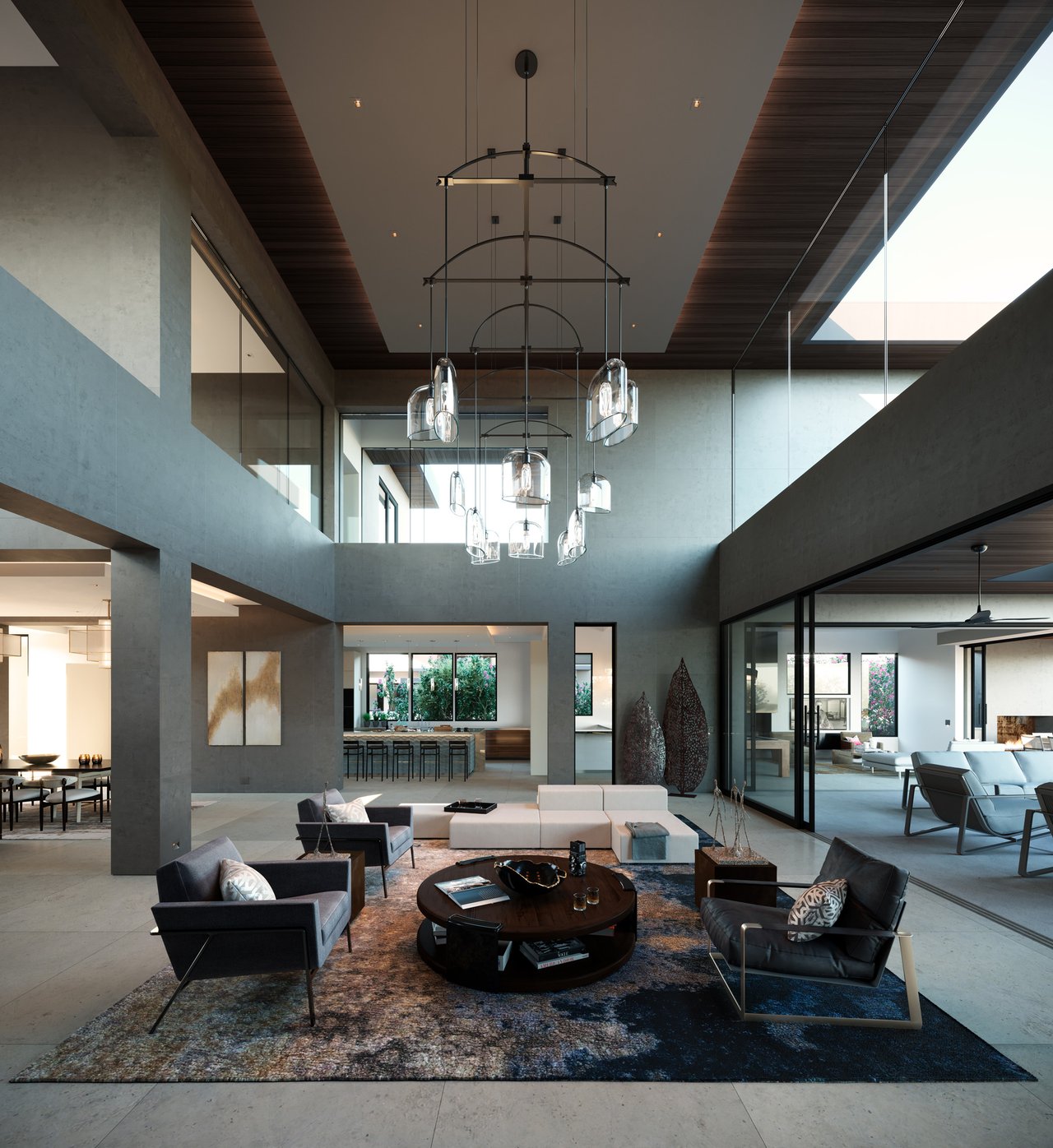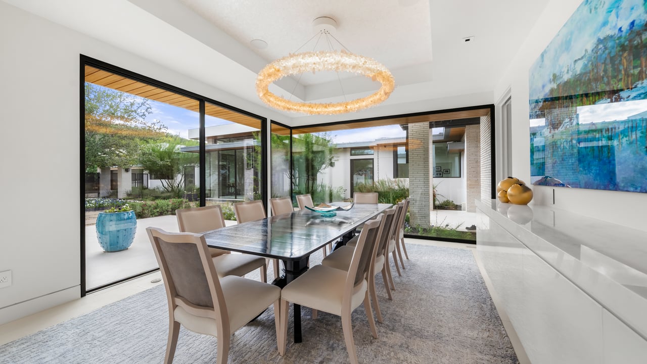 The principal estate is a masterwork of modern design and functionality, offering three bedrooms, three full and three half bathrooms, and a four-car garage. Walls of windows are a pinnacle of the home’s contemporary design. The immaculate chef’s kitchen features Gaggenau appliances, sleek cabinetry, and an impressive L-shaped island with seating. The guest house provides an additional one-bedroom, one-and-a-half-bath retreat with a full kitchen, living area, and study, while “The Treehouse” above the detached two-car garage adds another bedroom suite with a balcony and kitchenette. In the main house, plans have been created to convert the secondary office into a bedroom and to add an additional second-floor bedroom over the scullery, allowing the estate to evolve with ease. A private boat dock completes the lakefront offering.