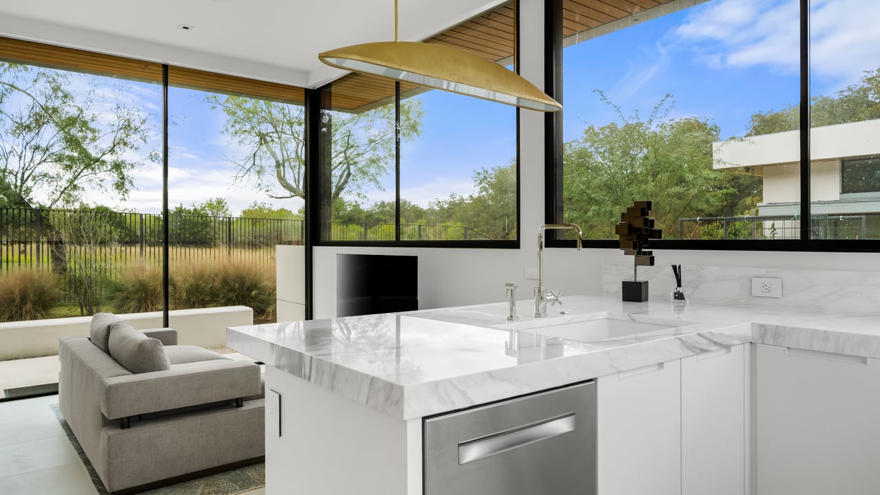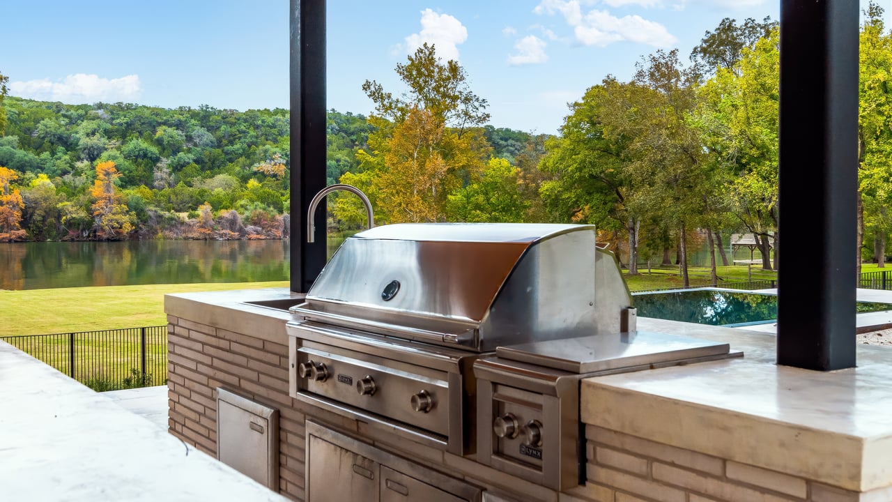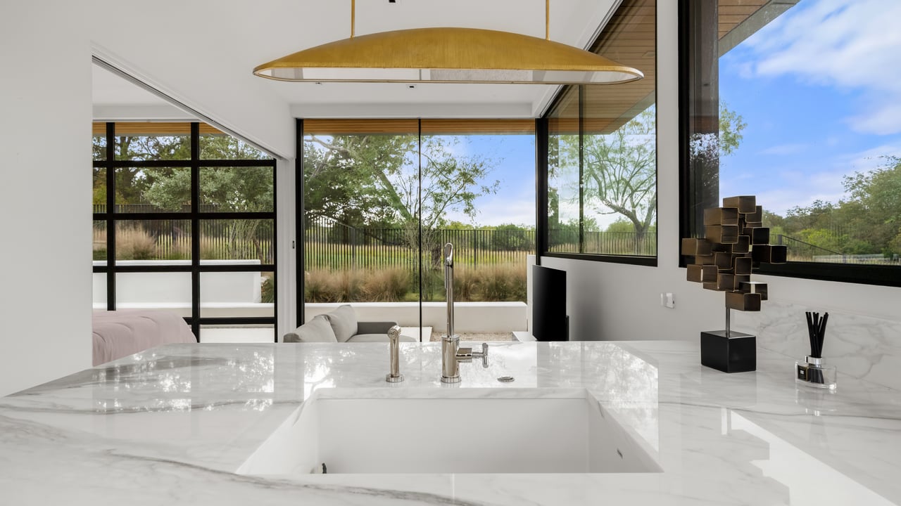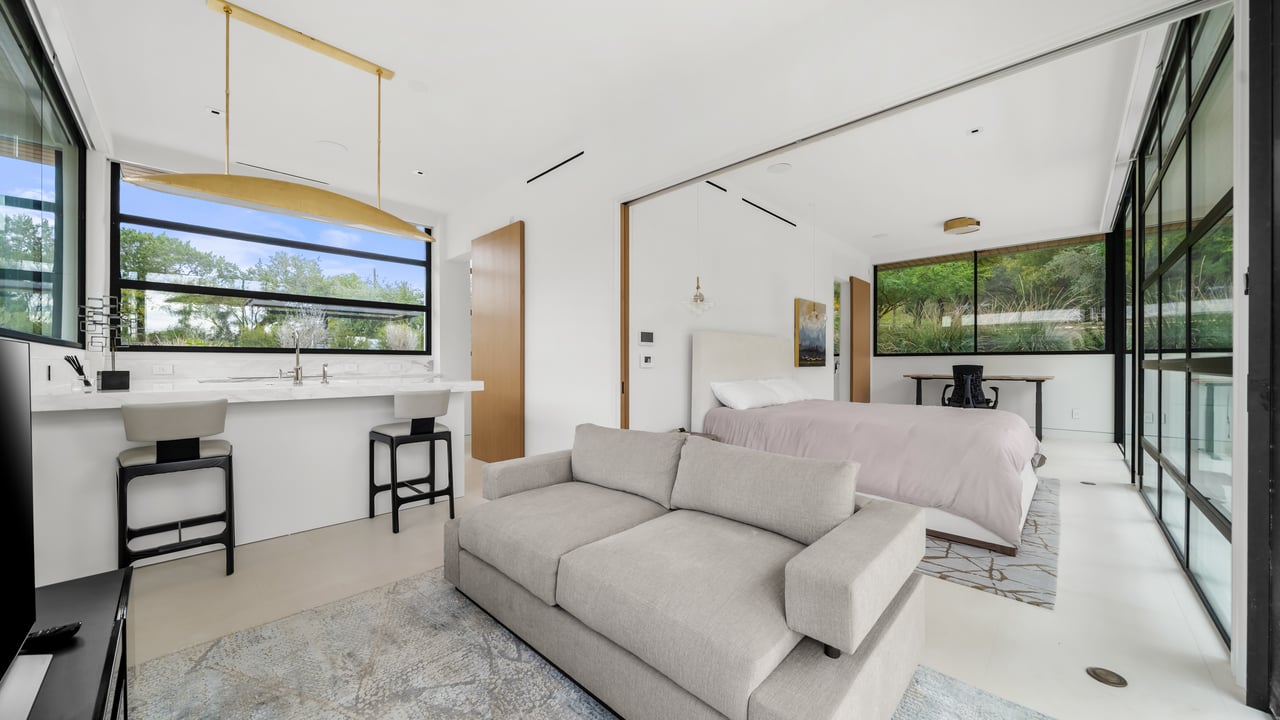 Designed to elevate the experience for guests and extended stays, the concierge home enjoys panoramic Hill Country views and a sense of complete independence. This residence features four bedrooms and three-and-a-half bathrooms, a two-car garage, and beautifully appointed interiors with high-end appliances throughout. A private courtyard with a fireplace and outdoor grilling area creates an ideal setting for entertaining, ensuring guests enjoy the same level of comfort and luxury as the main residence while maintaining their own space within the compound.