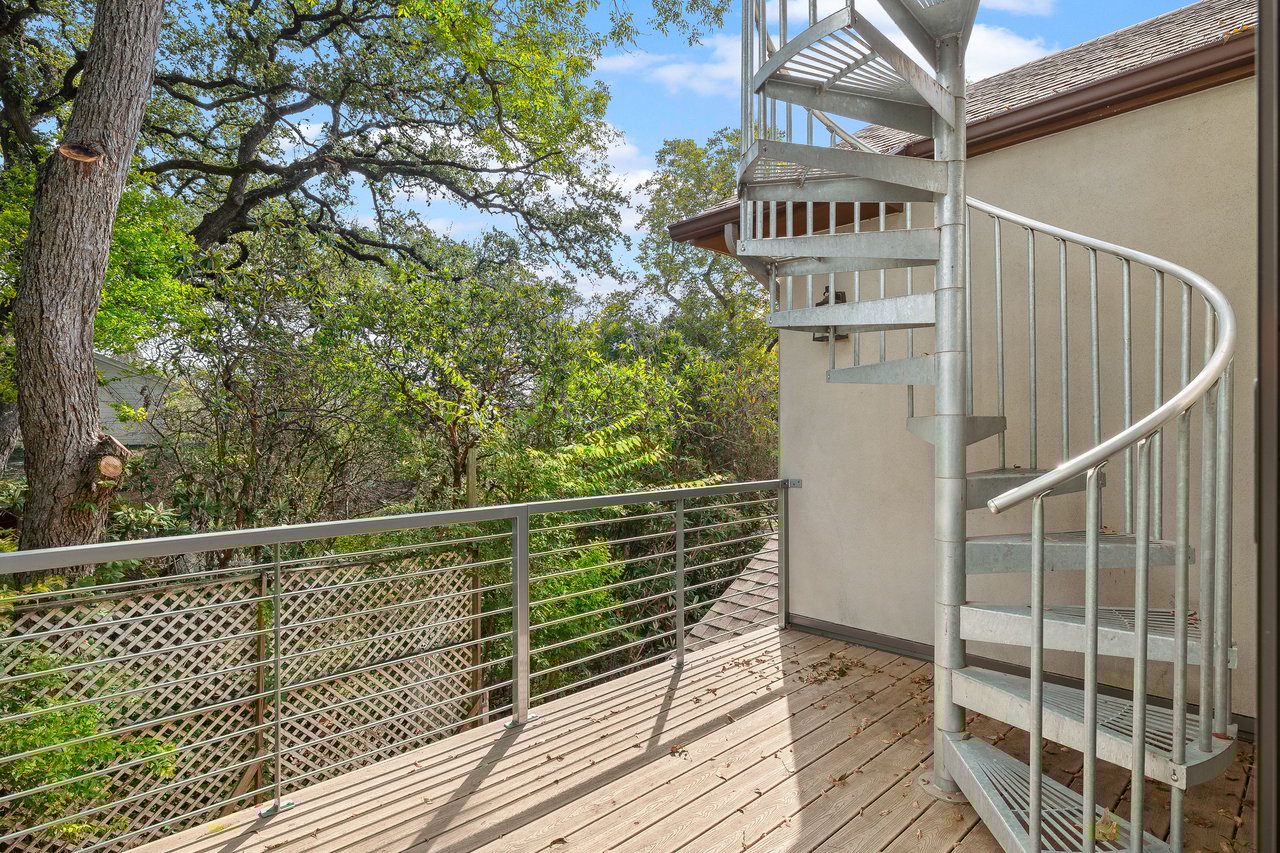 The primary retreat feels like a secluded sanctuary, complete with a private terrace, Lutron blackout shades, and a spa-inspired bathroom with dual vanities, a soaking tub, and an expansive walk-in shower with dual heads, all beneath vaulted wood ceilings. Outdoors, multiple entertaining spaces await, from the patio and built-in BBQ to the large rooftop terrace with a hot tub, offering views over the tree line. An air-conditioned detached casita with a full bathroom and living space provides flexibility for guests, a home office, or a gym. Rarely does a property combine architectural distinction, modern comfort, and exceptional outdoor living in such a premier central Austin setting.