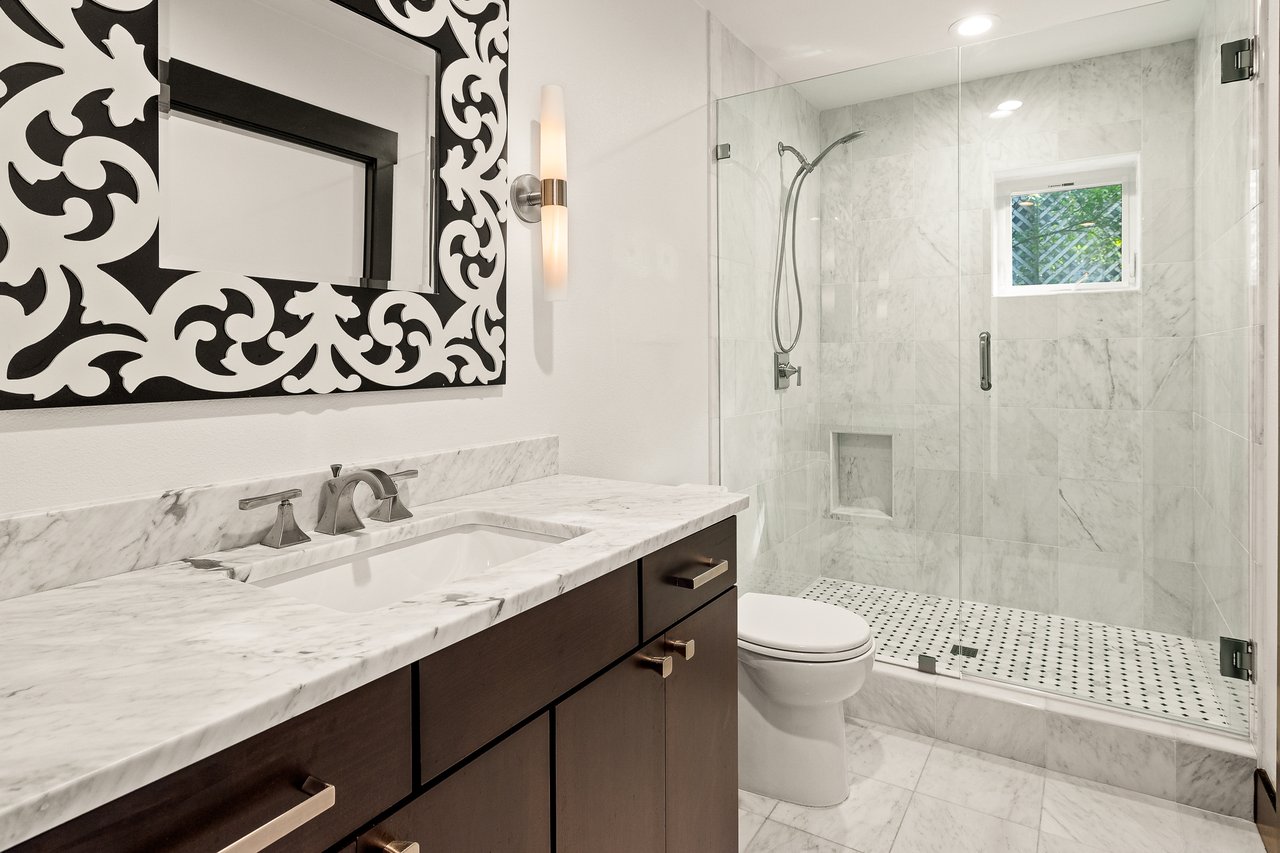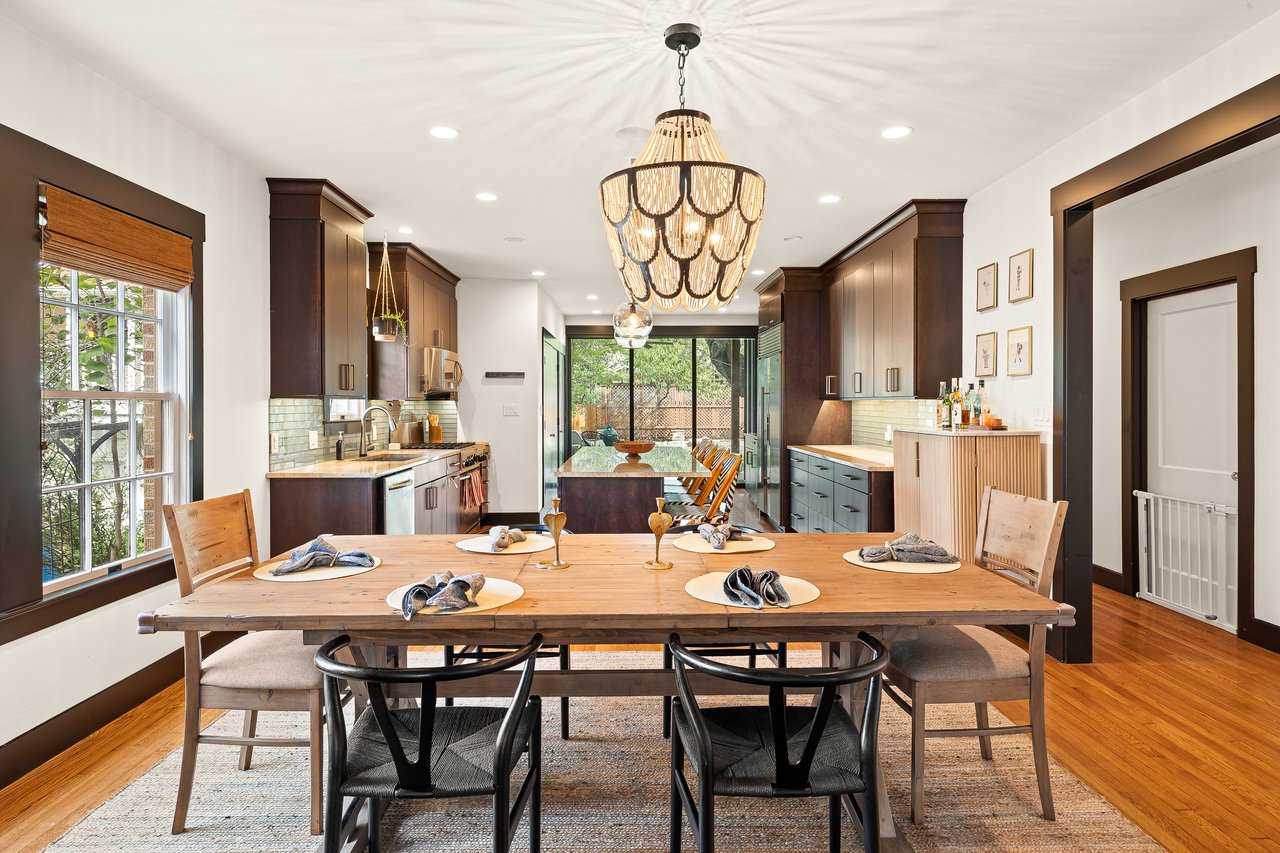 The 2014 remodel, designed by architect Steve Zagorski, added intentional updates that complement the home’s original character. Inside, bright interiors and stunning hardwood floors create a warm, inviting atmosphere. Vaulted ceilings elevate the spacious living and lounge spaces, which flow into the open kitchen and dining area, featuring a center island, stainless steel appliances, including a Sub-Zero refrigerator, stone countertops, and a sliding door that opens seamlessly to the picturesque backyard.