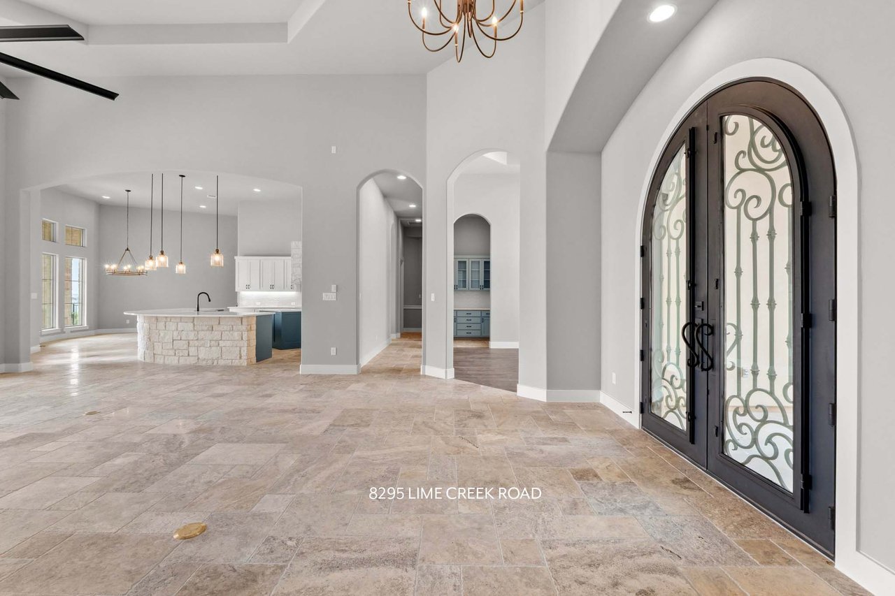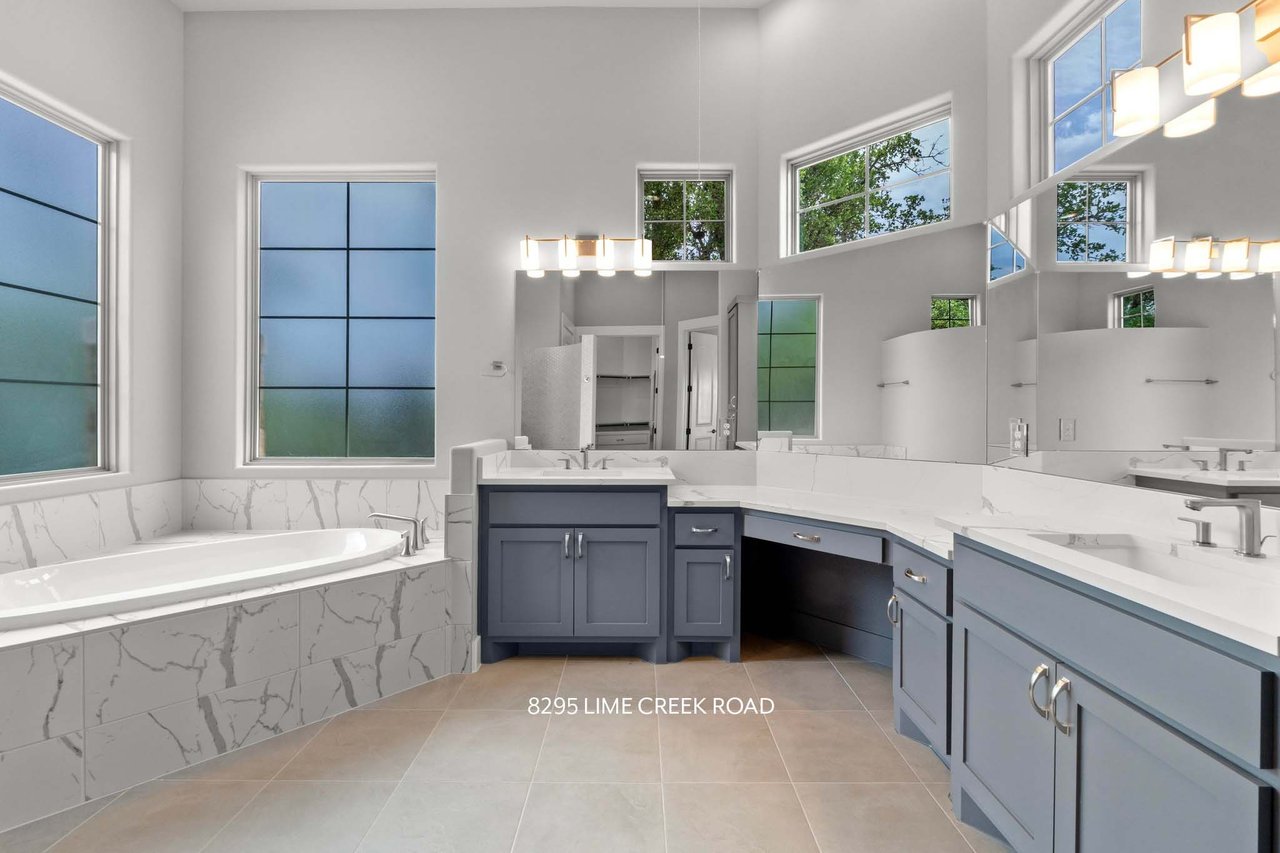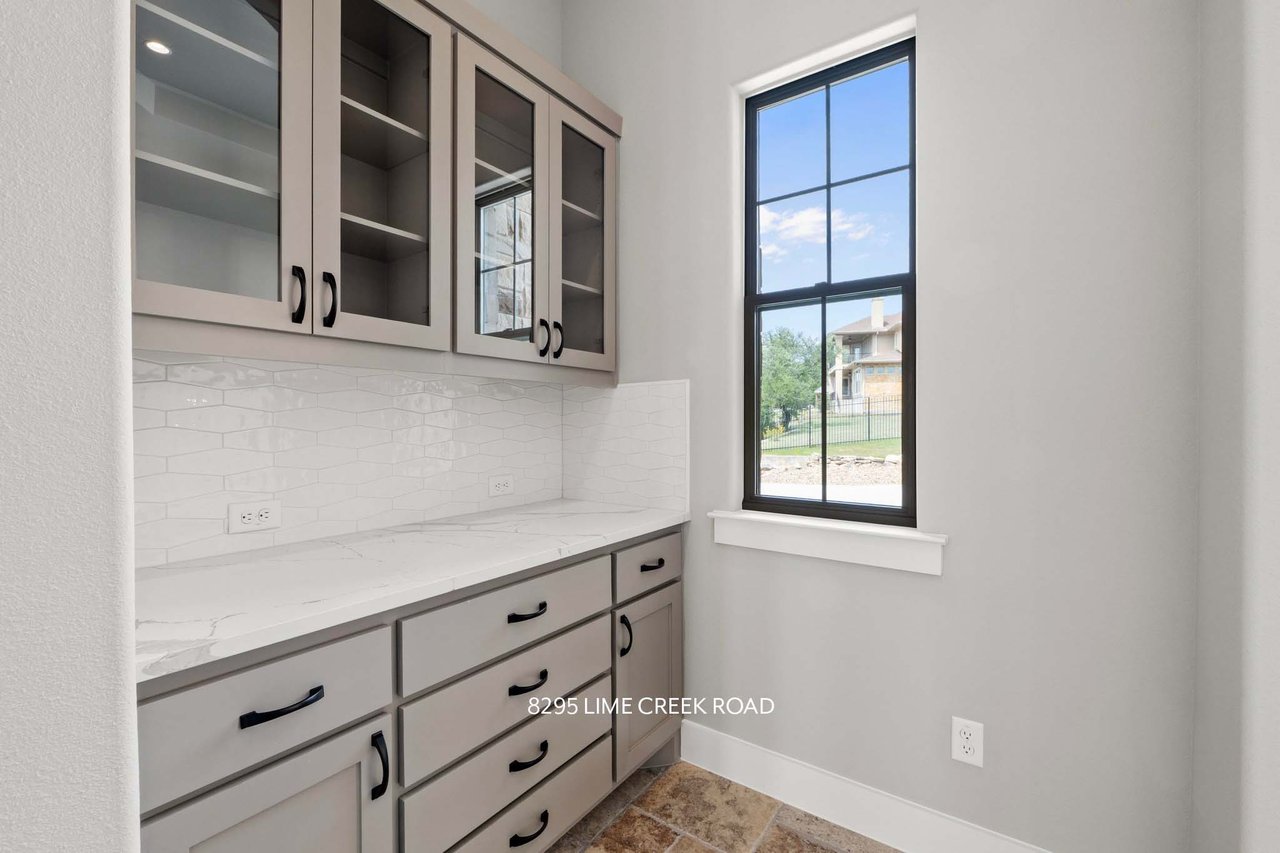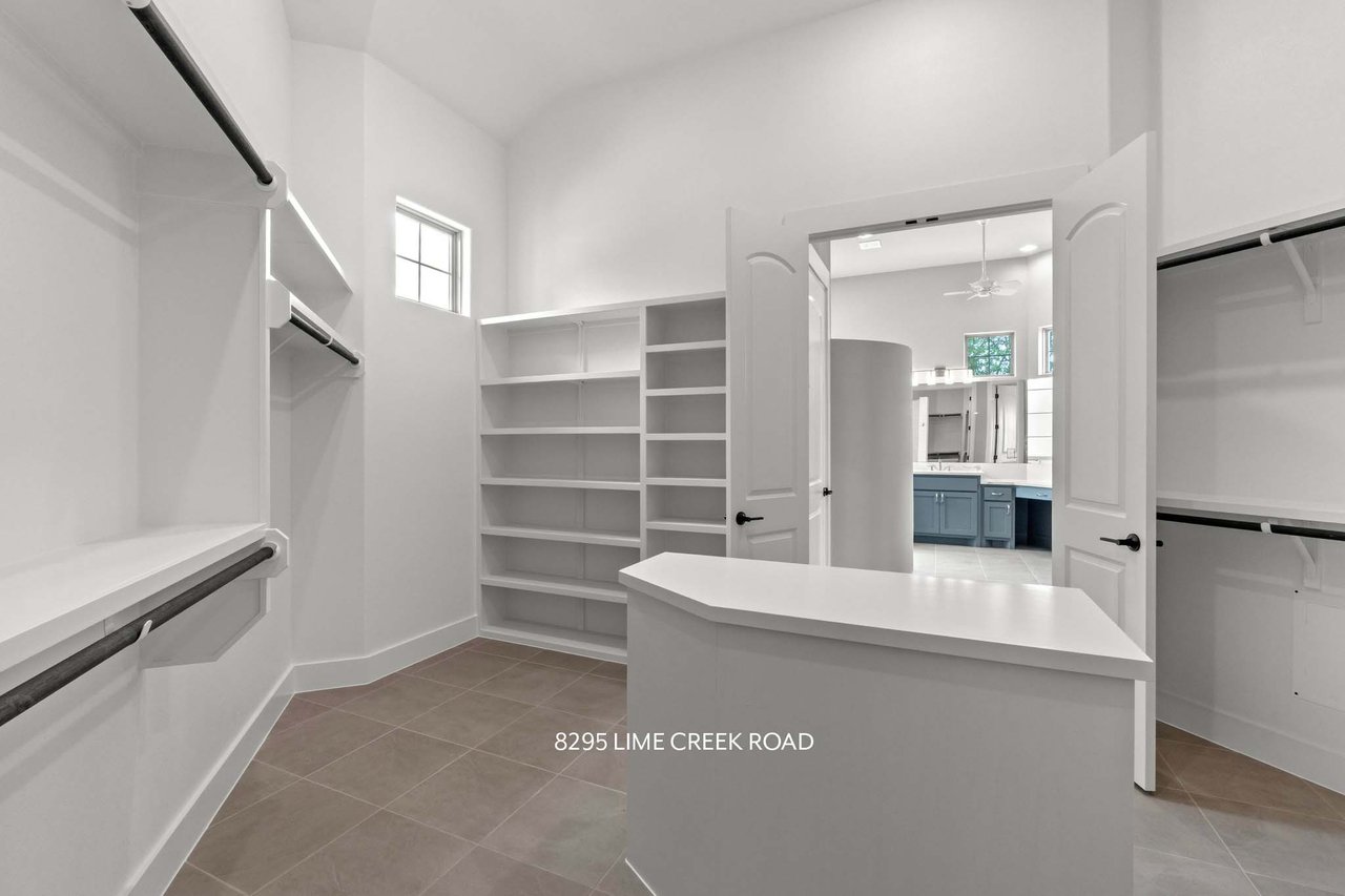 Next door sits 8295 Lime Creek Road, a newly constructed single-story residence on 7+ acres. It brings a more contemporary, rustic flair with breathtaking views of Lake Travis. Light-filled interiors feature washed limestone accents, white cabinetry, and light stone flooring, creating an airy, serene ambiance. The home includes two spacious primary suites on opposite ends, a third guest bedroom, and a dedicated study.