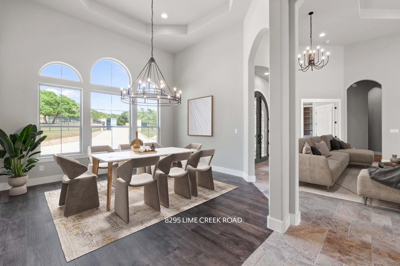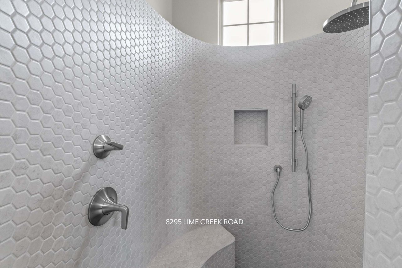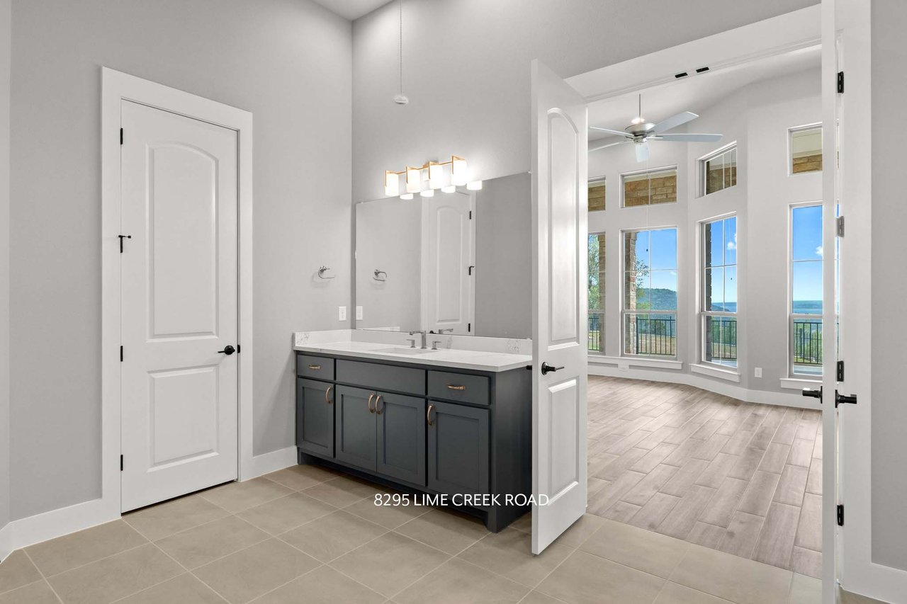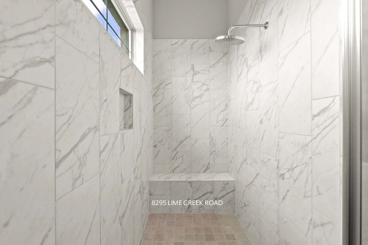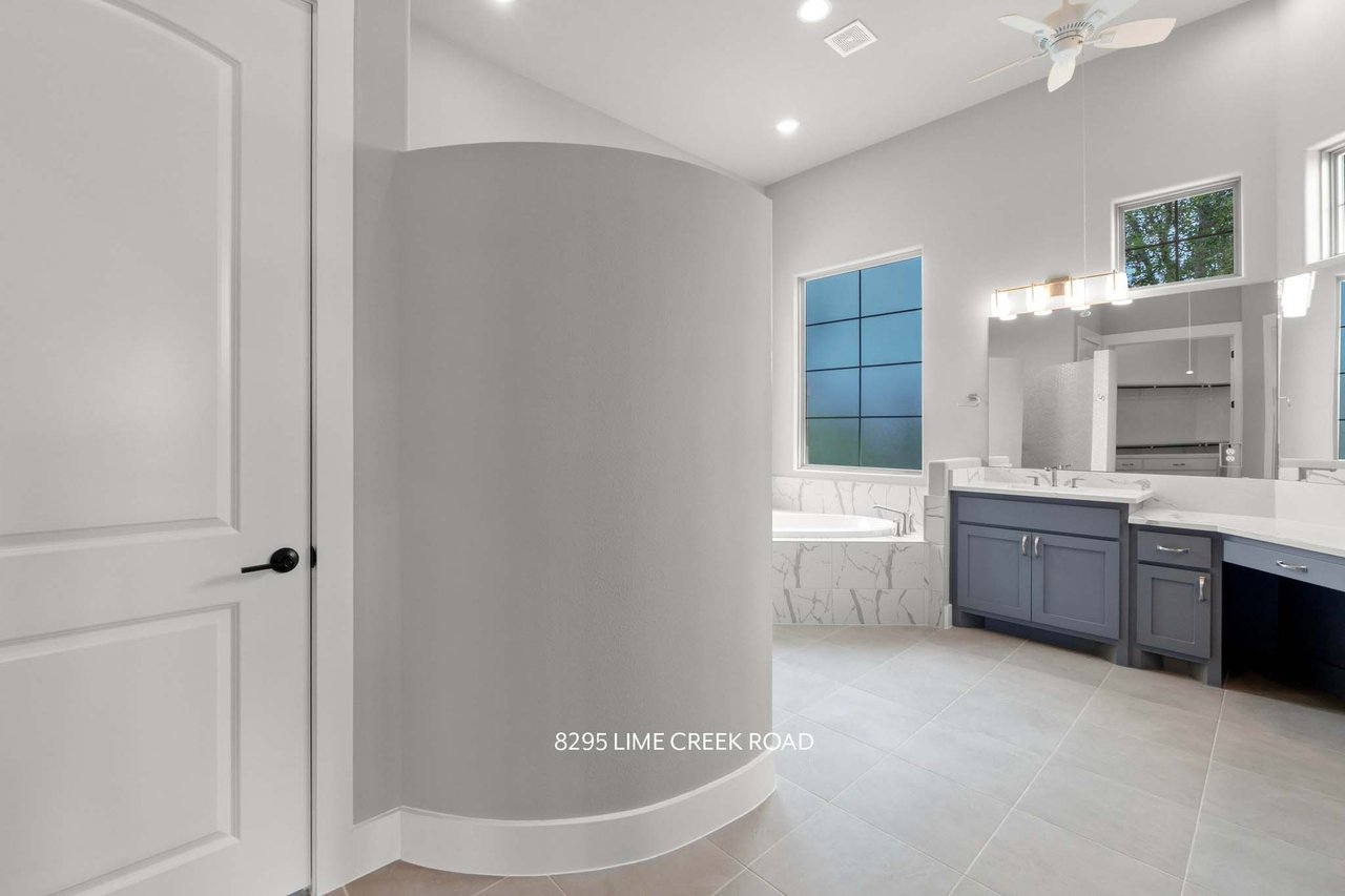 Next door sits 8295 Lime Creek Road, a newly constructed single-story residence on 7+ acres. It brings a more contemporary, rustic flair with breathtaking views of Lake Travis. Light-filled interiors feature washed limestone accents, white cabinetry, and light stone flooring, creating an airy, serene ambiance. The home includes two spacious primary suites on opposite ends, a third guest bedroom, and a dedicated study.