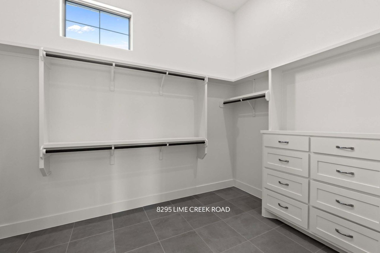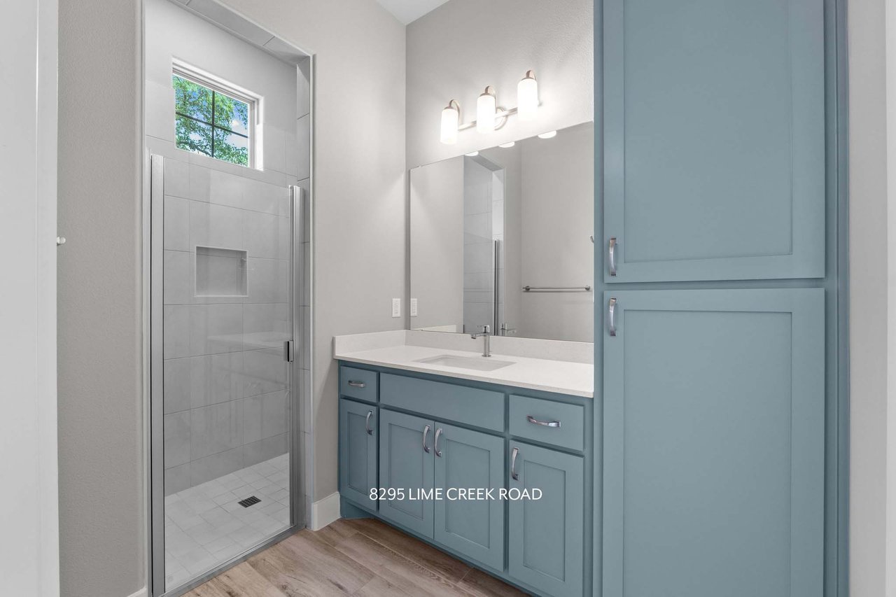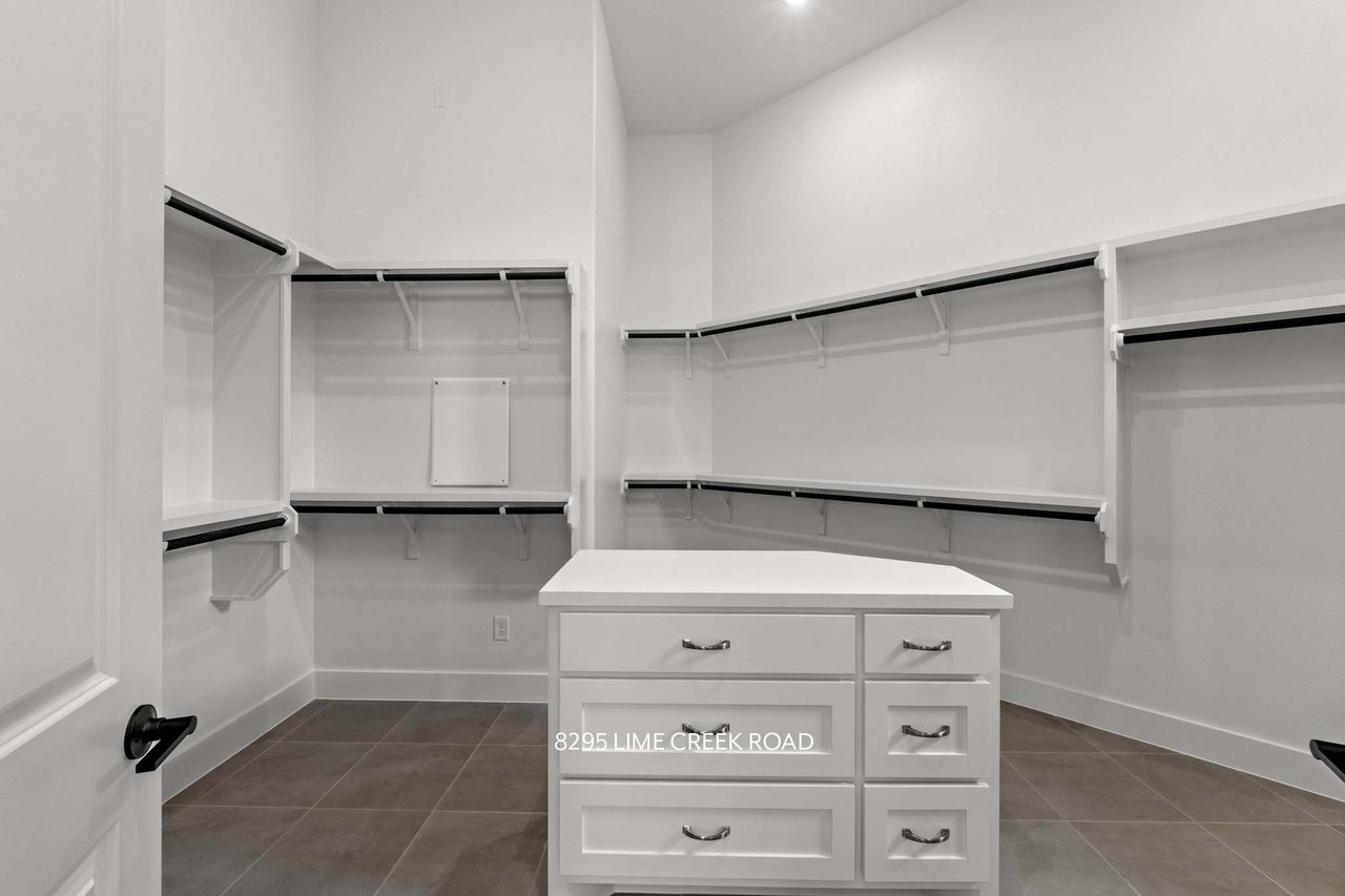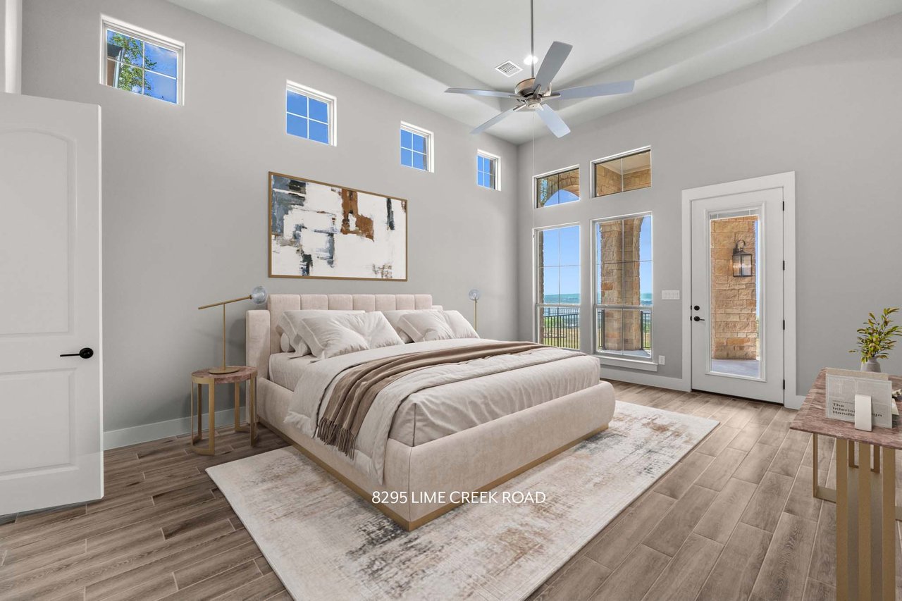 Next door sits 8295 Lime Creek Road, a newly constructed single-story residence on 7+ acres. It brings a more contemporary, rustic flair with breathtaking views of Lake Travis. Light-filled interiors feature washed limestone accents, white cabinetry, and light stone flooring, creating an airy, serene ambiance. The home includes two spacious primary suites on opposite ends, a third guest bedroom, and a dedicated study.