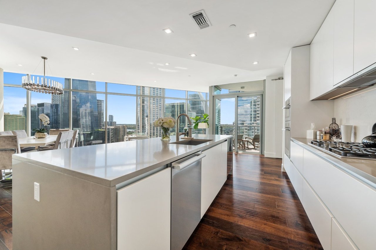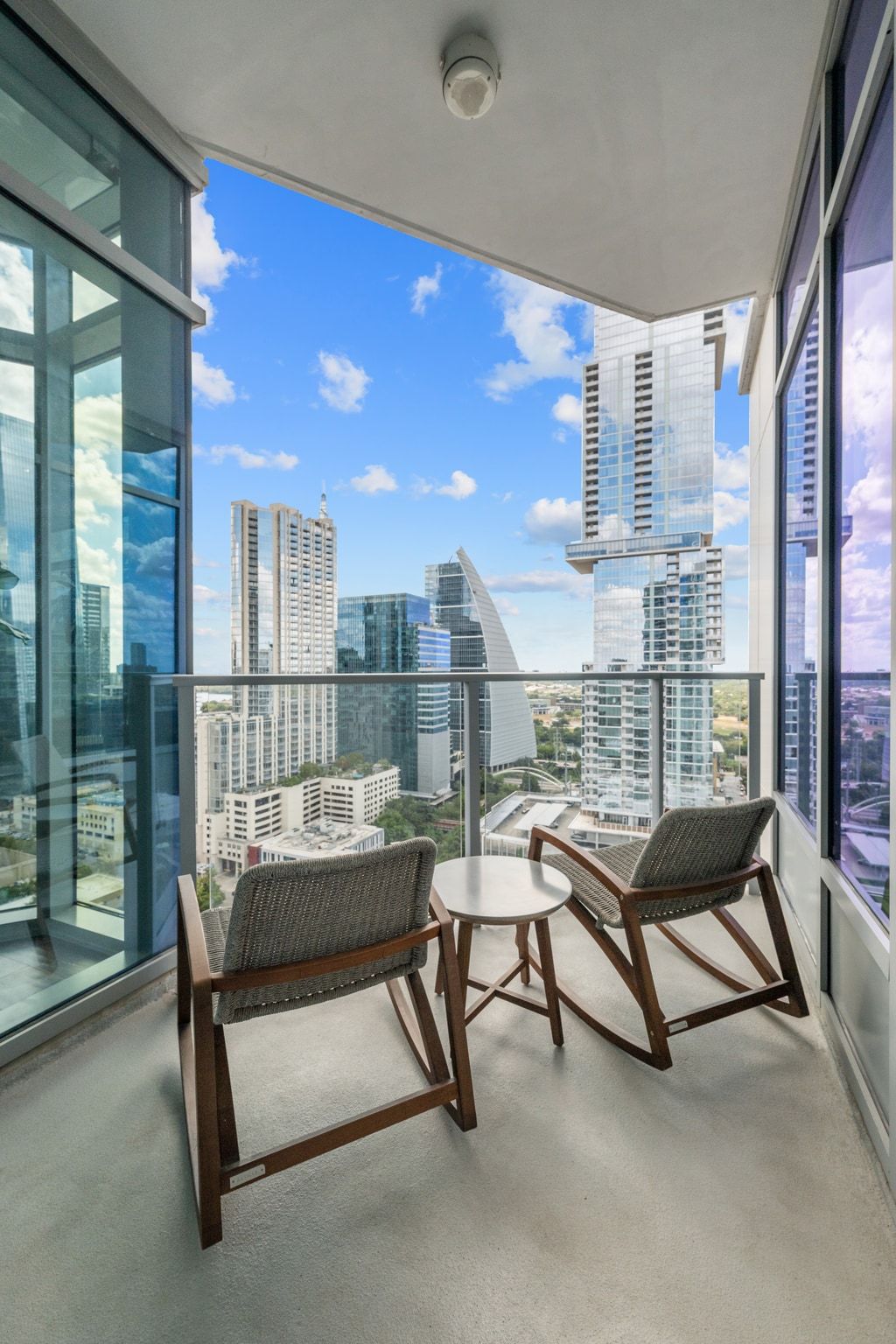 The pristine kitchen features high-end stainless-steel appliances, a wine cooler, a breakfast bar, and stunning skyline vistas that transform cooking into a memorable experience. The primary suite is a private retreat, complete with a sitting room that could serve as an office with dramatic downtown views. The spa-inspired en-suite bath offers dual vanities, stone countertops, a soaking tub, and a glass-enclosed shower. A junior primary suite includes its own private terrace and a luxurious en-suite bath. All three bedrooms conveniently offer walk-in closets and en-suite bathrooms. There is also a well-appointed laundry room in the unit.