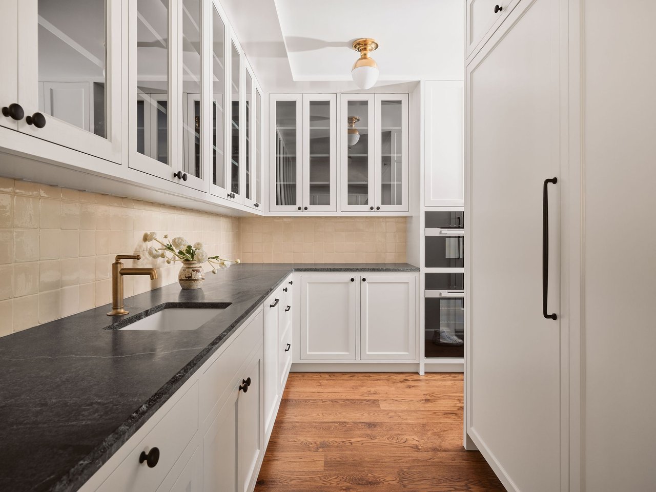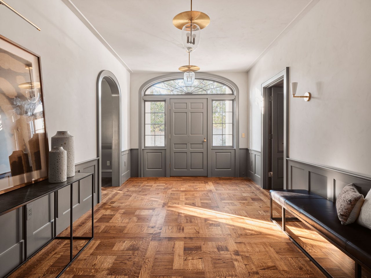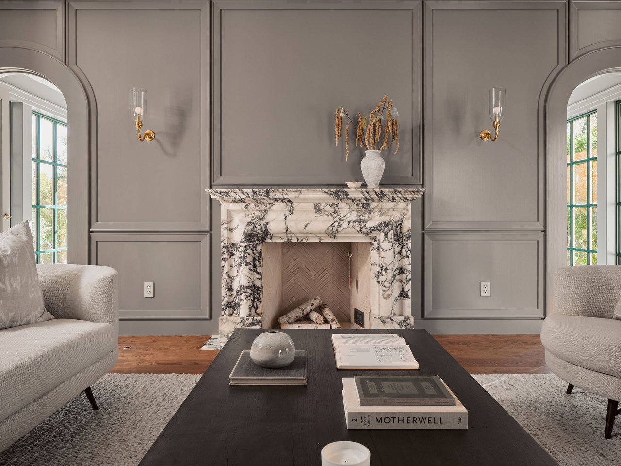 The interior is thoughtfully designed by the architects and expertly crafted by Koch Construction to reflect a respect for tradition, with exquisite millwork and luxurious details not often seen in today’s modern homes. Herringbone oak and brick floors, creamy marble on fireplace surrounds and counters, and intricate leaded-glass windows are viewed through arched doorways to lend every space a sense of grace and elegance. Flooded with light, rooms feel both timeless and fresh. The expansive living and dining rooms offer space for refined entertaining on a large scale, complemented by intimate places for quiet conversation. The floorplan offers features such as a sunlit solarium, paneled library, playroom and a screening room/bar. This is a home that will stand the test of time; its refined design and meticulous craftsmanship providing shelter and joy for generations to come.